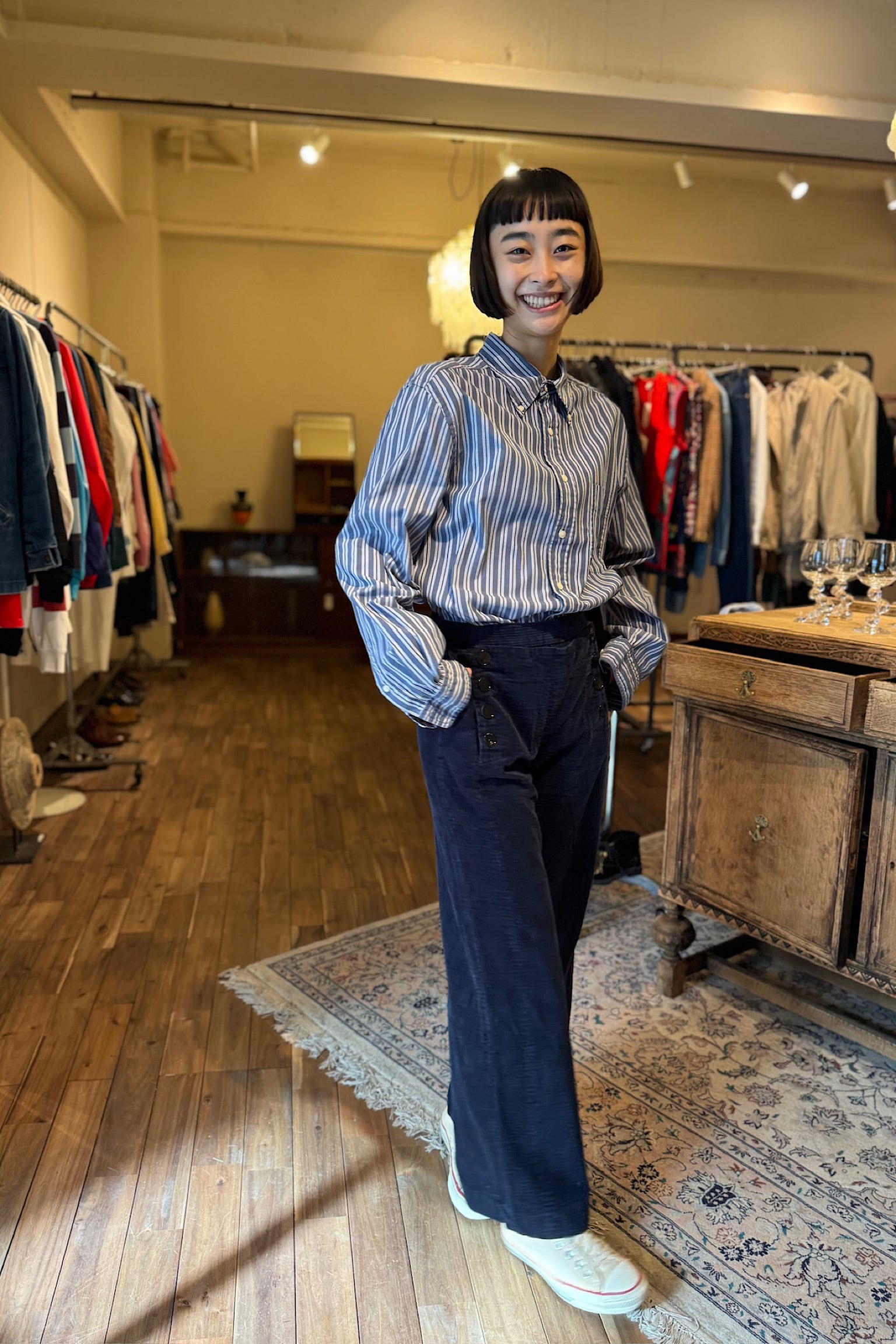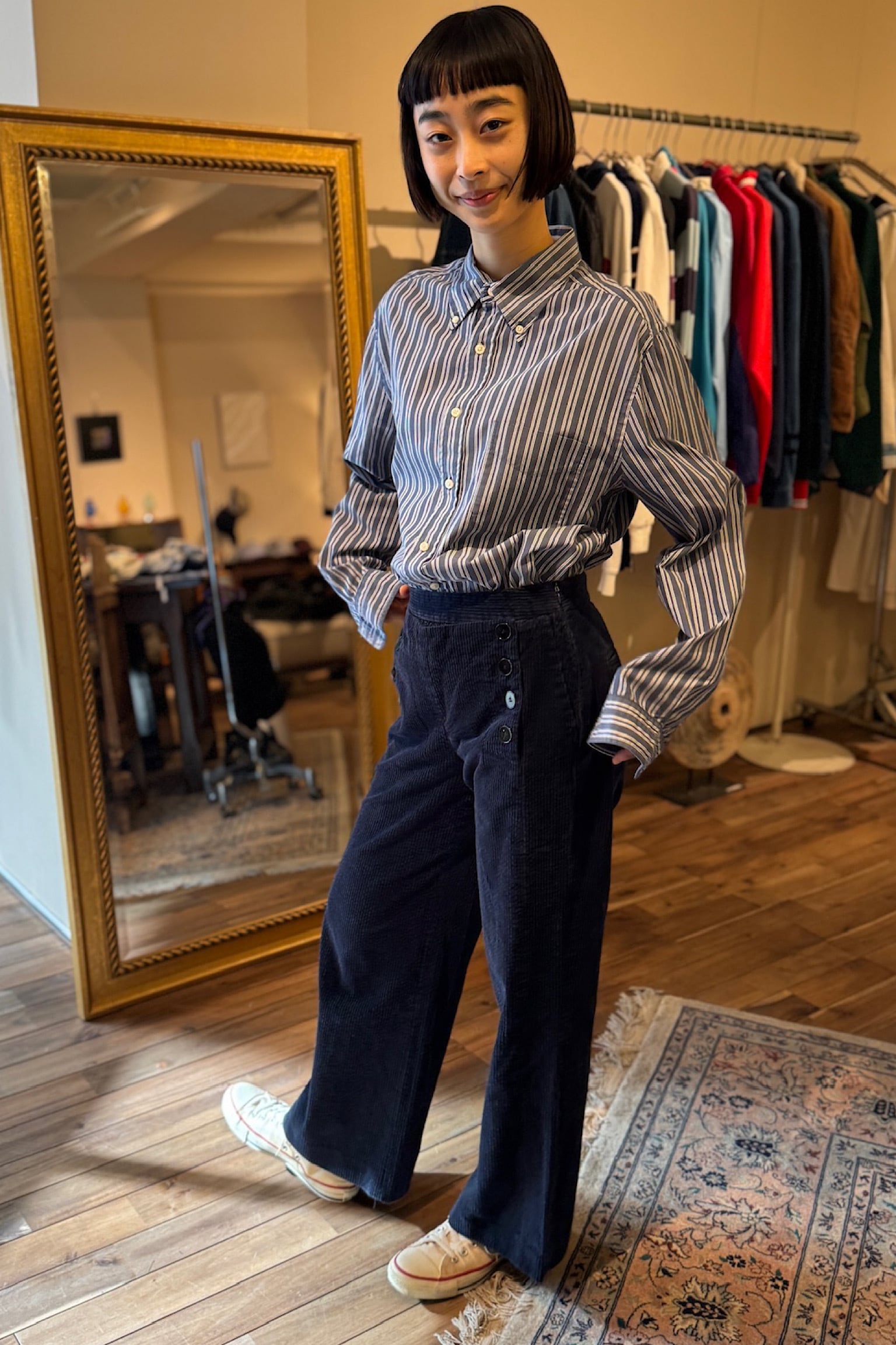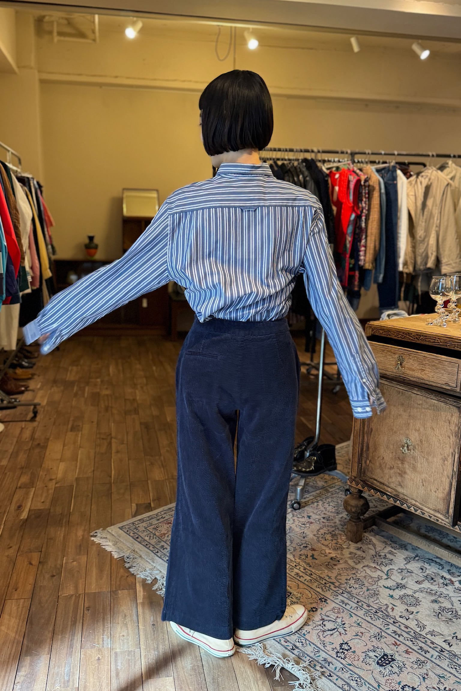 ブルーネイビーのストライプシャツ。