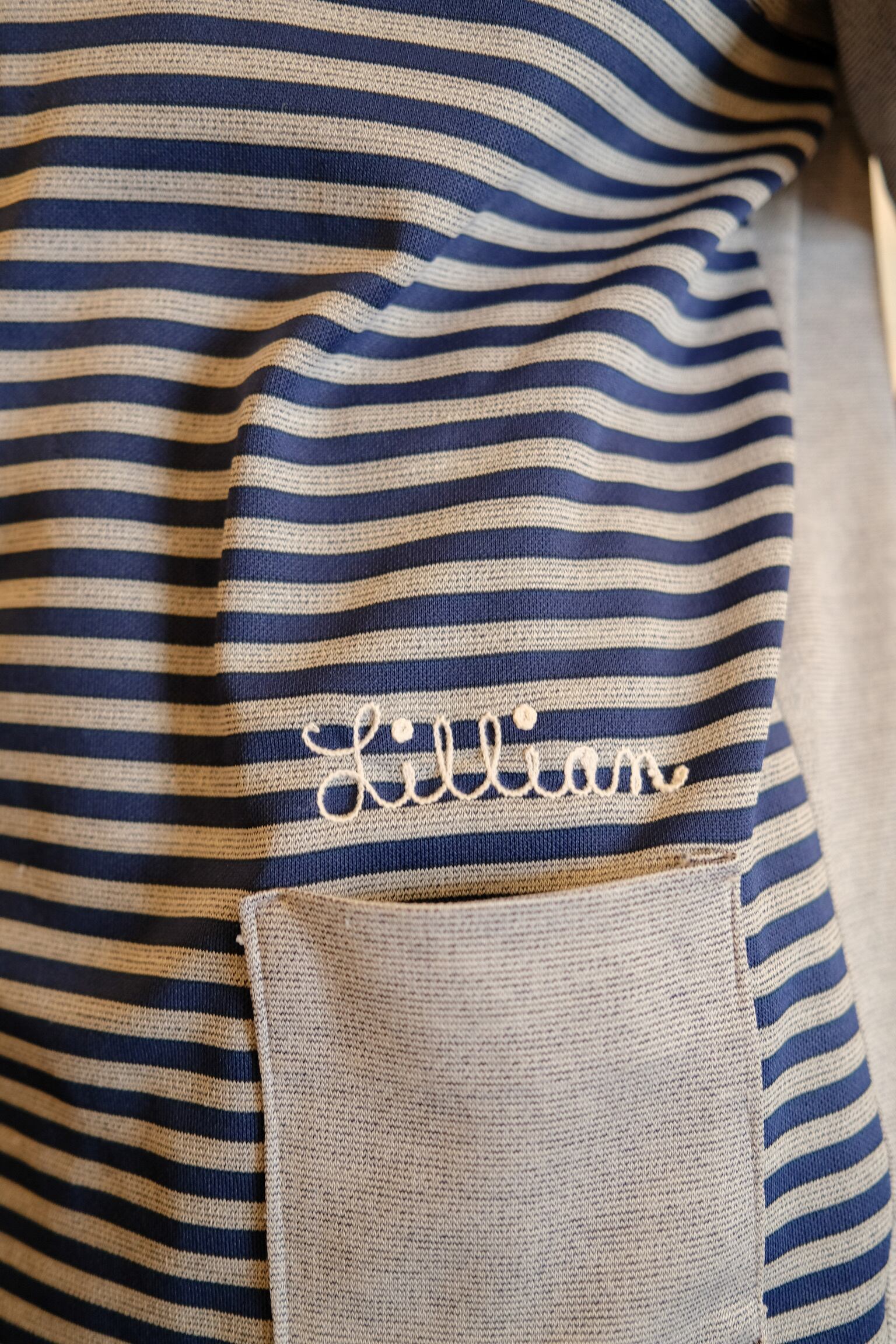 フロントのポケットの所には所有者の名前が刺繍されています。