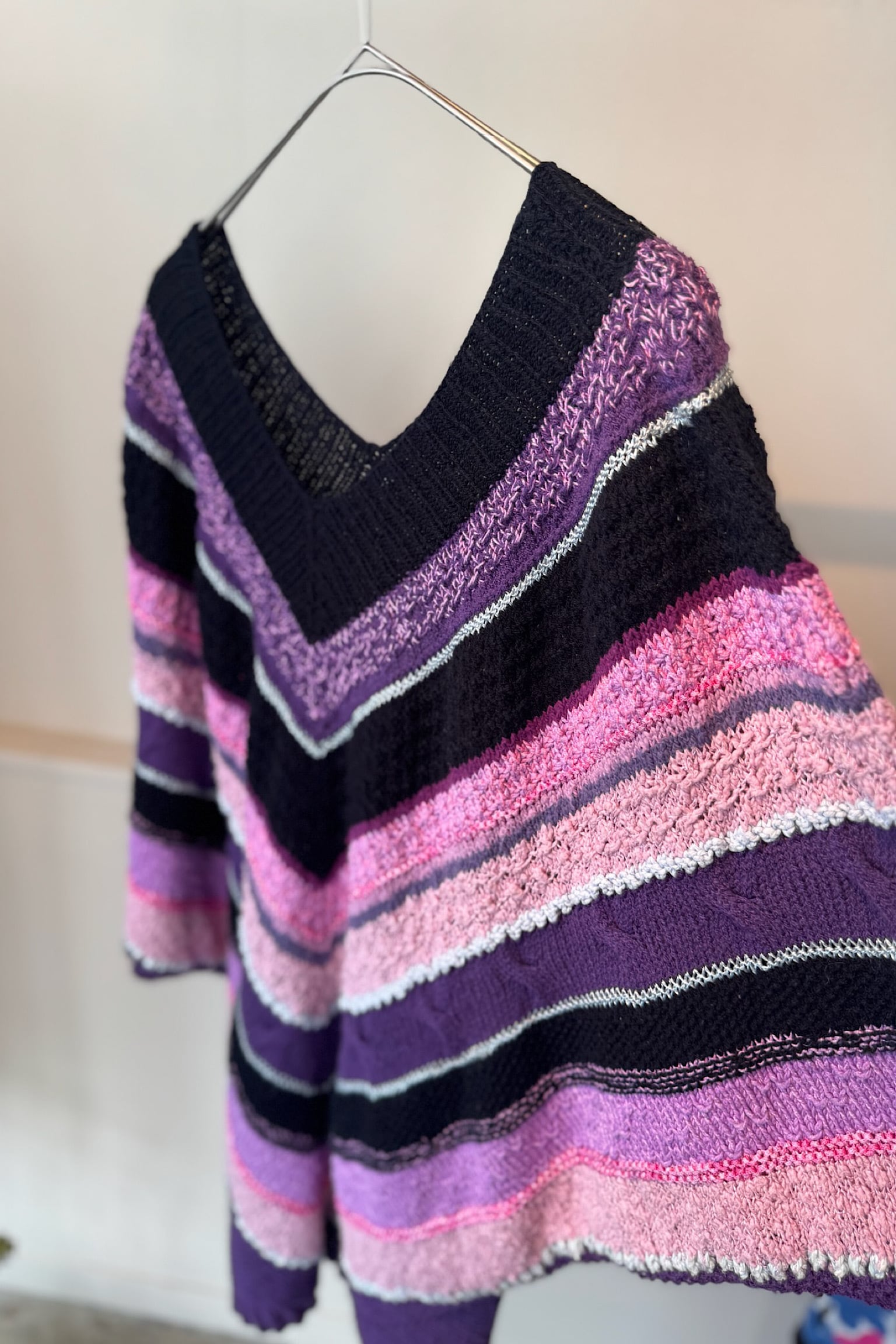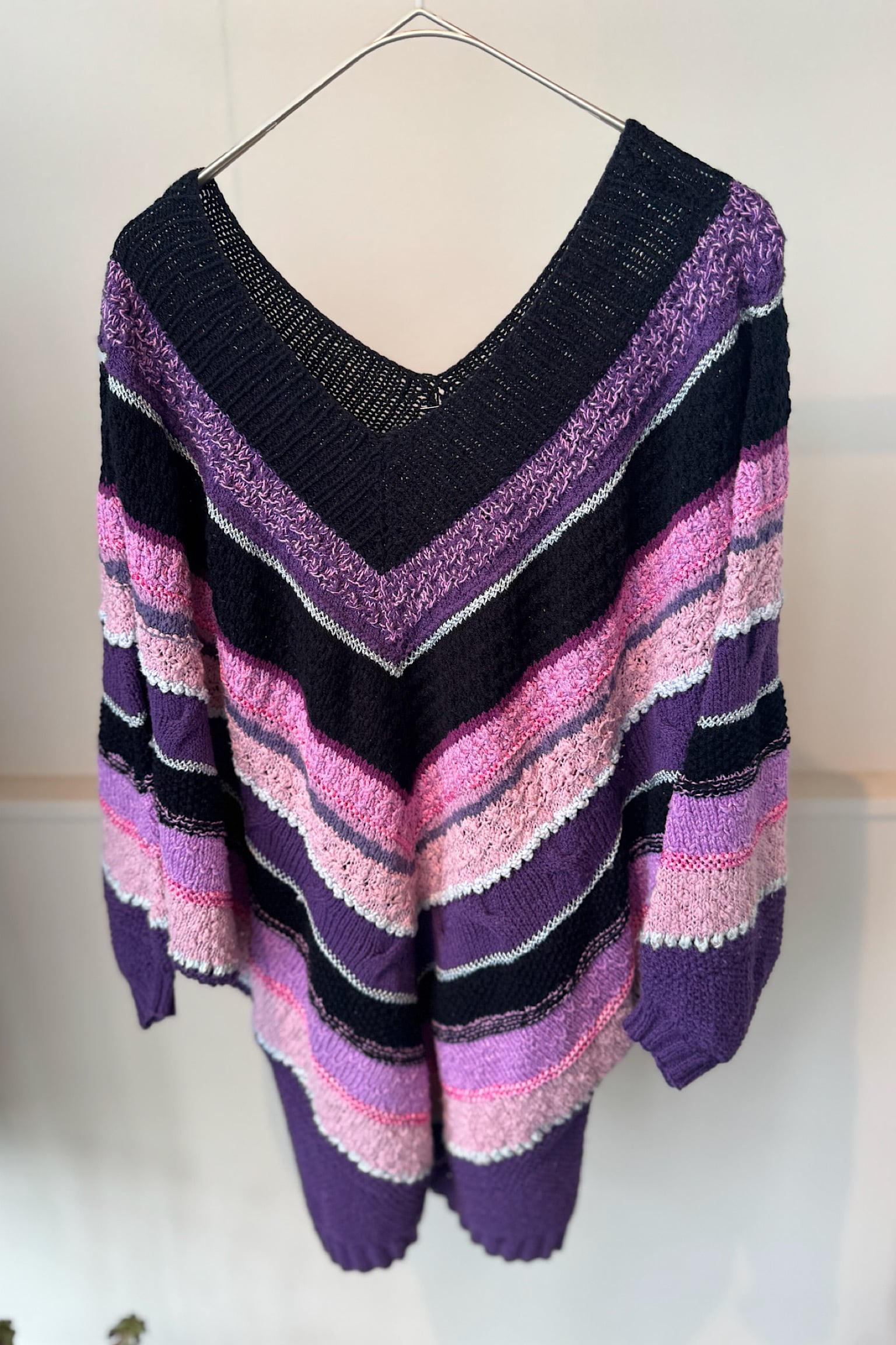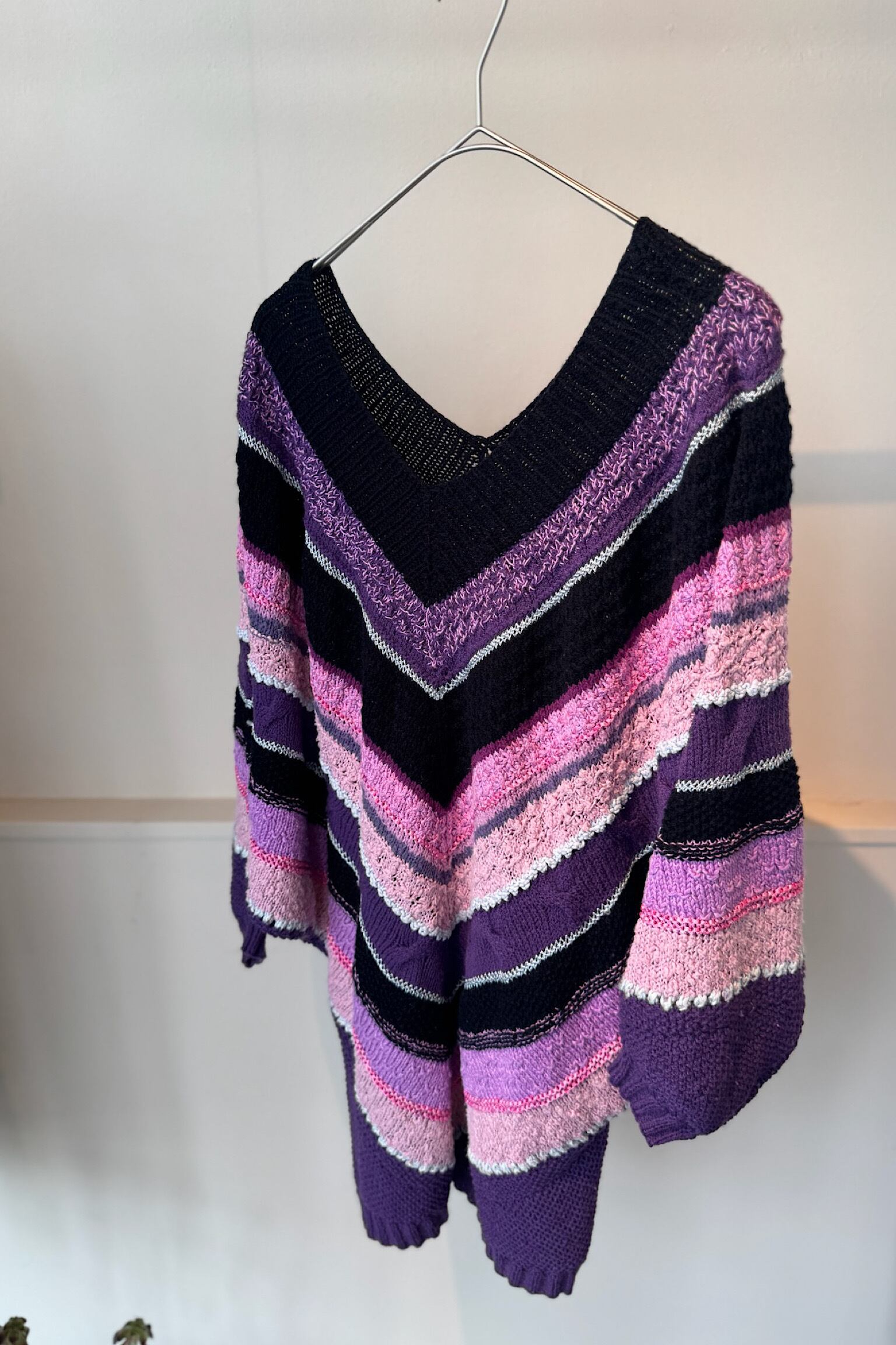 色鮮やかな配色が目を引くハンドメイドポンチョニットは、あなたのコーディネートにアクセントを加えるアイテムです。柔らかなピンクとパープルのバランスが絶妙で、Vネックデザイン が顔周りをすっきりと見せてくれます。