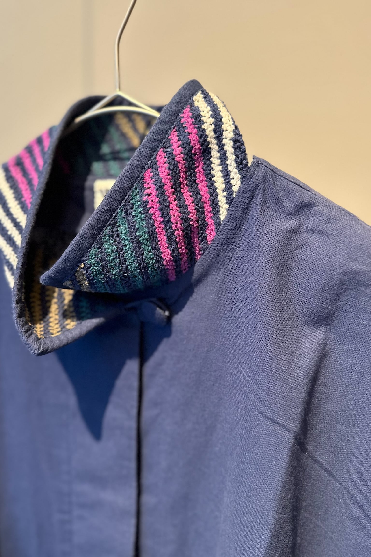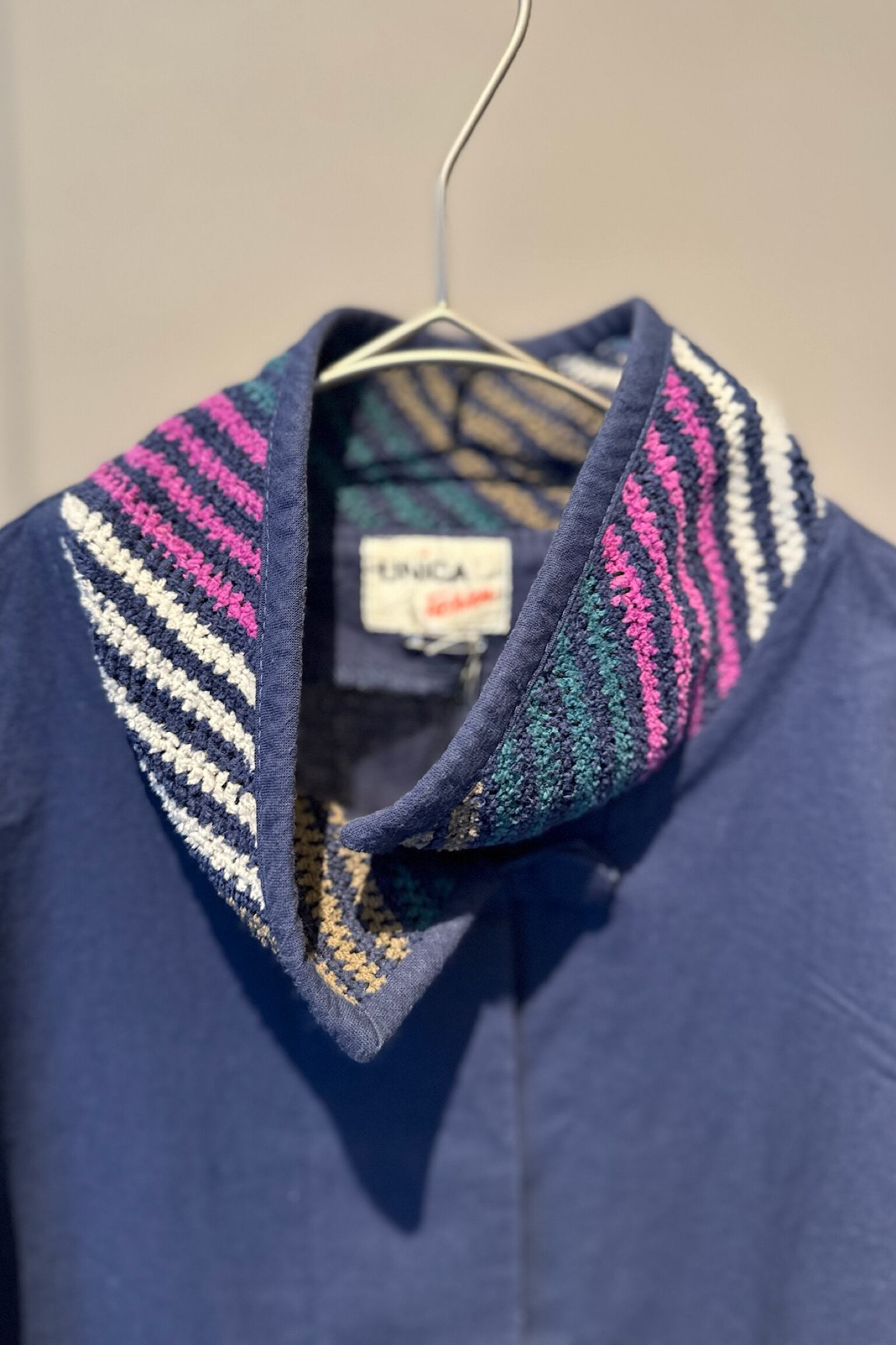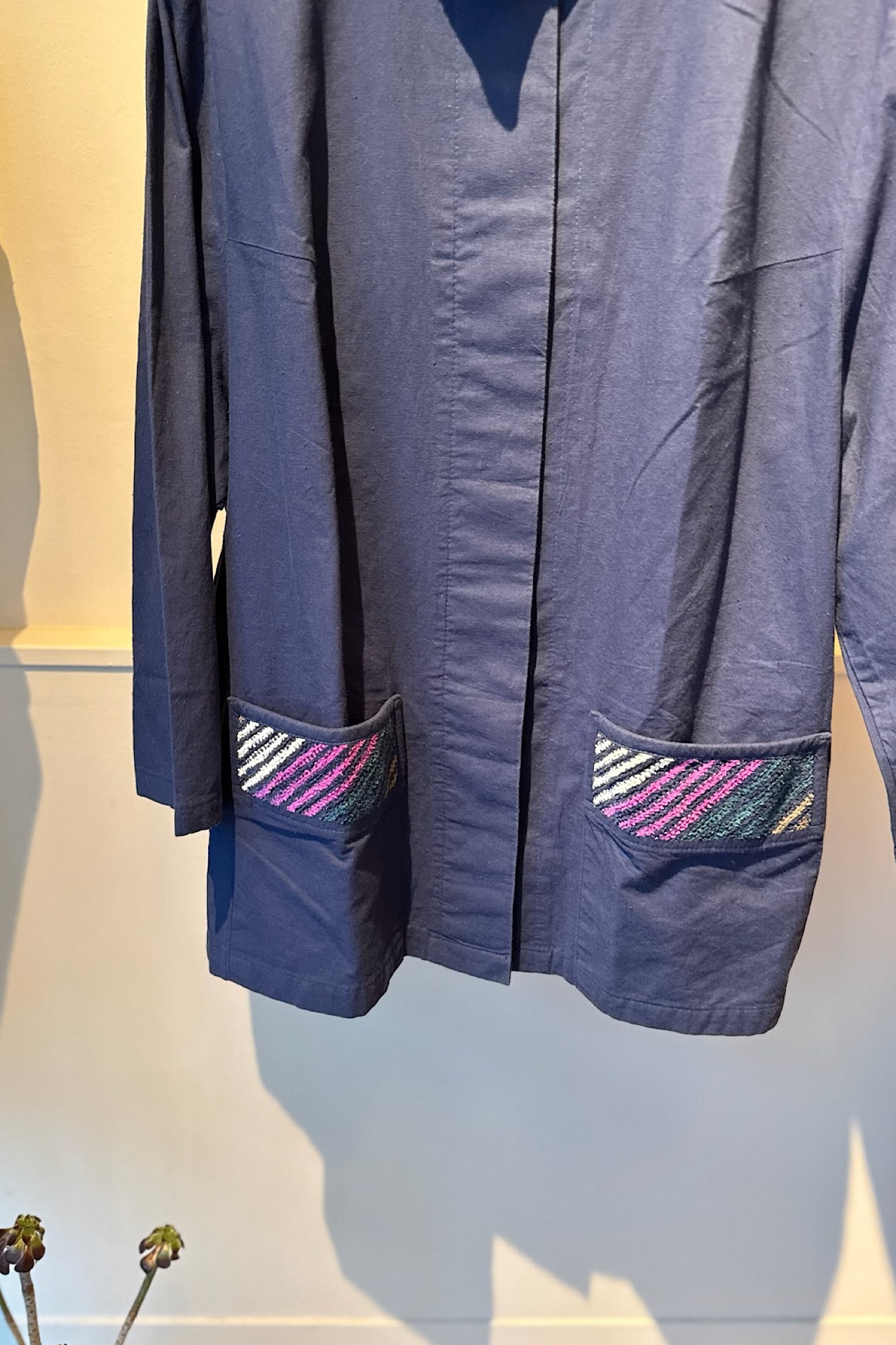 このジャケットは、柔らかなコットン素材を使用しており、心地よい着用感を提供します。鮮やかな織物のデザインが背中に施されており、シンプルながらも独自の魅力を放っています。
