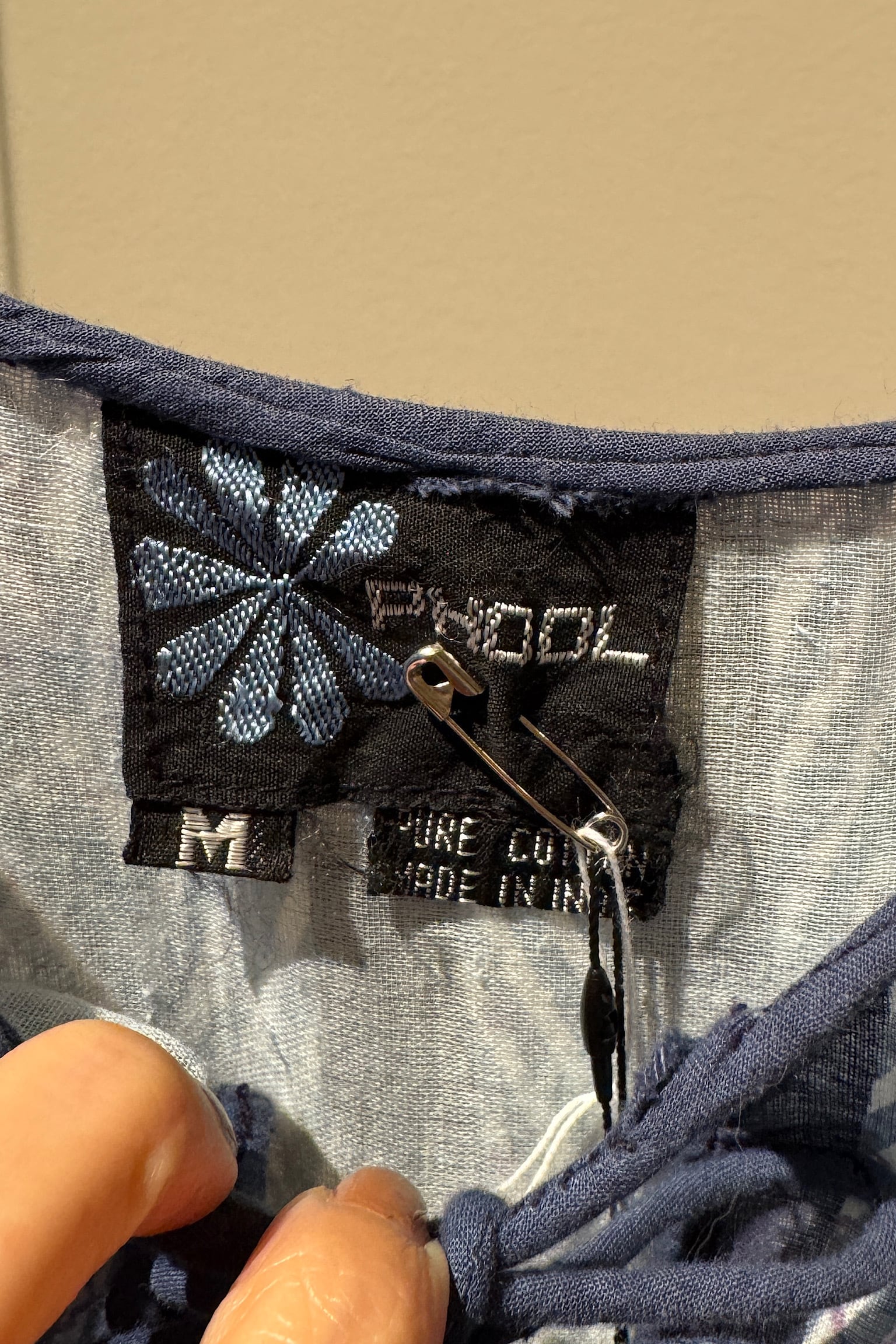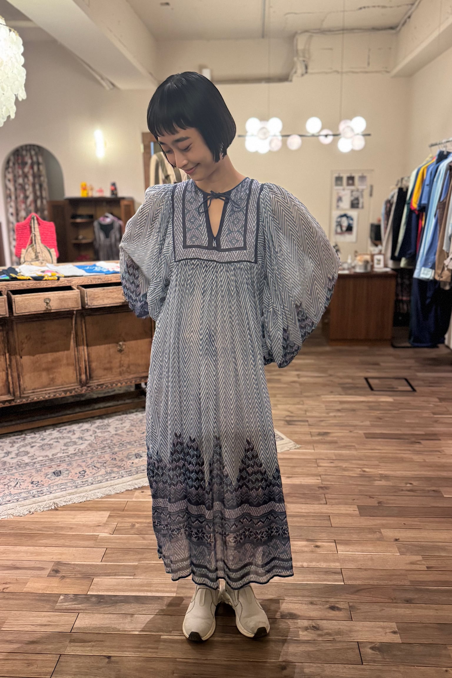 柔らかなインド綿を使用したPHOOLのライトブルードレスは、繊細な色合いと上品なデザインが魅力の一着。こちらは恐らく70年代ごろのアイテムです。