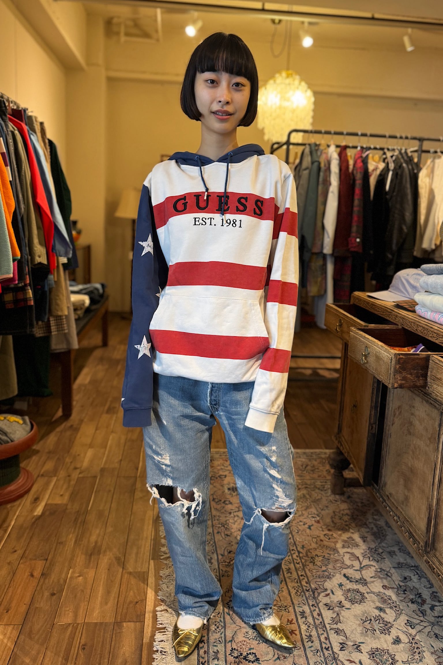 アメリカンスタイルを代表するGUESSのパーカーは、ヴィンテージ感が魅力的なスウェットアイテムです。