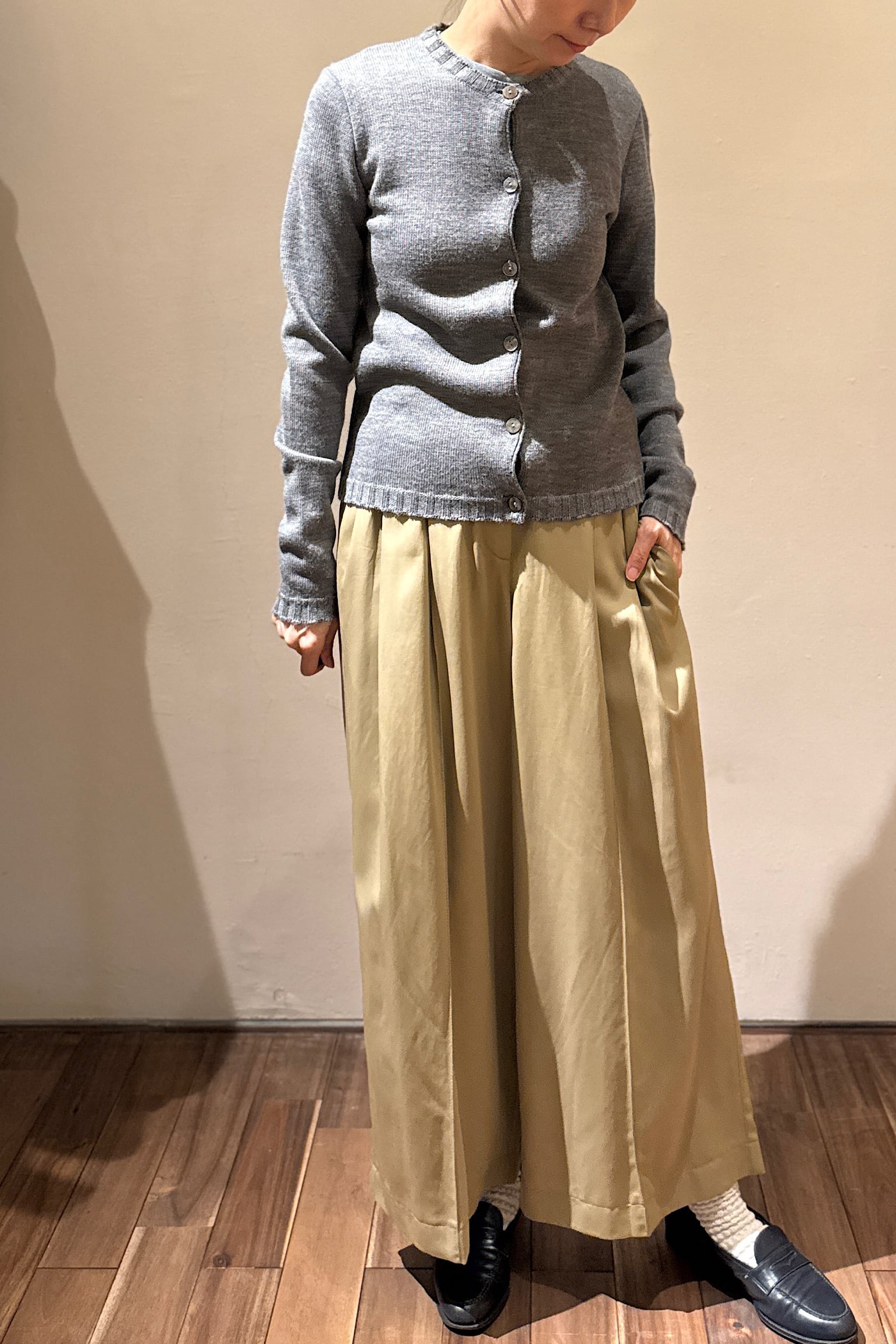 J&M DAVIDSONのグレーニットカーディガンは、クラシックなデザインと洗練された雰囲気を兼ね備えたアイテムです。