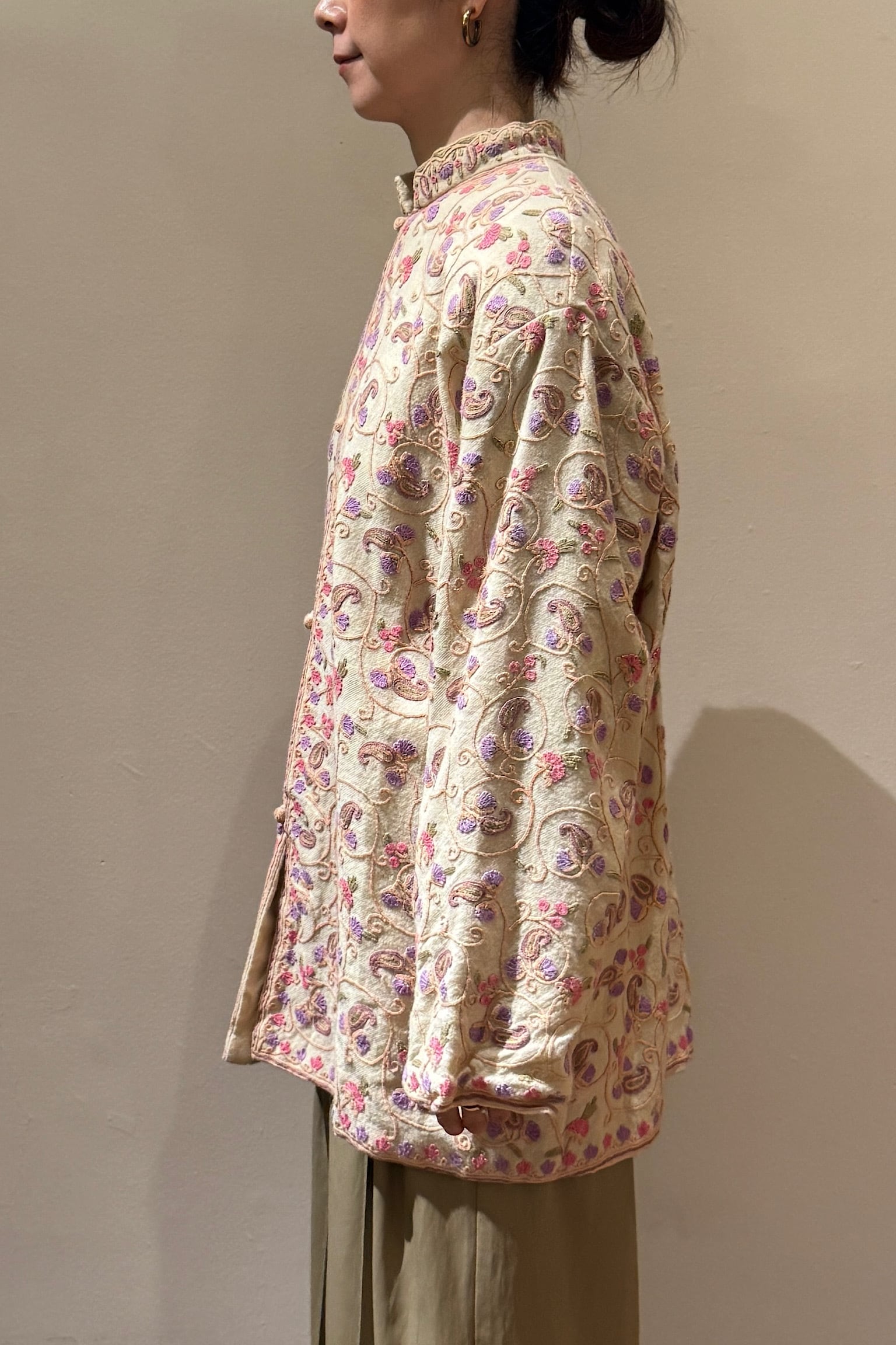 美しい刺繍が施された一着で、柔らかな温かみのあるウール混素材で、暖かさと快適さを両立させています。