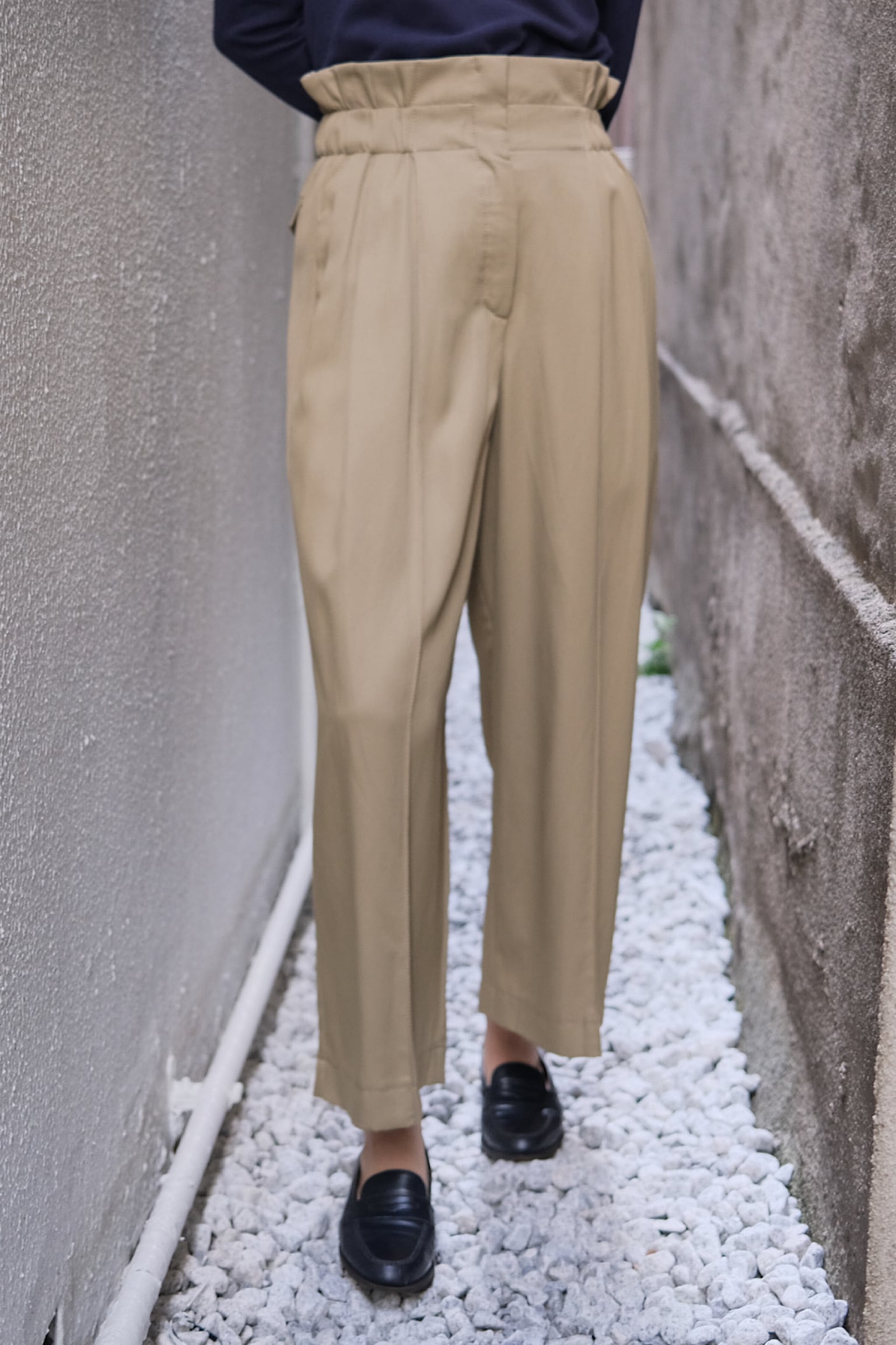 軽やかな素材感と柔らかなベージュの色味が相まって、リラックスした印象を与えながらも上品さを保っています。