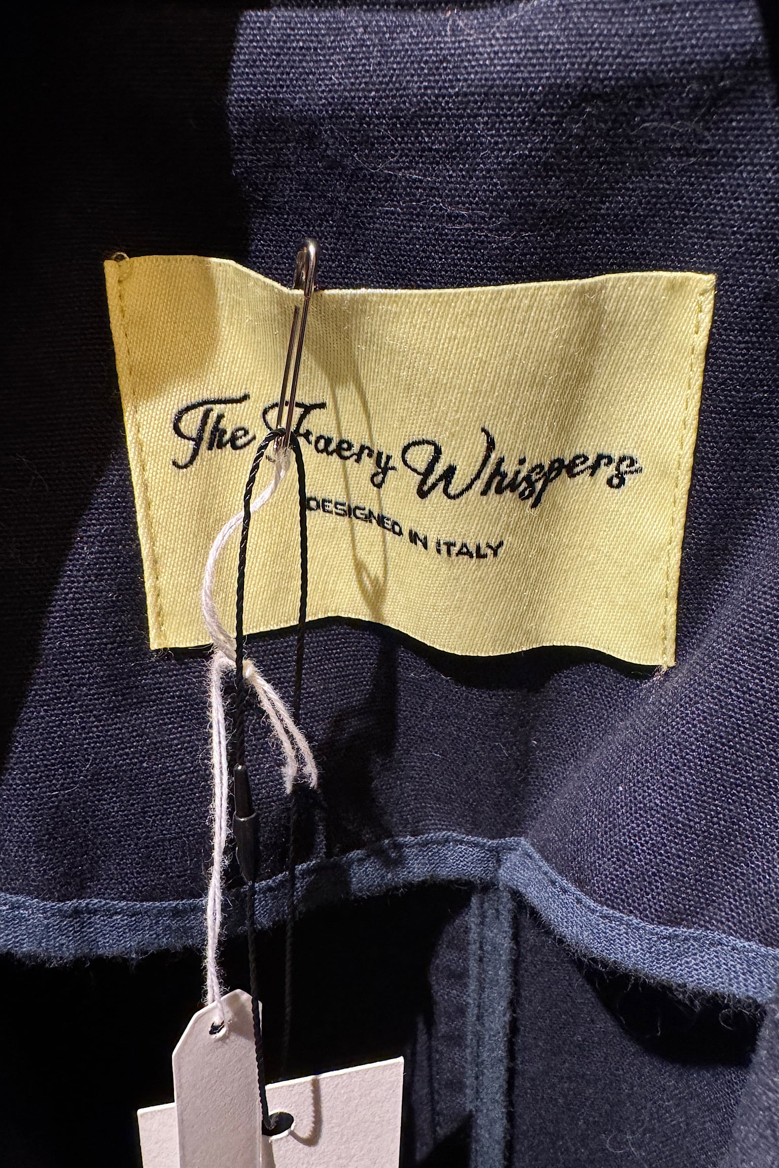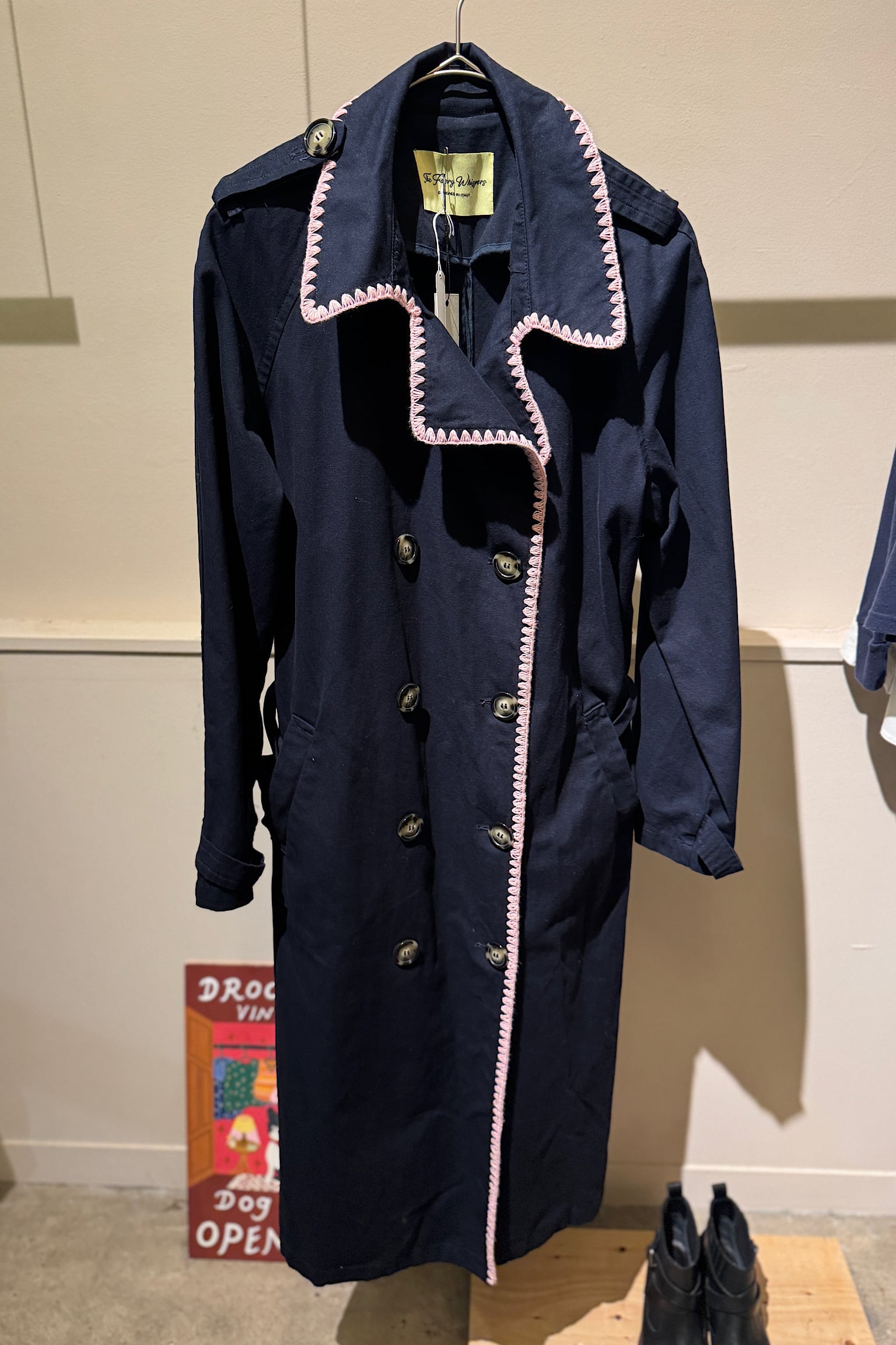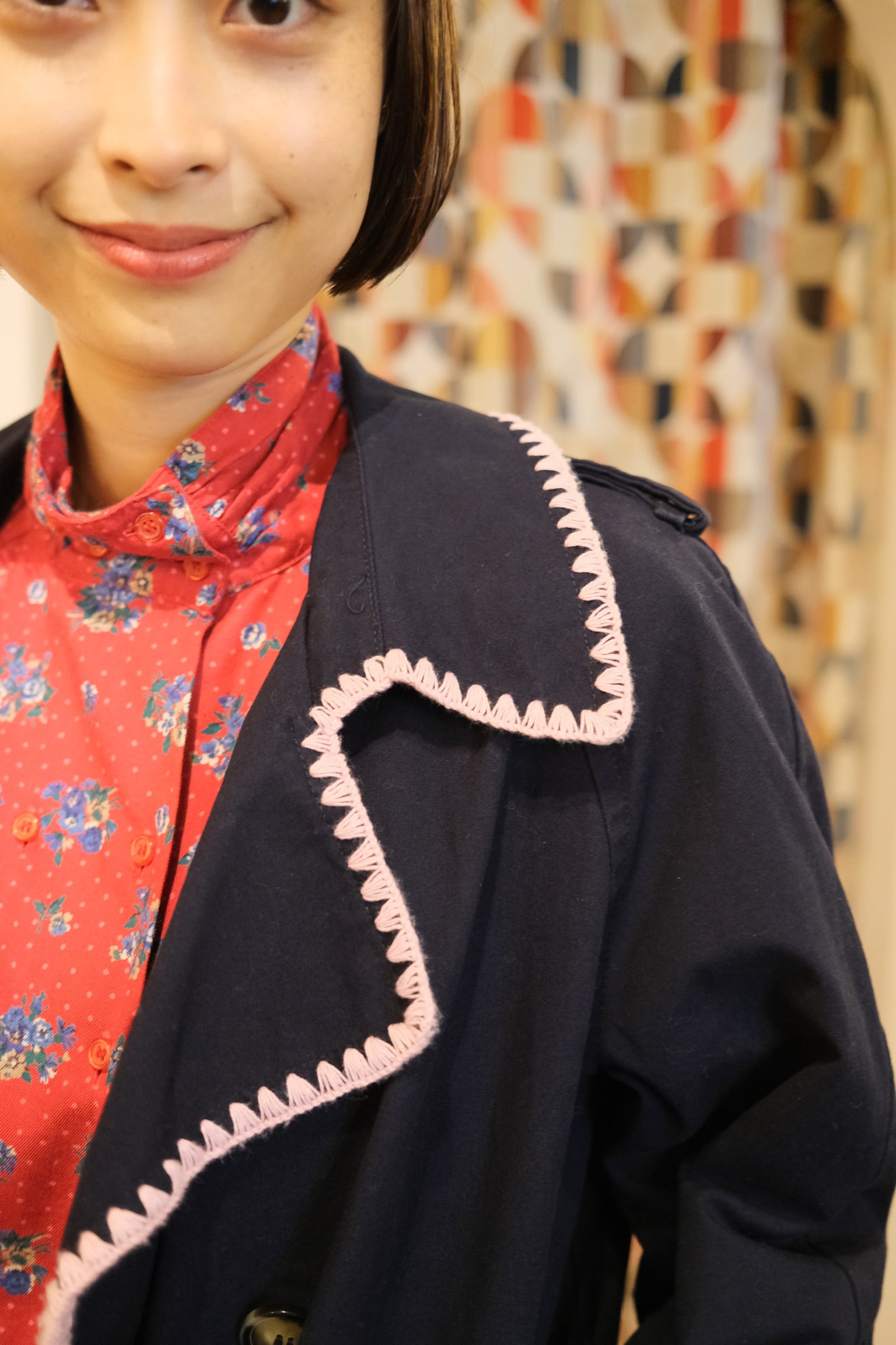 ネイビーのトレンチコートに手作業によるハンドステッチが施されており、その繊細なディテールが美しい1着です。