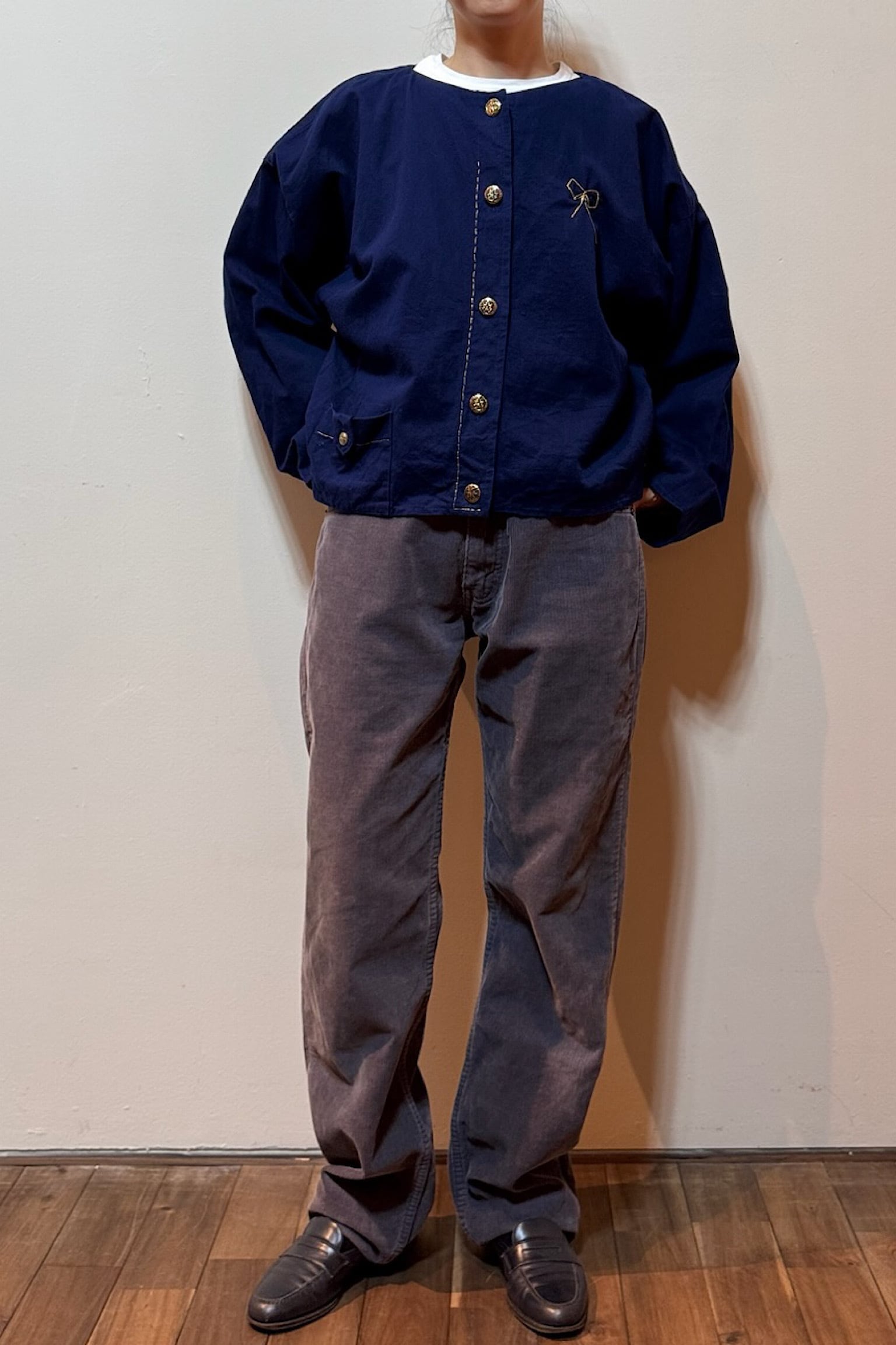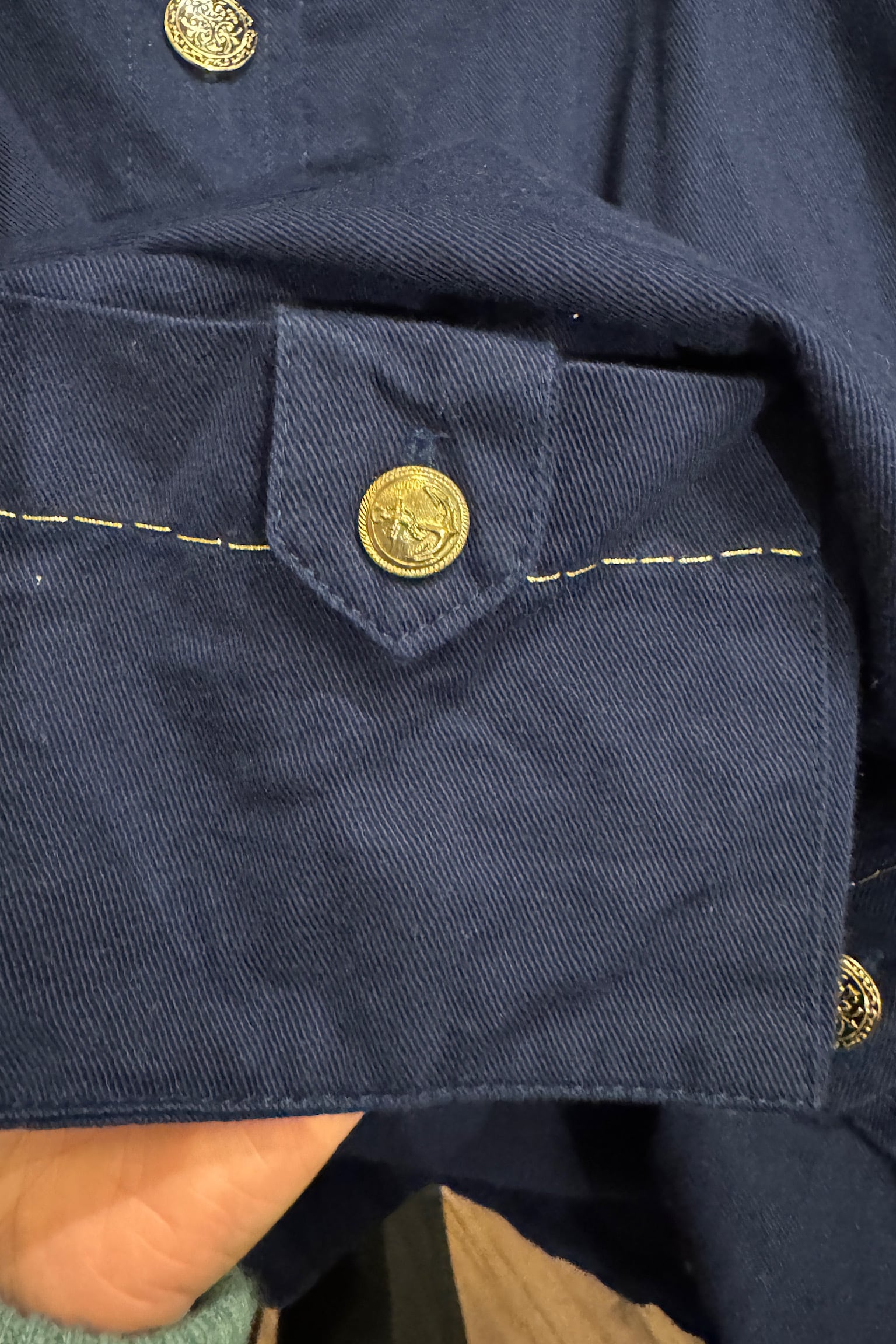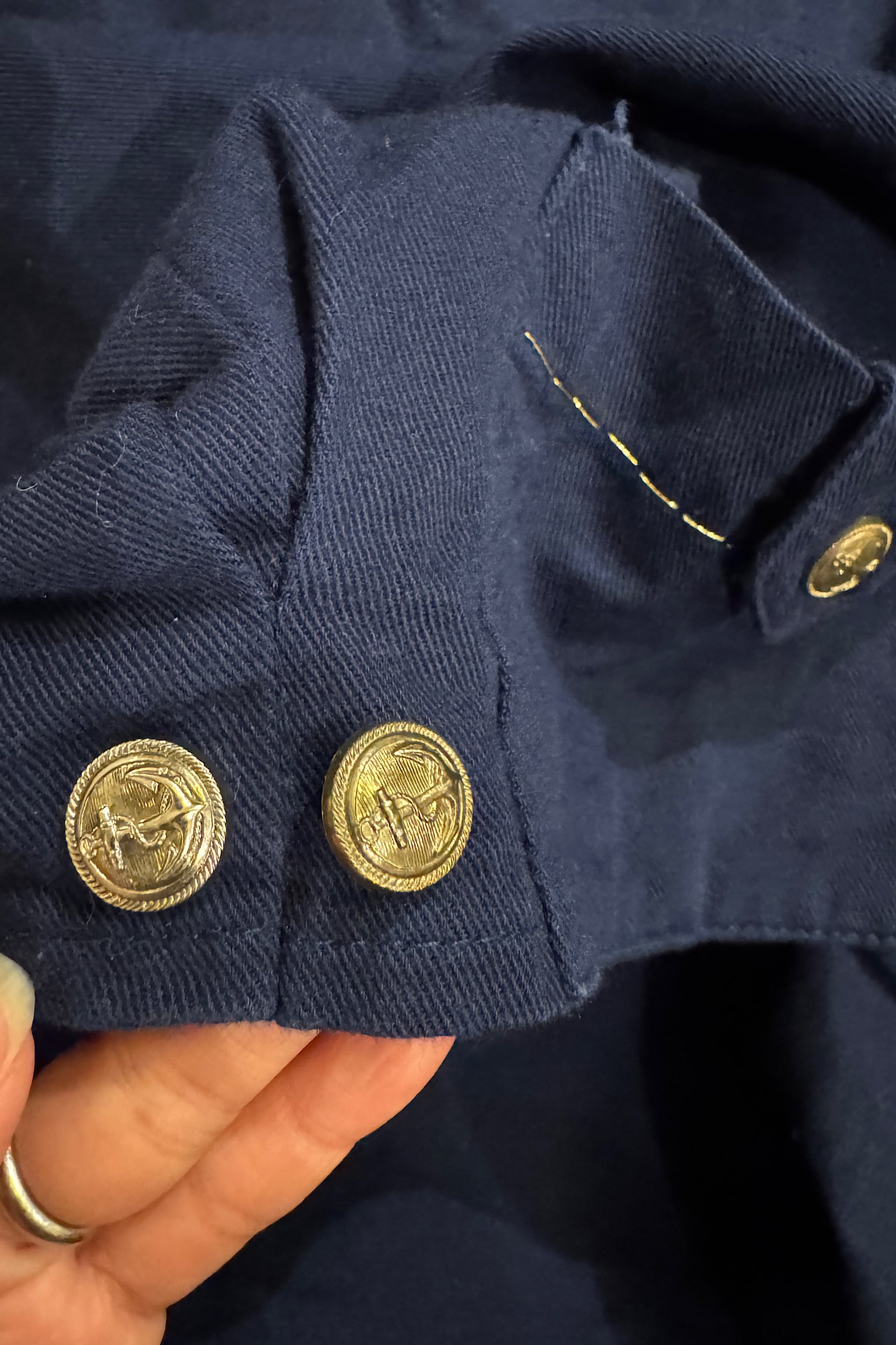 ネイビーにゴールドのスティッチやボタンが際立つジャケット。