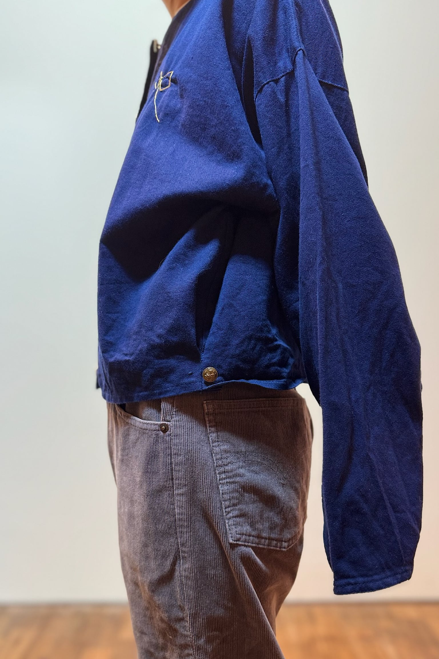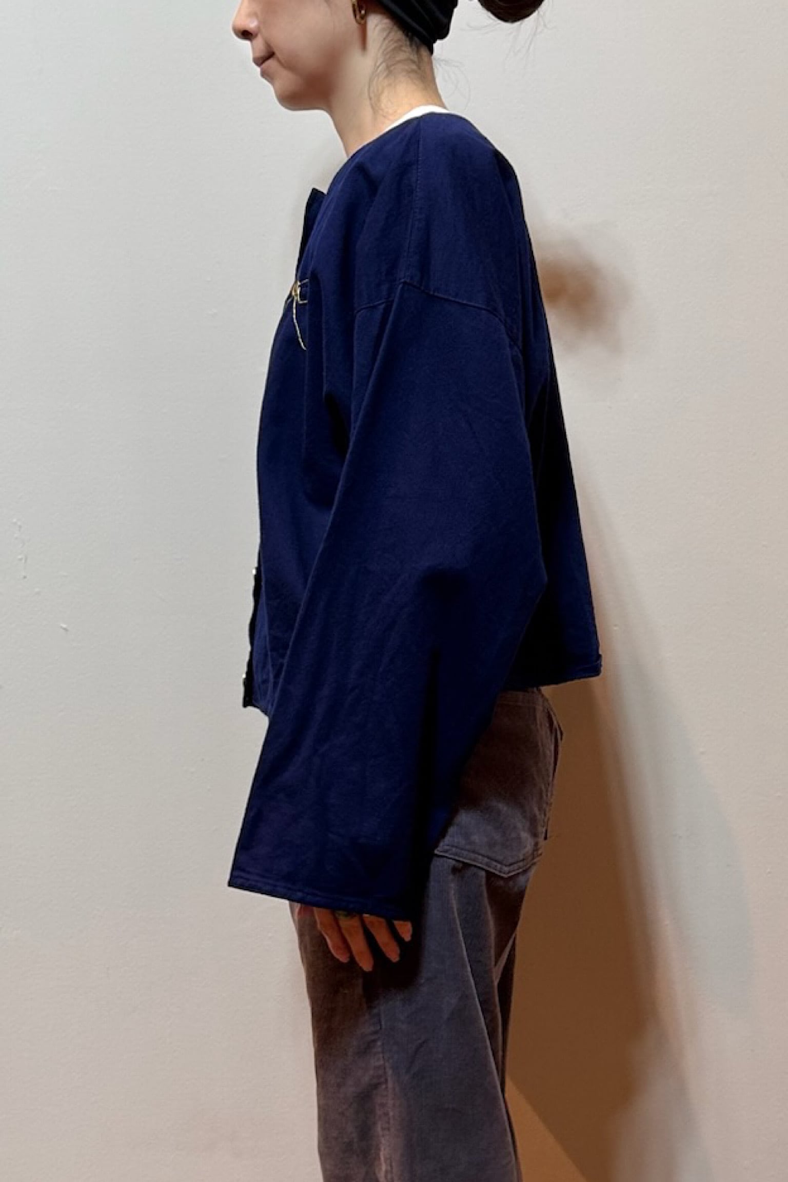 コンパクトな着丈ですが、身幅や袖周りはゆったりでインナーにニットをレイヤードすることも可能です。
