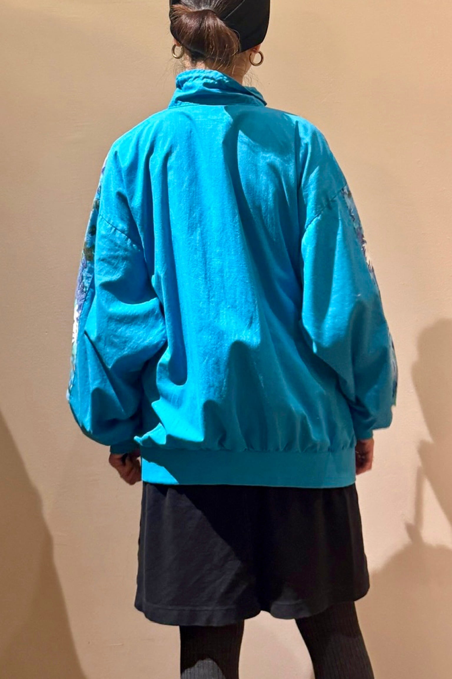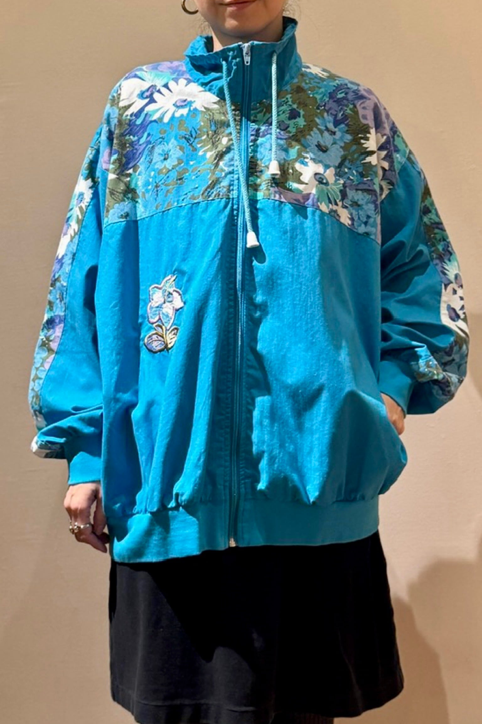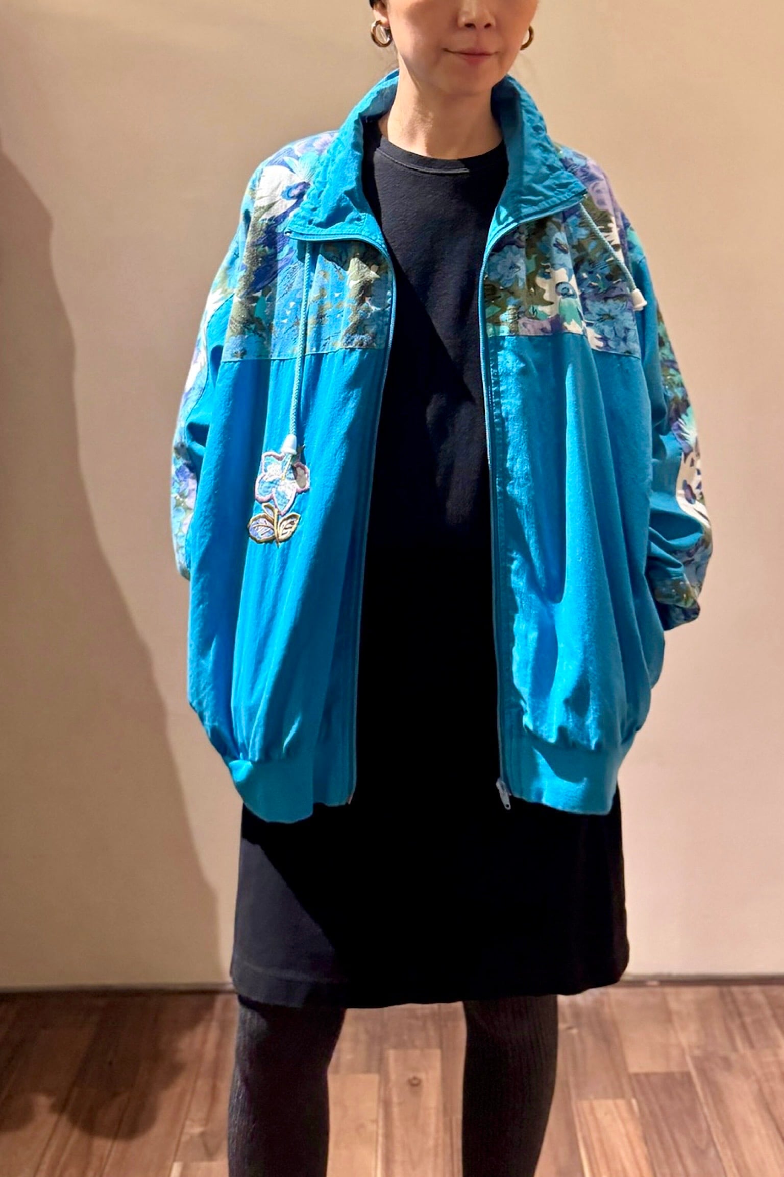 鮮やかなターコイズブルーにフラワープリントが映えるこのブルゾンは、ヴィンテージならではのユニークな風合いが魅力です。柔らかい素材感で、肌触りも心地よく、春から夏にかけての軽やかな装いを演出します。特にカジュアルなデニムと合わせることで、トレンド感溢れるスタイルが完成します。