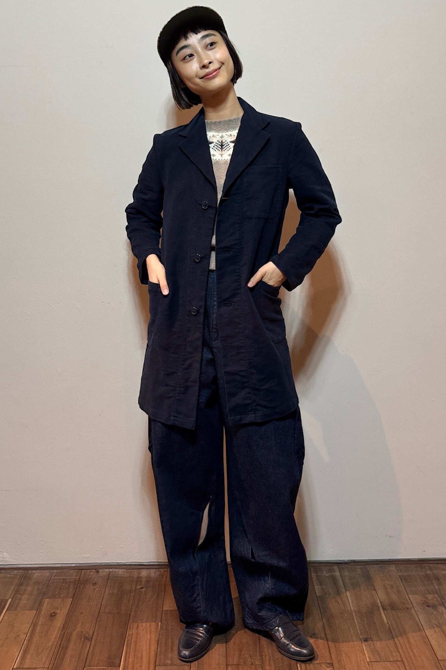 このコートは深みのあるネイビーカラーが特徴で、シンプルながらも高級感を漂わせるデザイン。