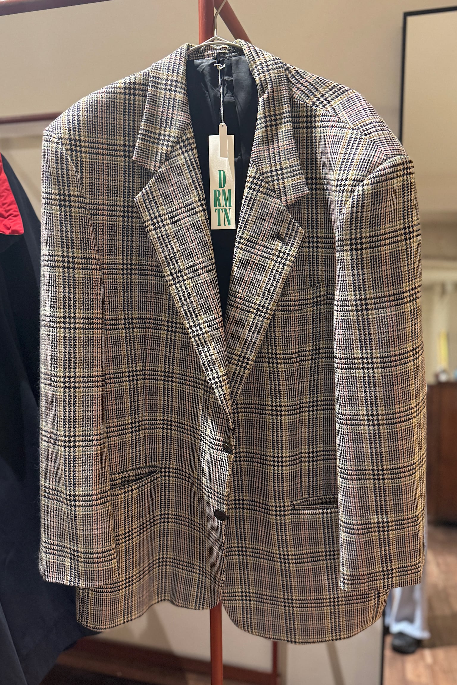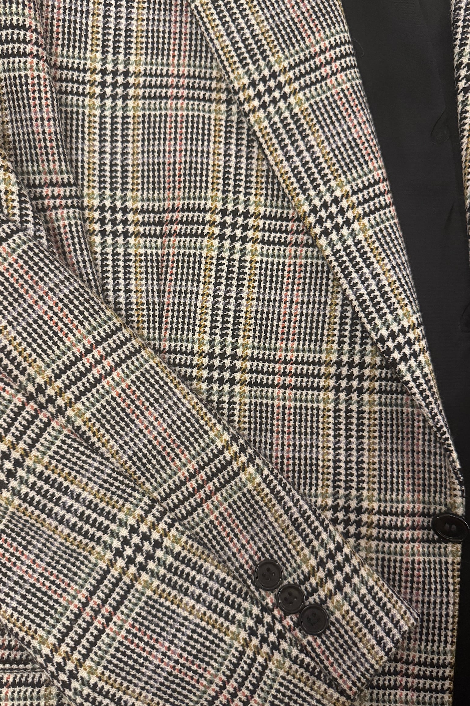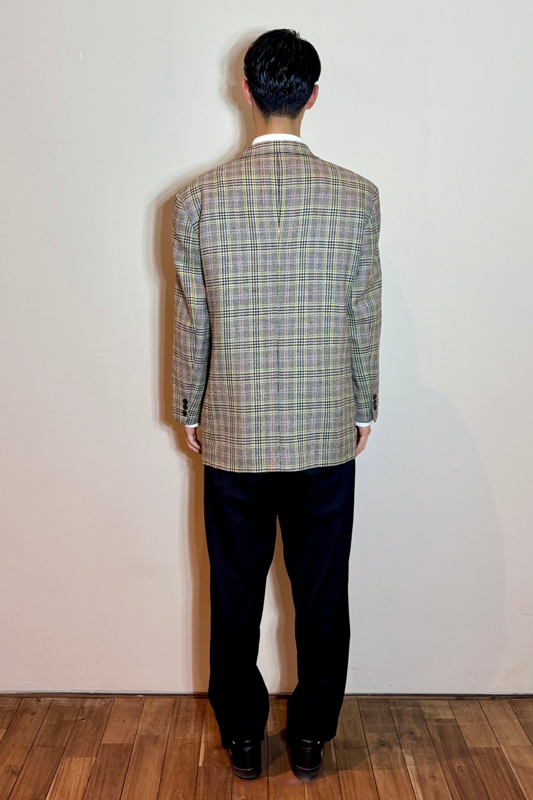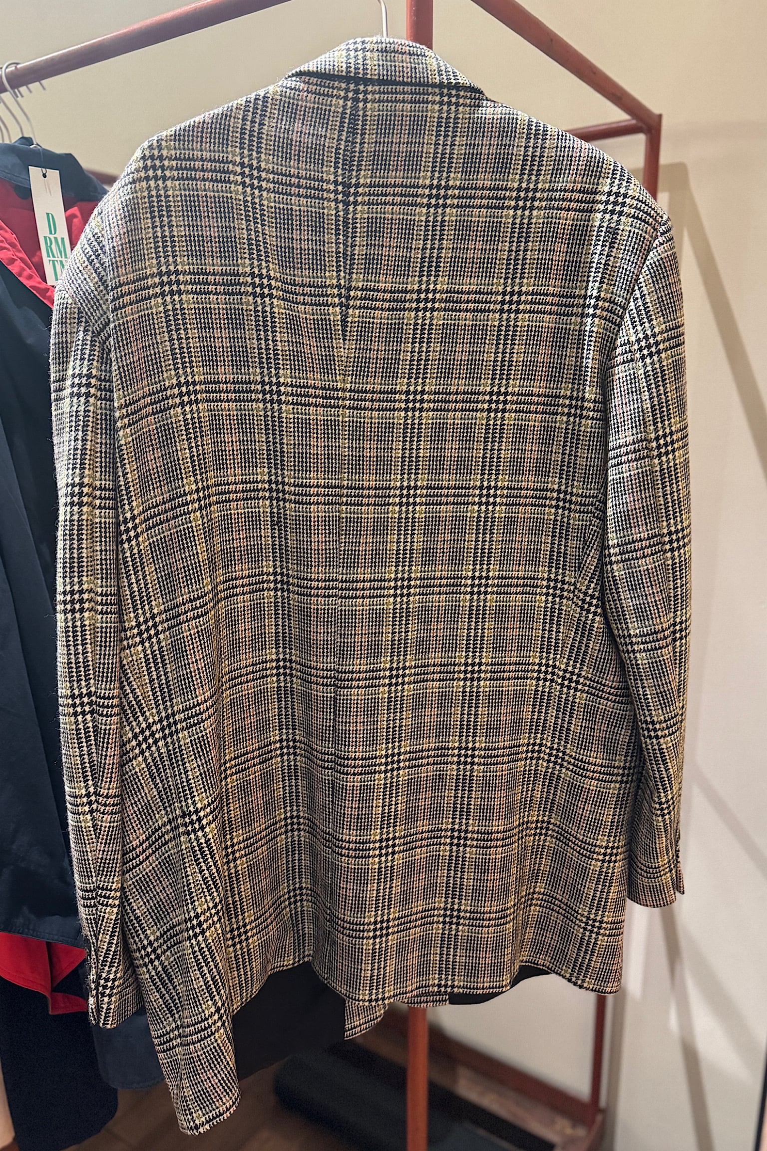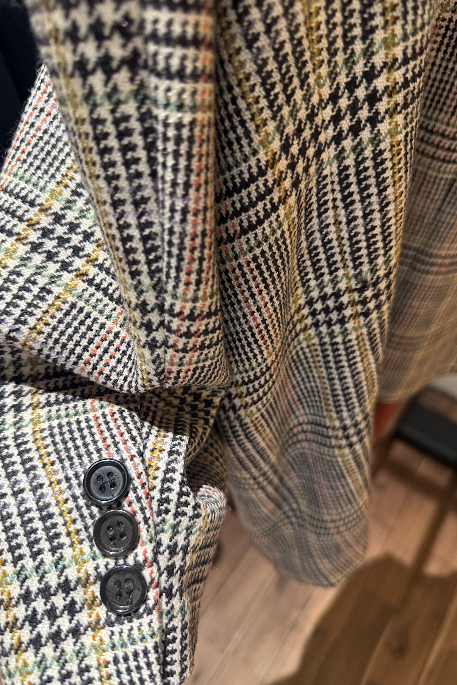 細やかなチェック柄が施されたこのジャケットは、一見シンプルながらも、その風合いやデザインには高級感が漂います。