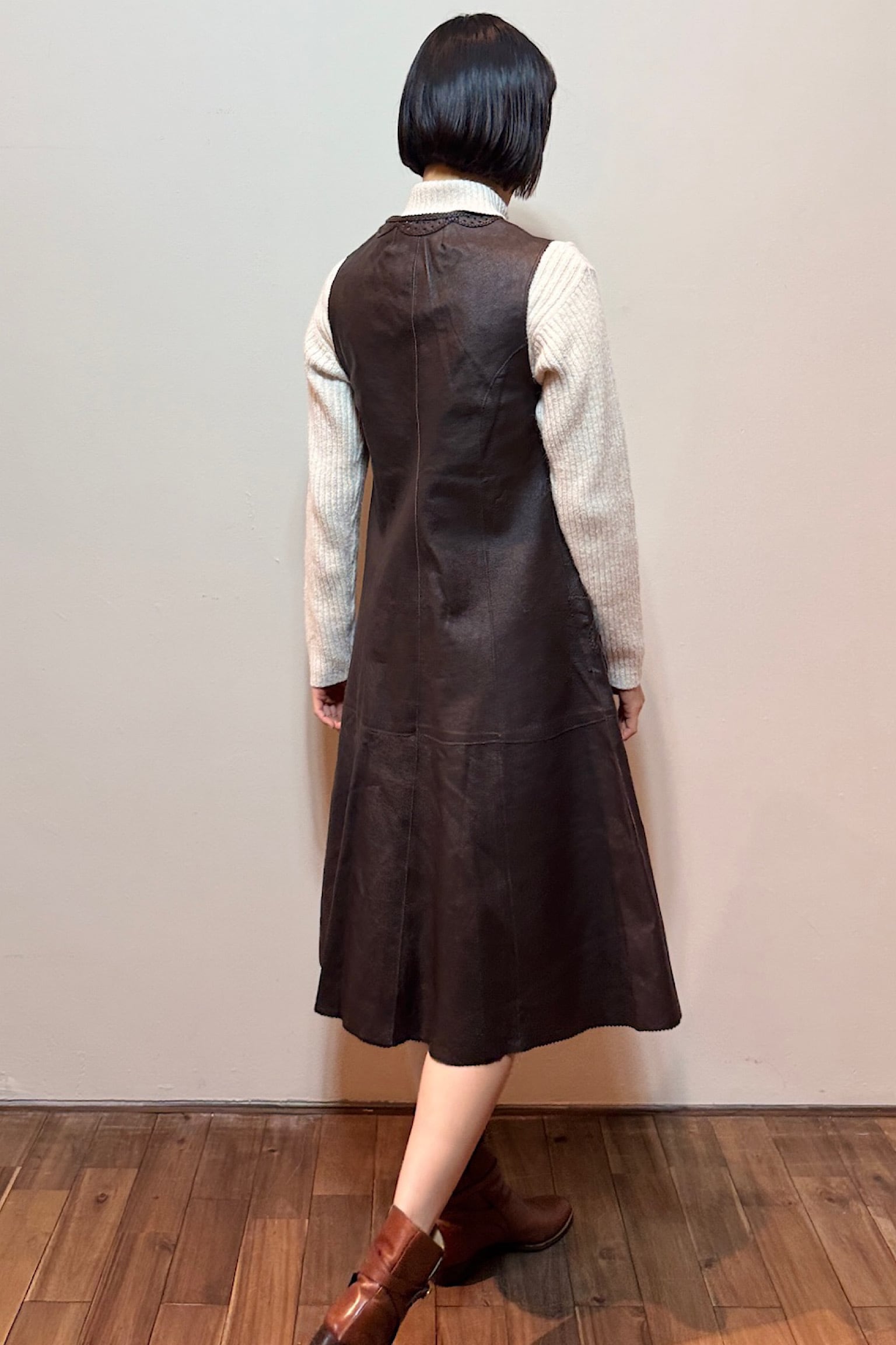 洗練されたレザーの質感が際立つレザーノースリーブカットワークドレスは、エッジの効いたデザインで個性を引き立てます。