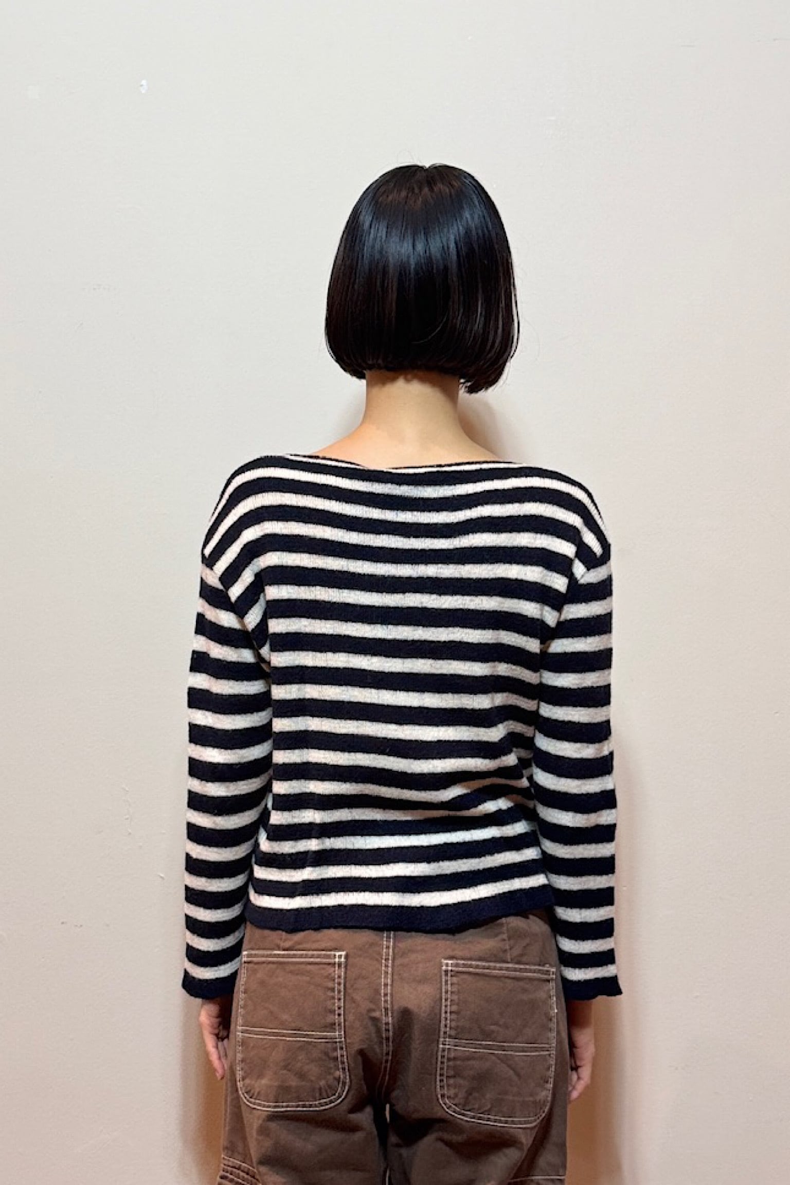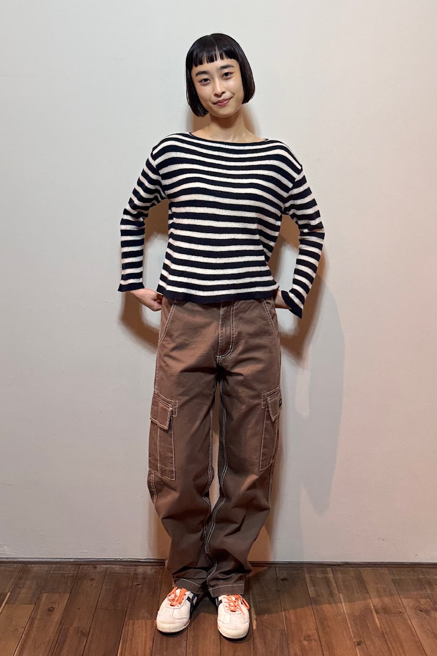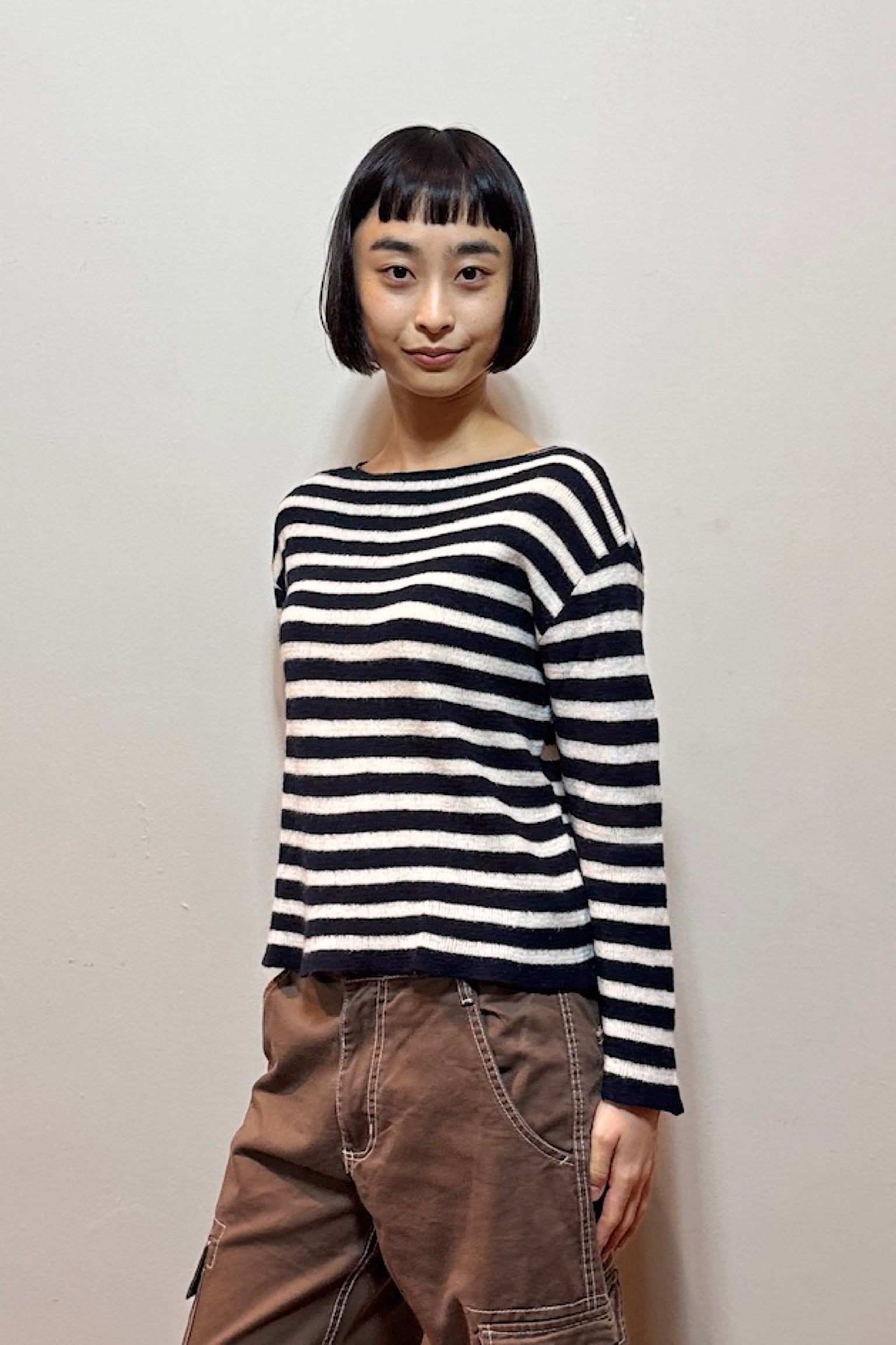 深いネイビーとボーダー柄が絶妙に組み合わさり、シンプルながらもスタイリッシュな印象を与えます。温かみのあるフリース仕立てで、寒い季節にも快適に着用できるのが特徴です。