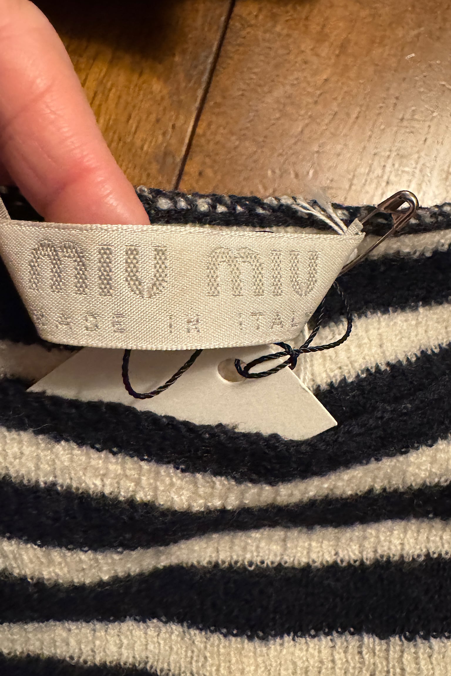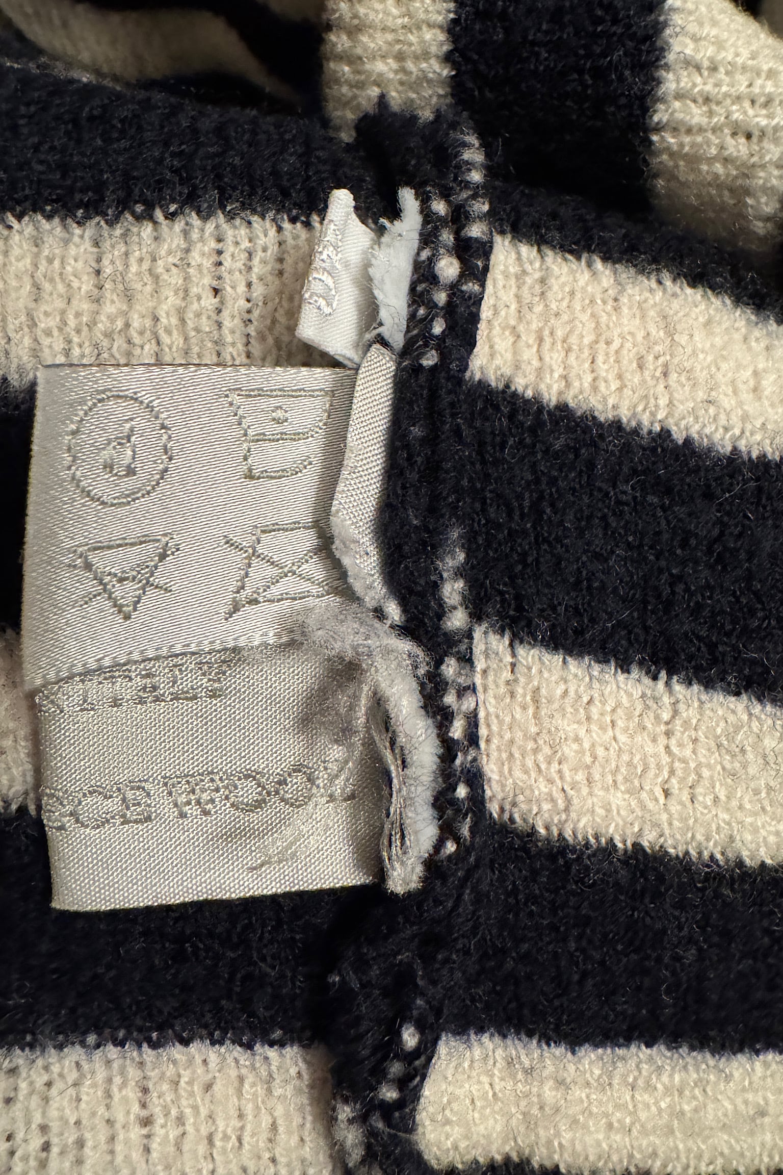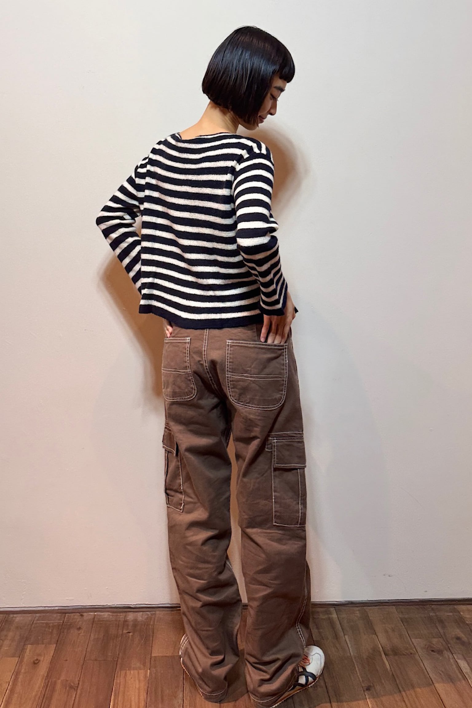 深いネイビーとボーダー柄が絶妙に組み合わさり、シンプルながらもスタイリッシュな印象を与えます。温かみのあるフリース仕立てで、寒い季節にも快適に着用できるのが特徴です。