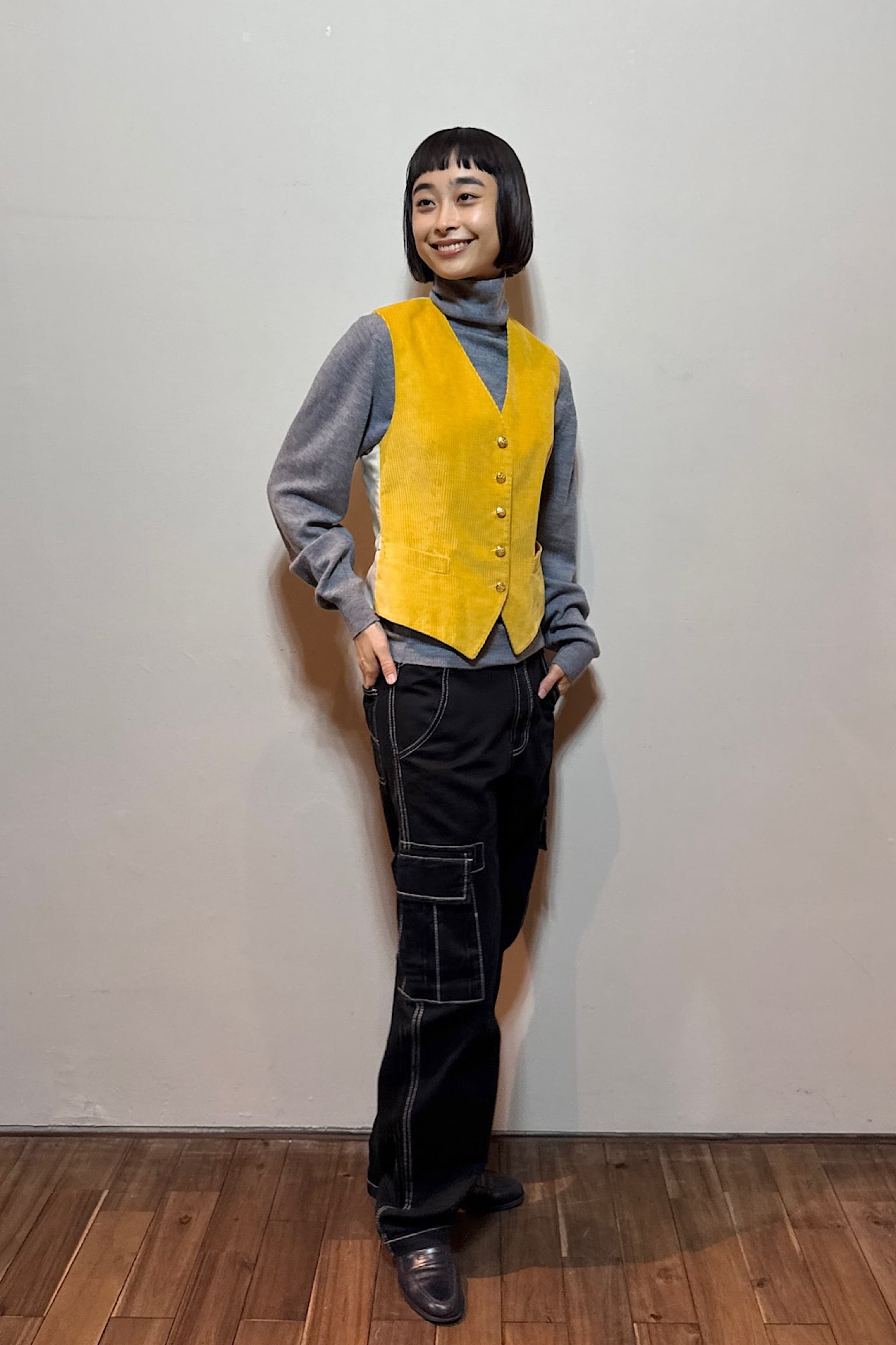 イエローの色味が秋冬のファッションに華やかさを加え、一枚で主役級の存在感を放ちます。