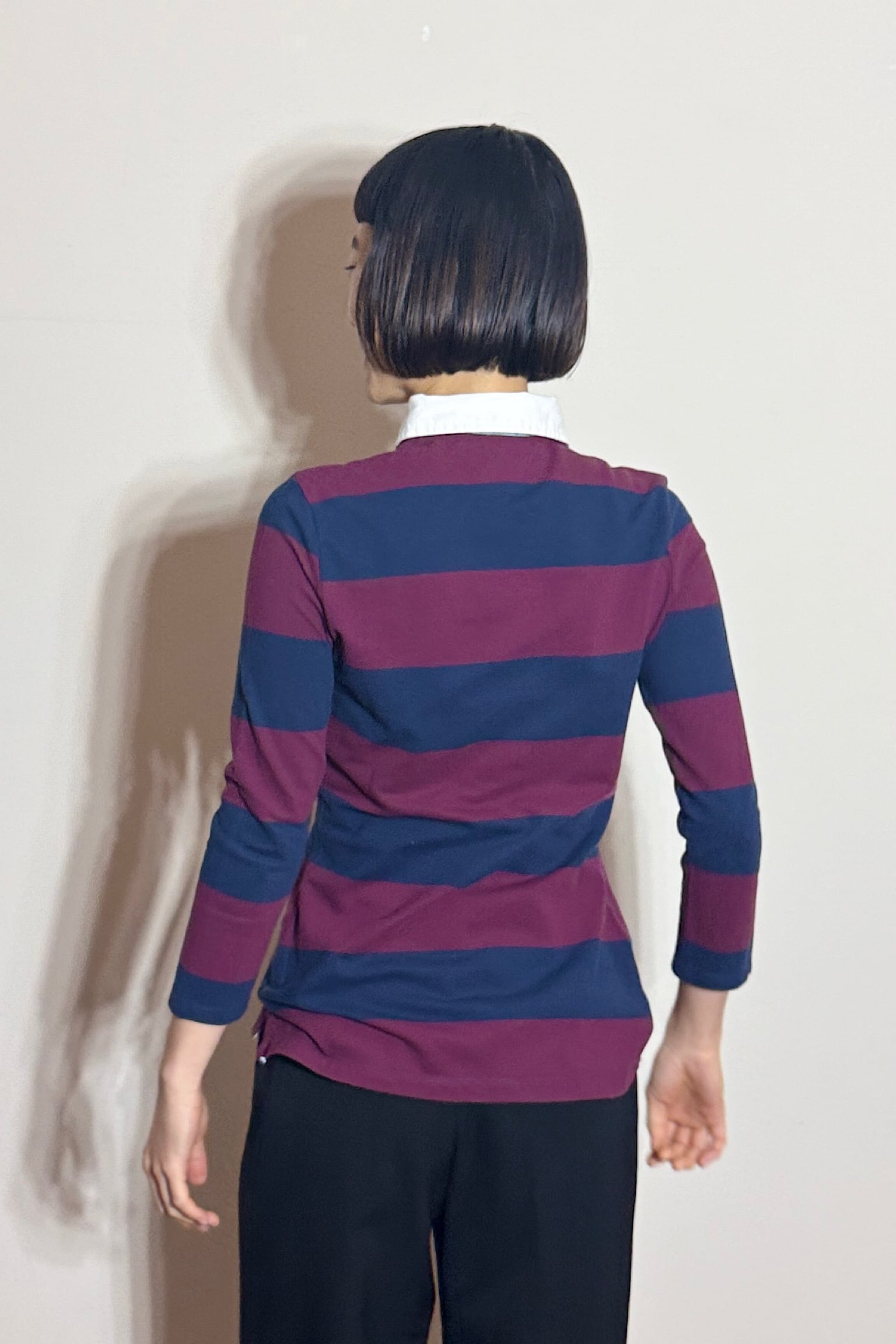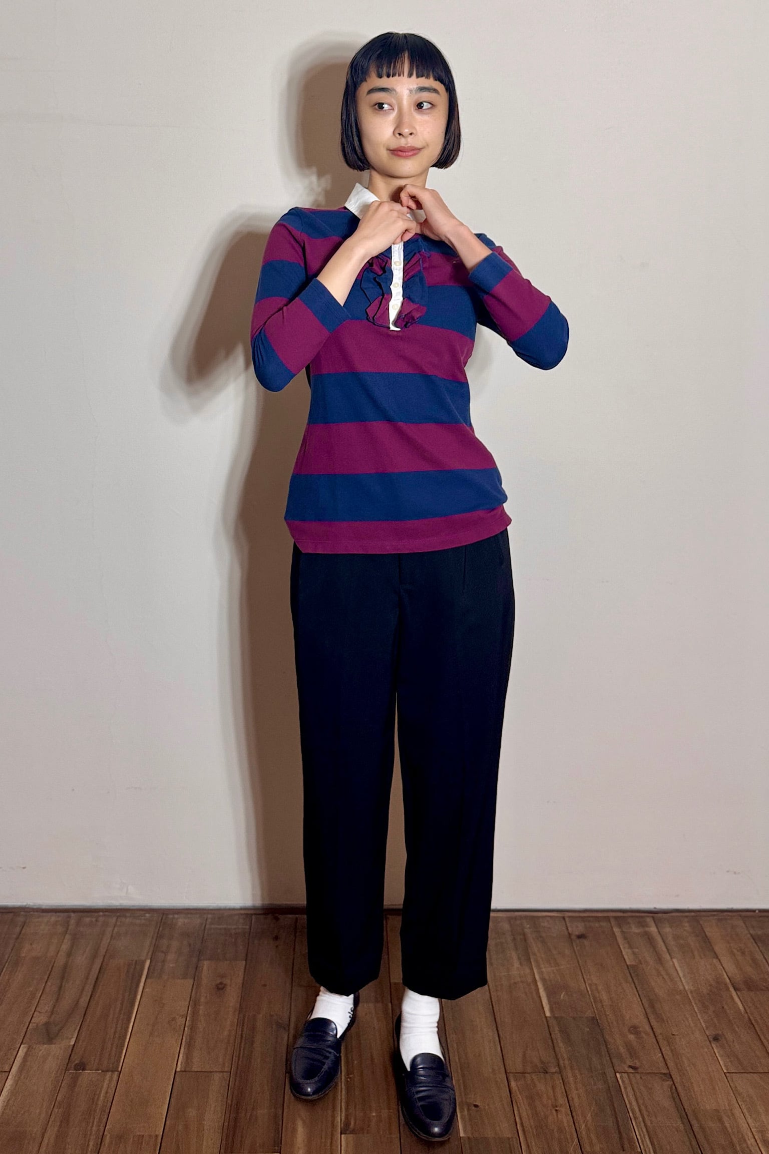 トミー・ヒルフィガーのフリル付きラガーシャツは、個性的なバーガンディとネイビーのボーダー柄が目を引きます。