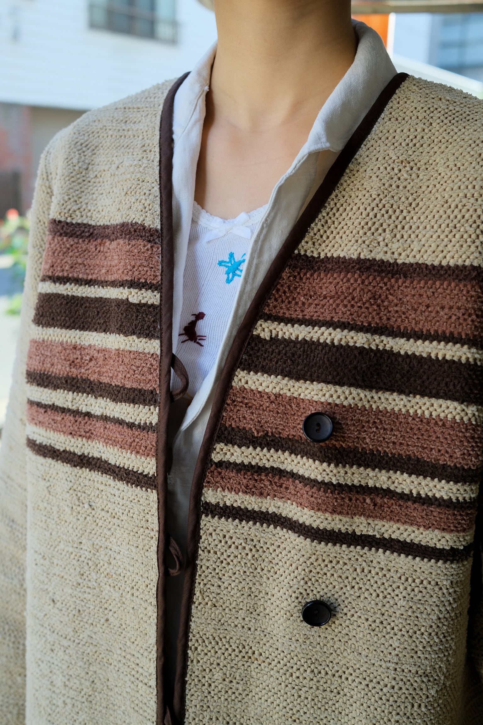 ヨーロッパより到着した独特の織りが特徴的な70年代頃のボーダーウーブンロングコート。