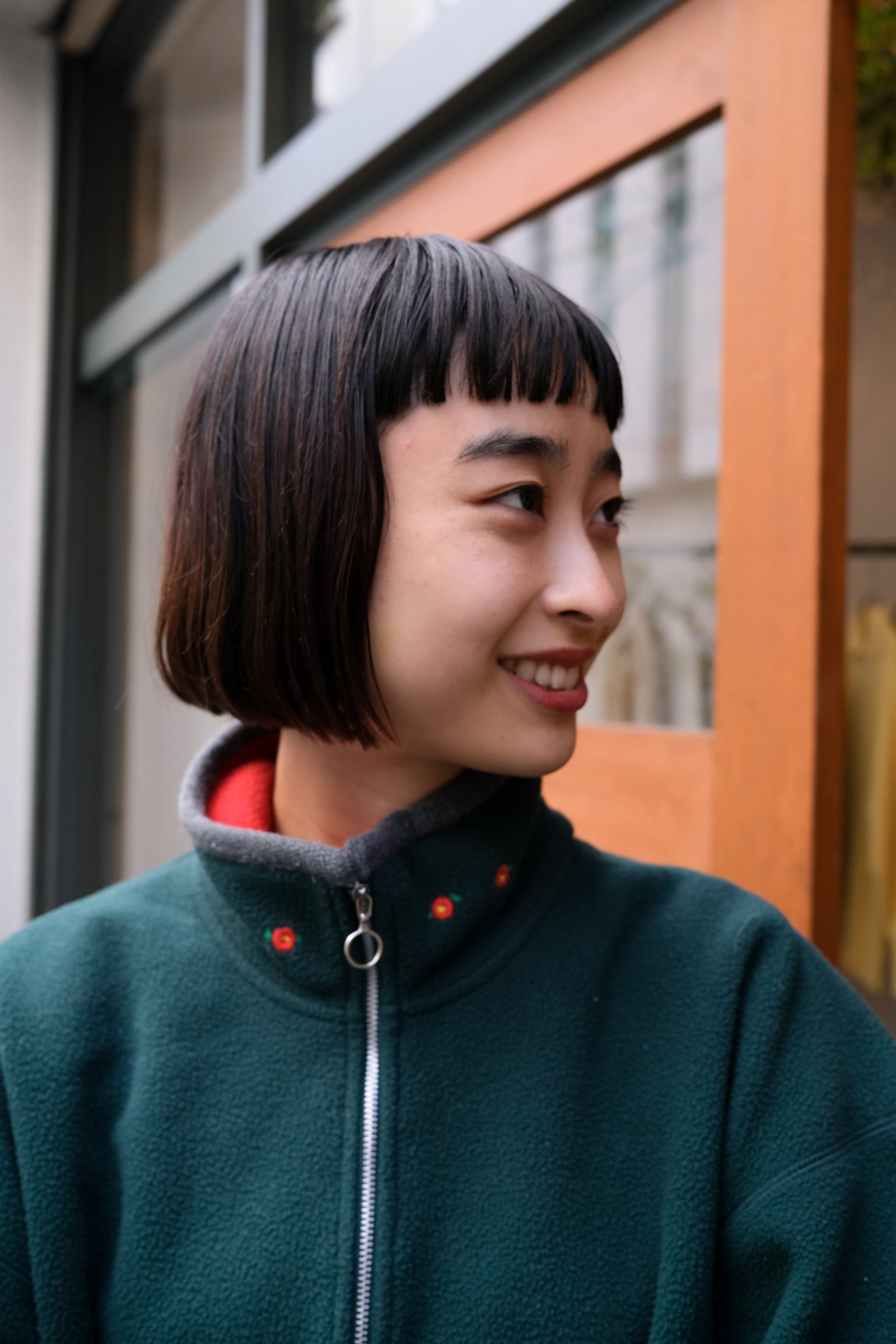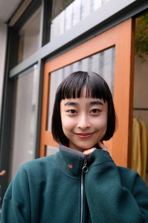 カジュアルになりがちなフリースですが、首元のお花の刺繍など女性らしいポイントが。