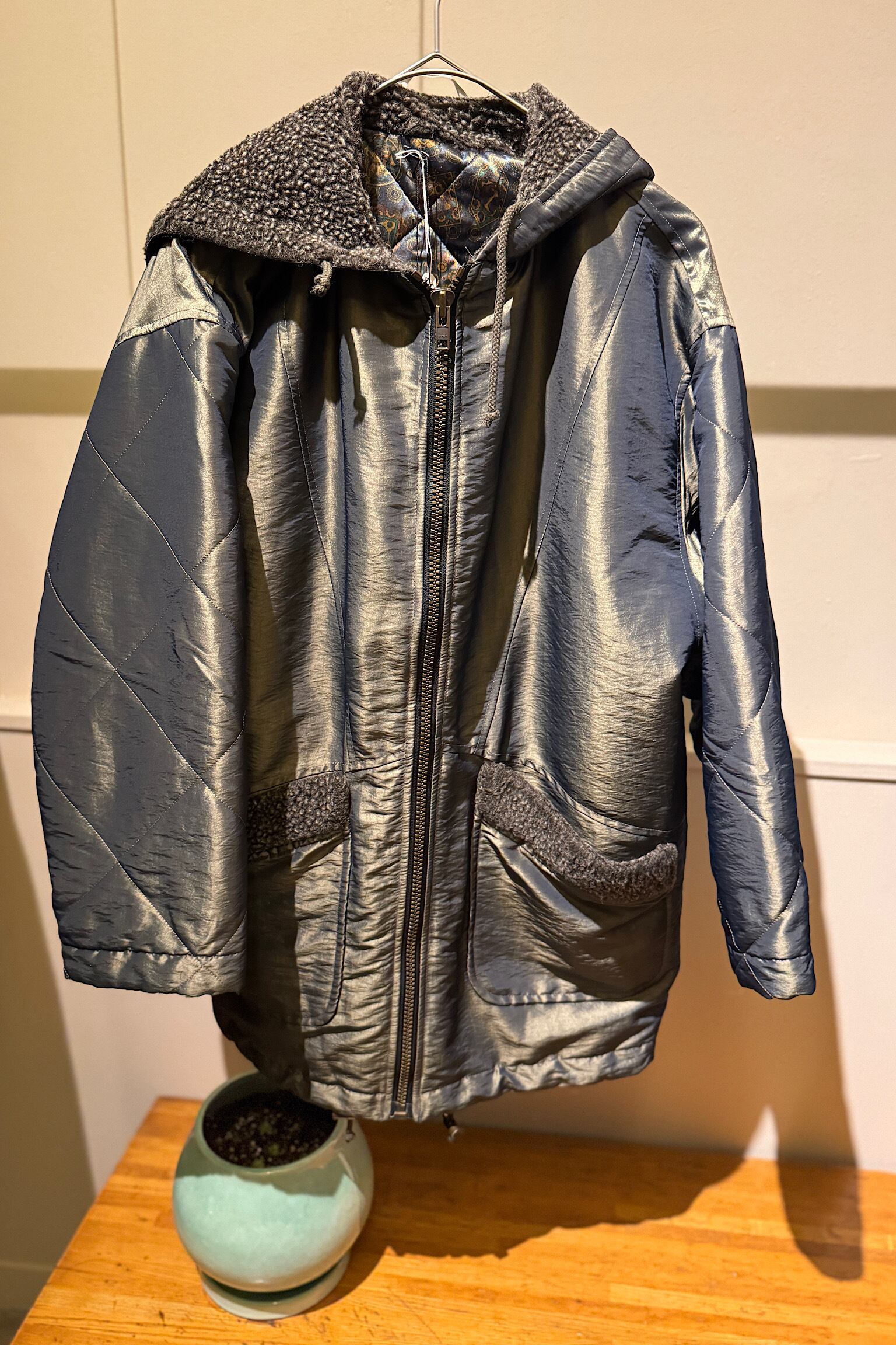 光沢のある生地が特徴的なナイロンキルティングフーデッドコート。