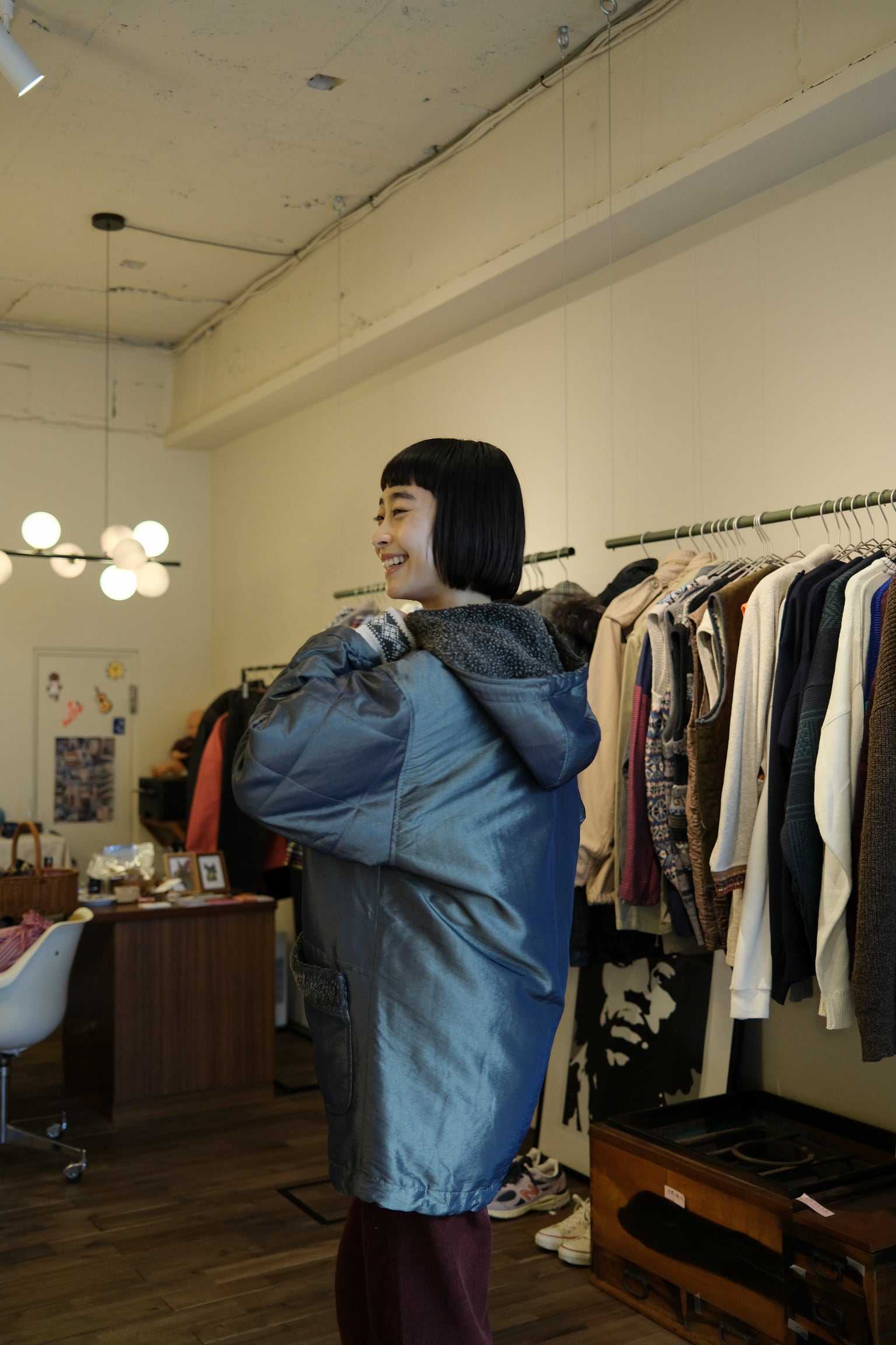 このコートにはボア付きのフードがついており、寒い季節でも暖かさをしっかりと保ってくれます。