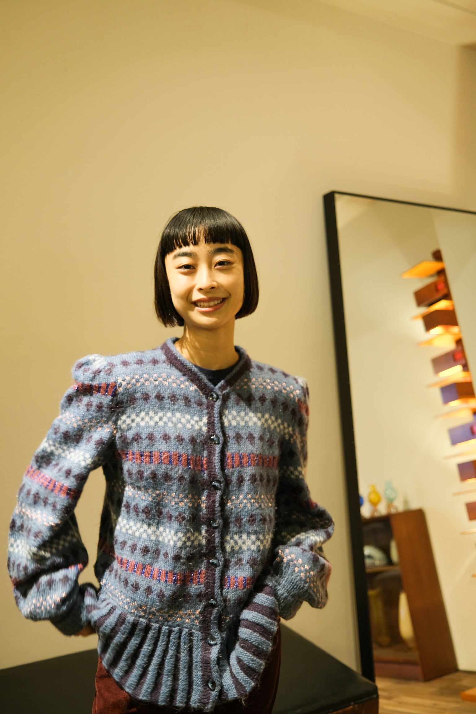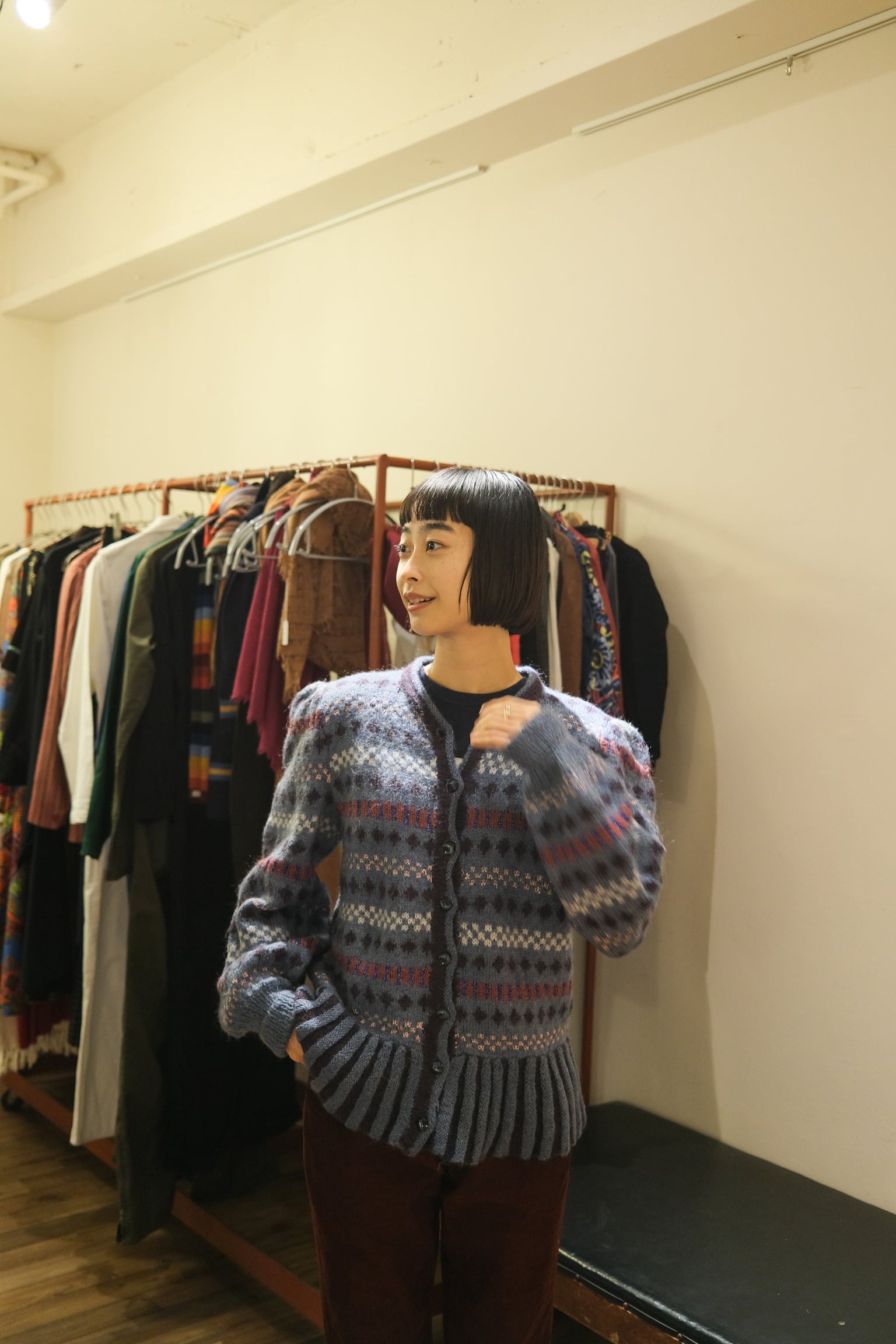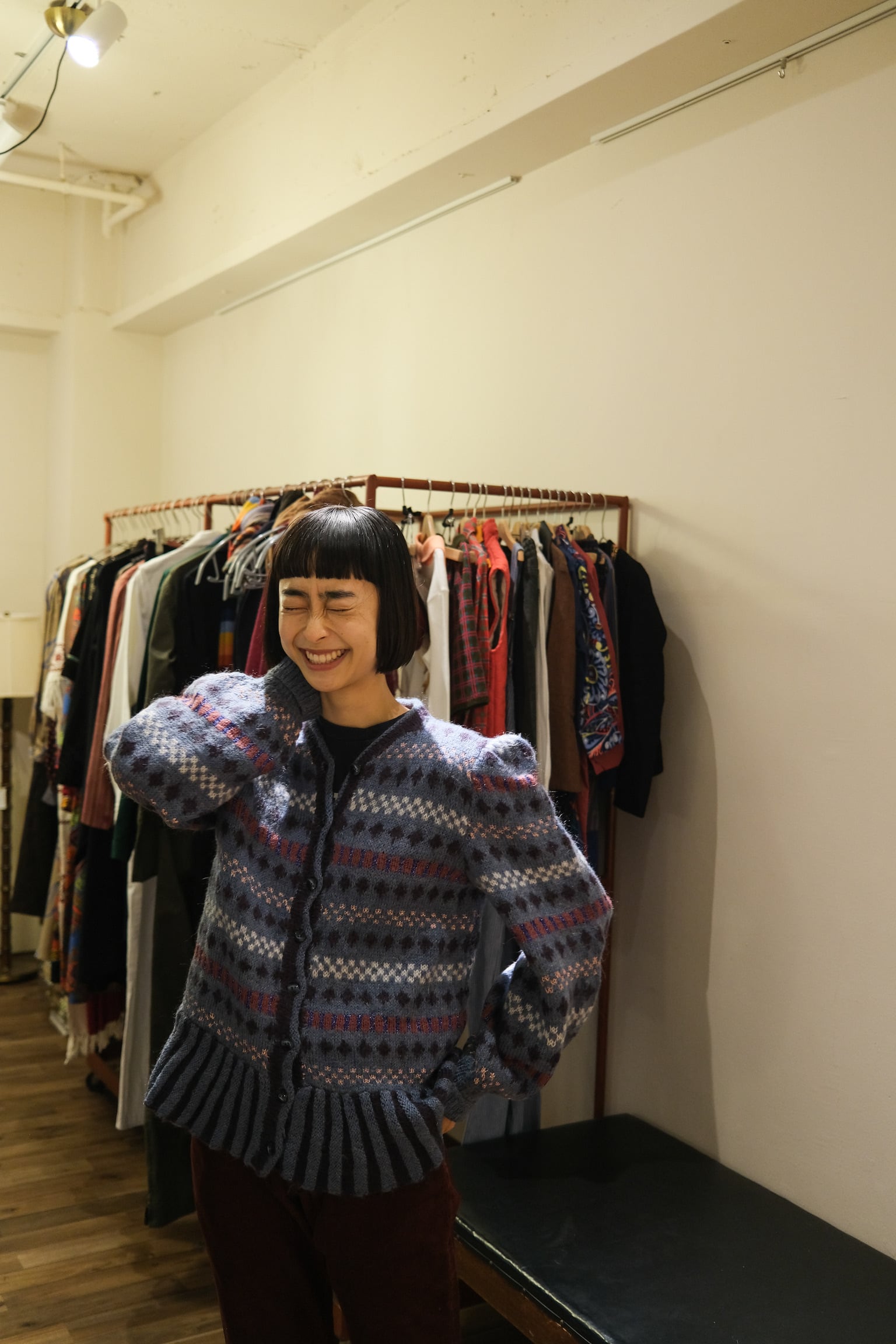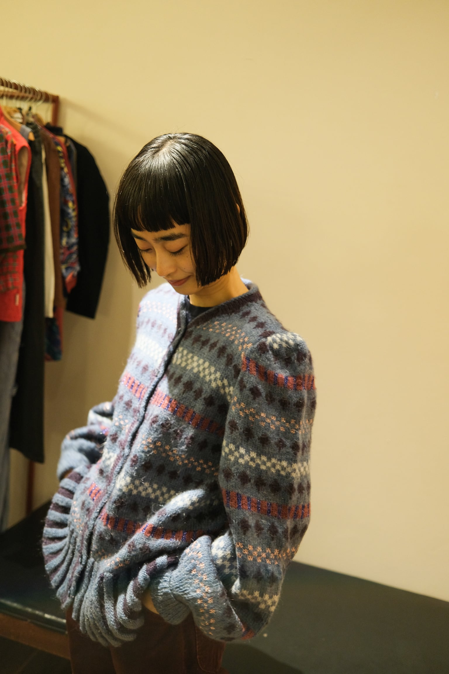 ヨーロッパより到着したハンドメイドのパフスリーブブルーカーディガン。