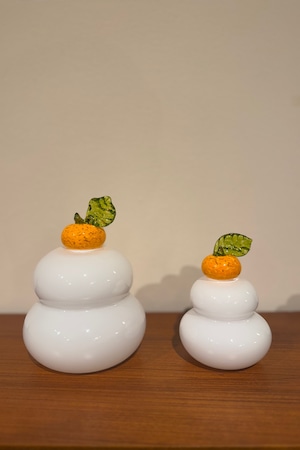 シマダシンペイグラスワークスの「鏡餅」は、新年を華やかに彩る素敵なアイテムです。白いガラス素材で作られたこの作品には、取り外し可能なオレンジのミカンがしっかりと鎮座しており、まさに新年の飾りとして最適。特に、ガラス工芸作家・島田真平さんの手による独自の造形美が光ります。