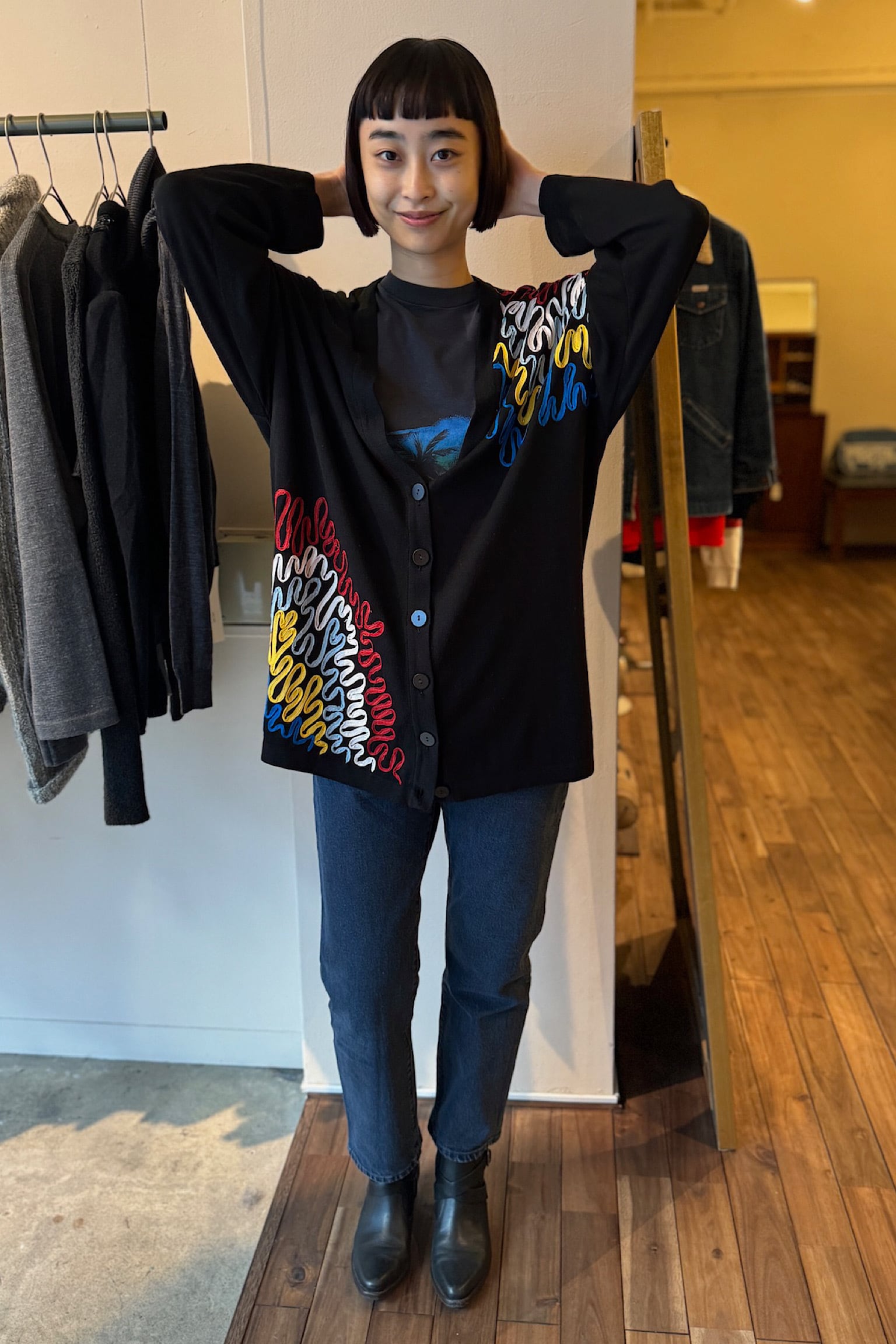 KARIM ブラックカーディガンは、洗練されたデザインとレトロな魅力が融合した一着です。