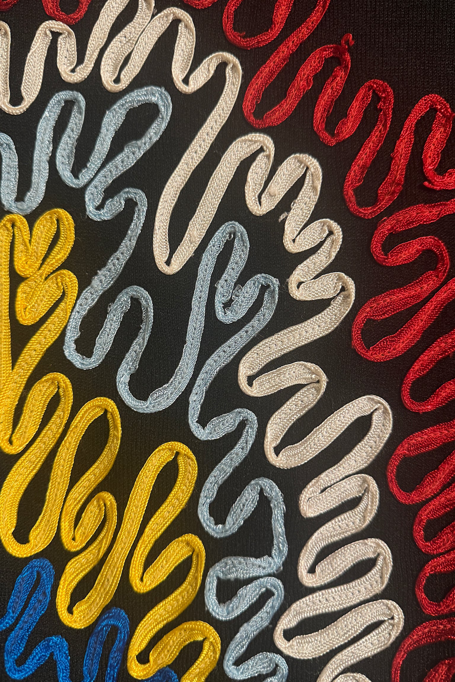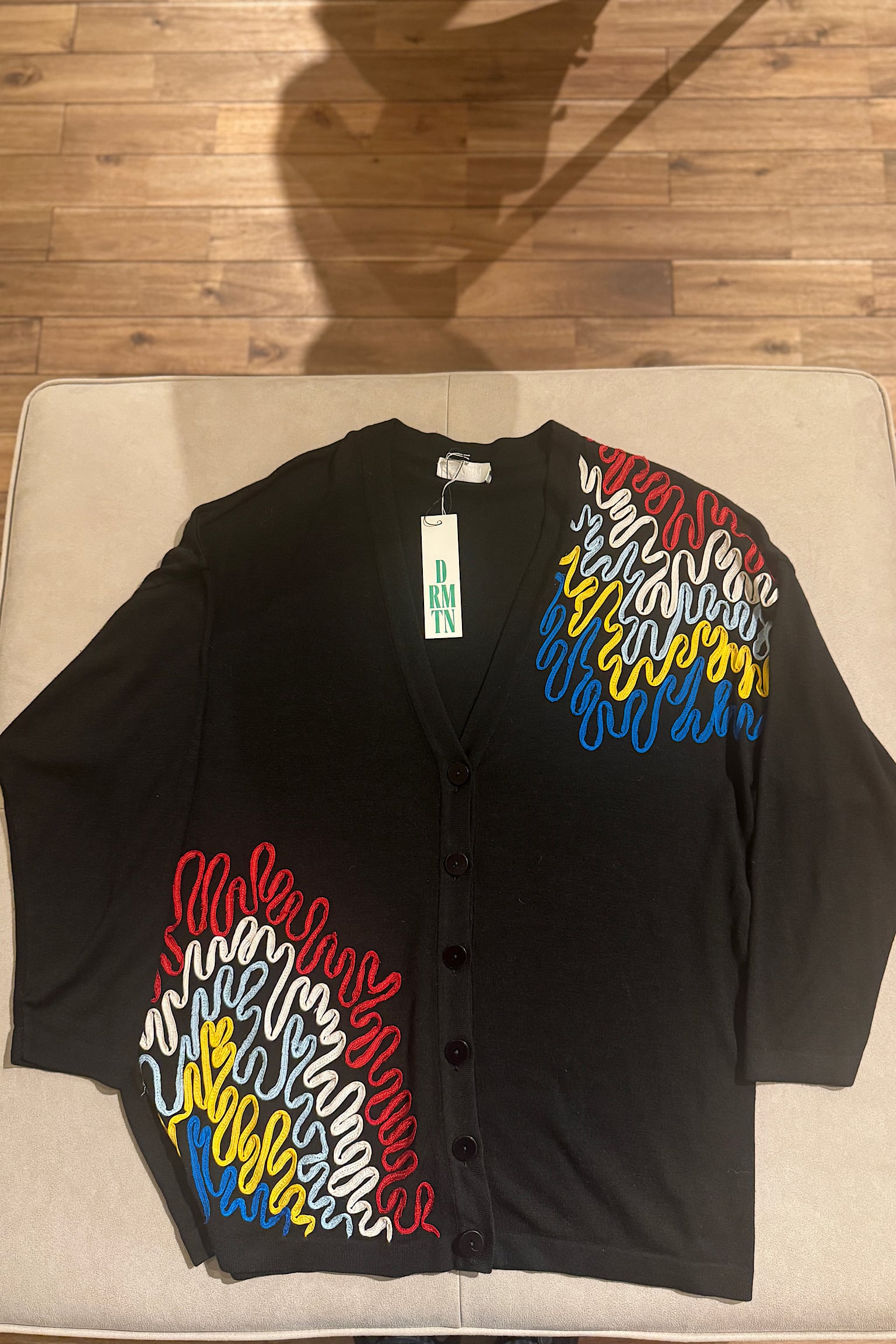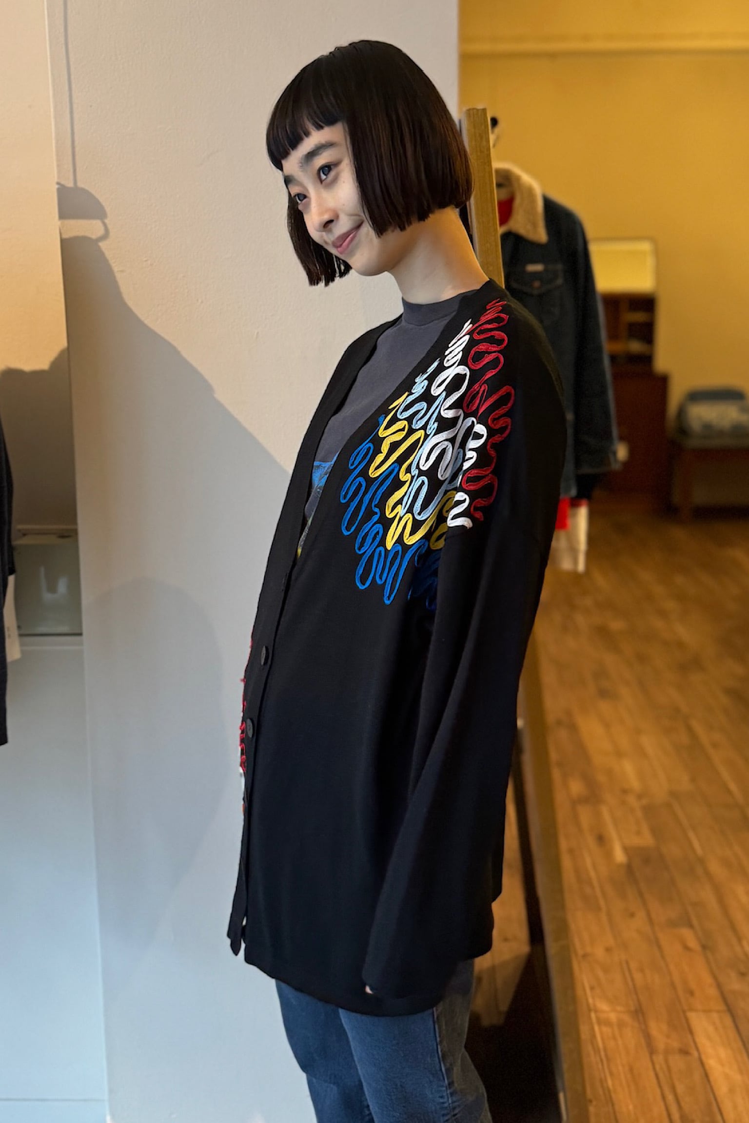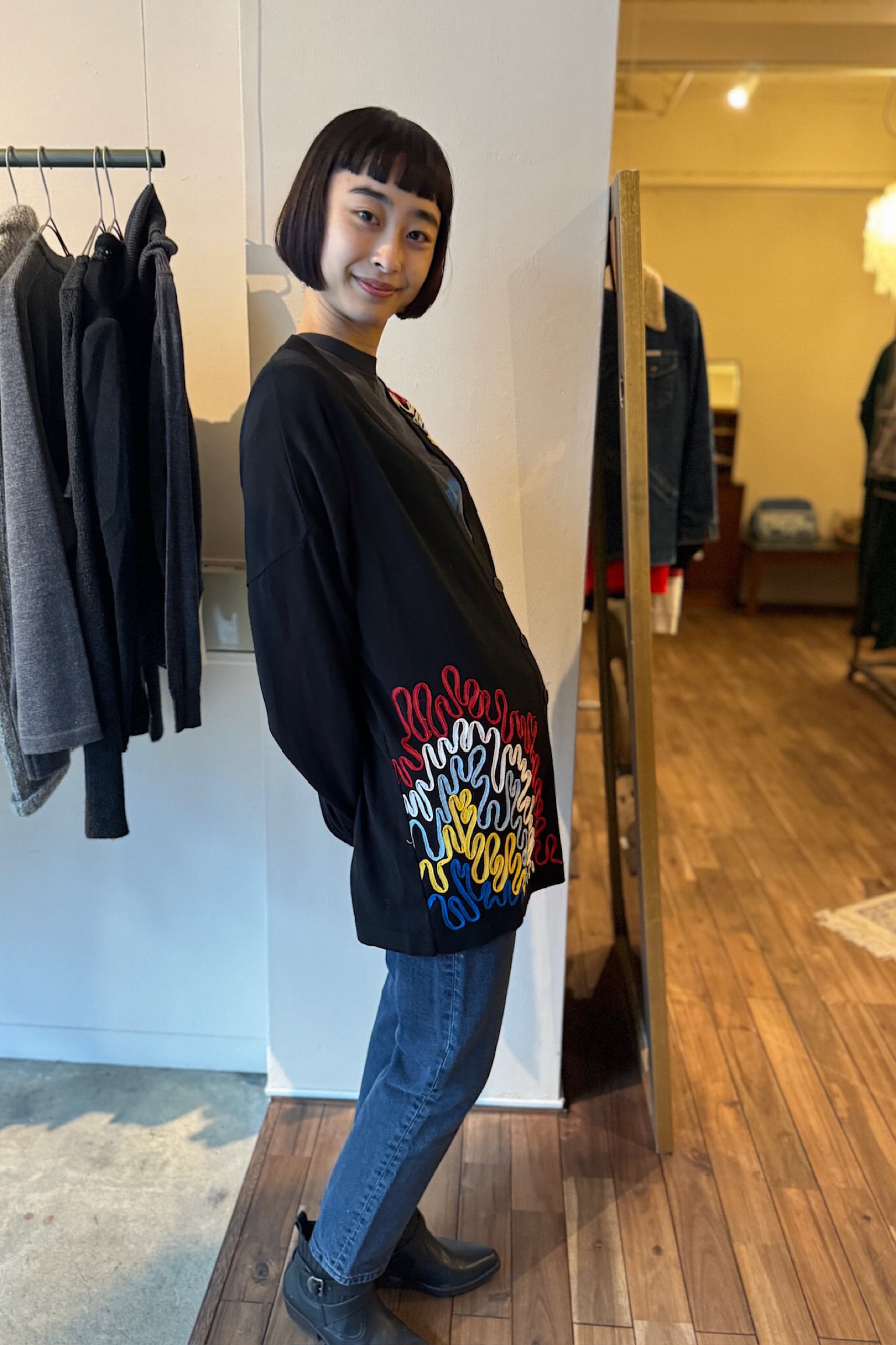 深いブラックの色味が特徴的で、どんなスタイルにも合わせやすく、特にヴィンテージ感あふれる刺繍が施されていることで、一層ユニークな印象を与えます。