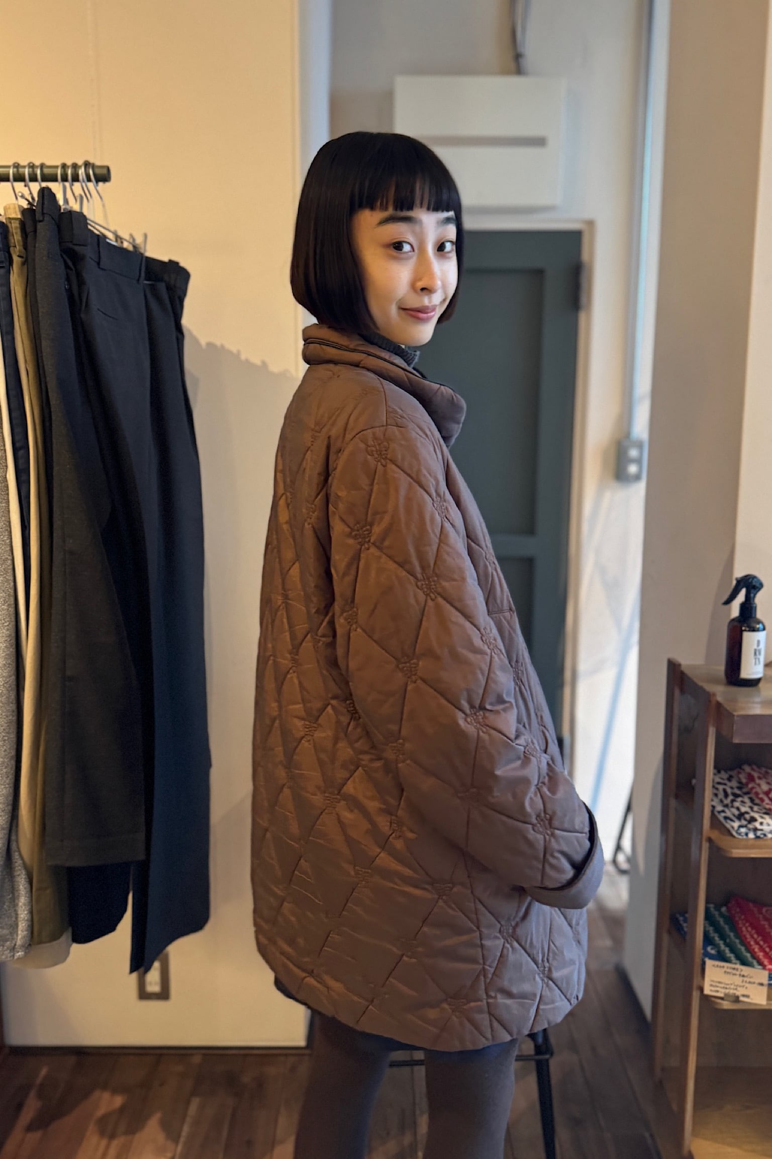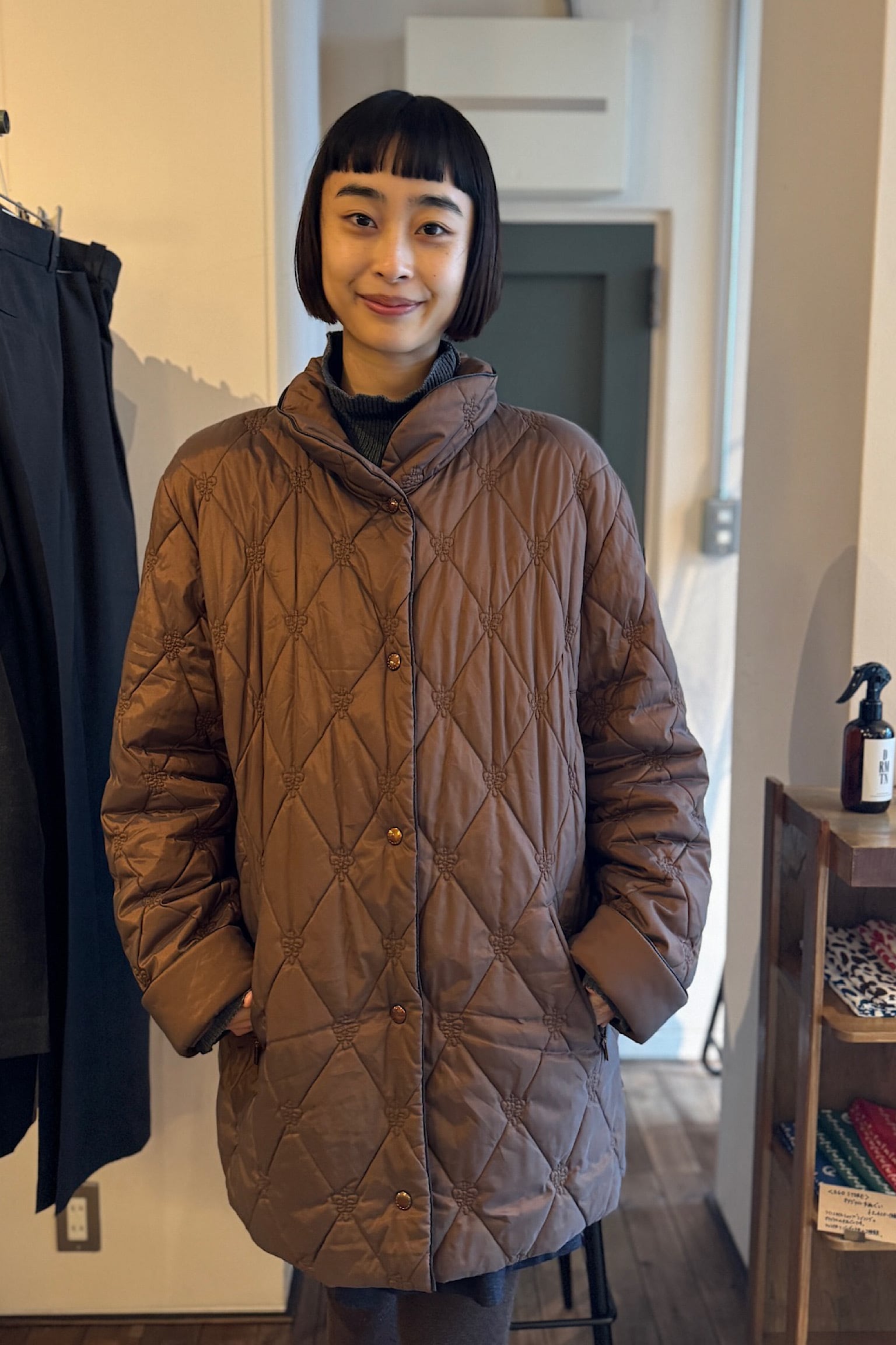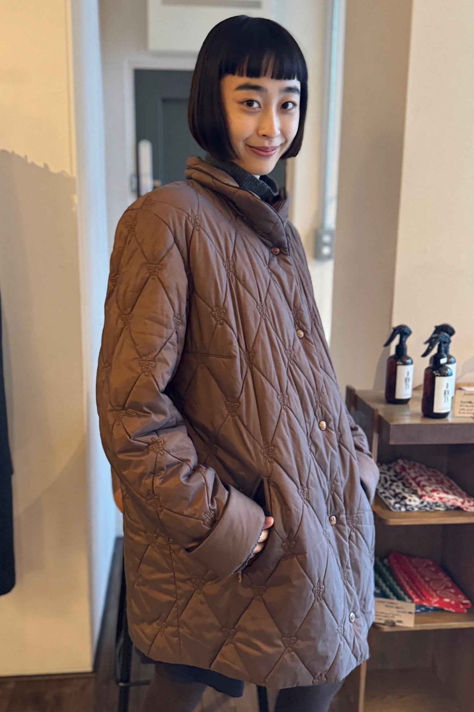 落ち着いたブラウン色のCONCEPT UK ブラウンキルティングコート。