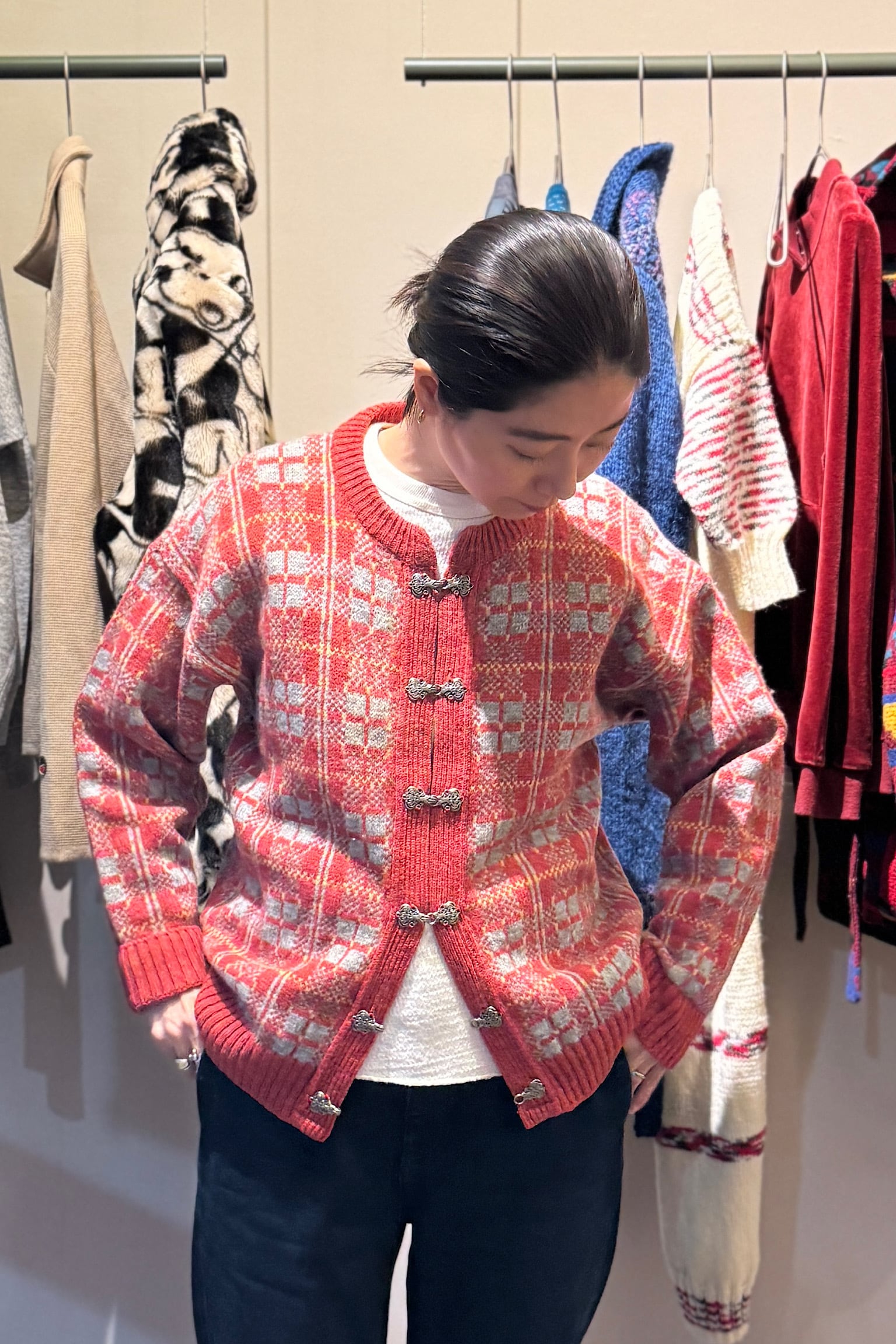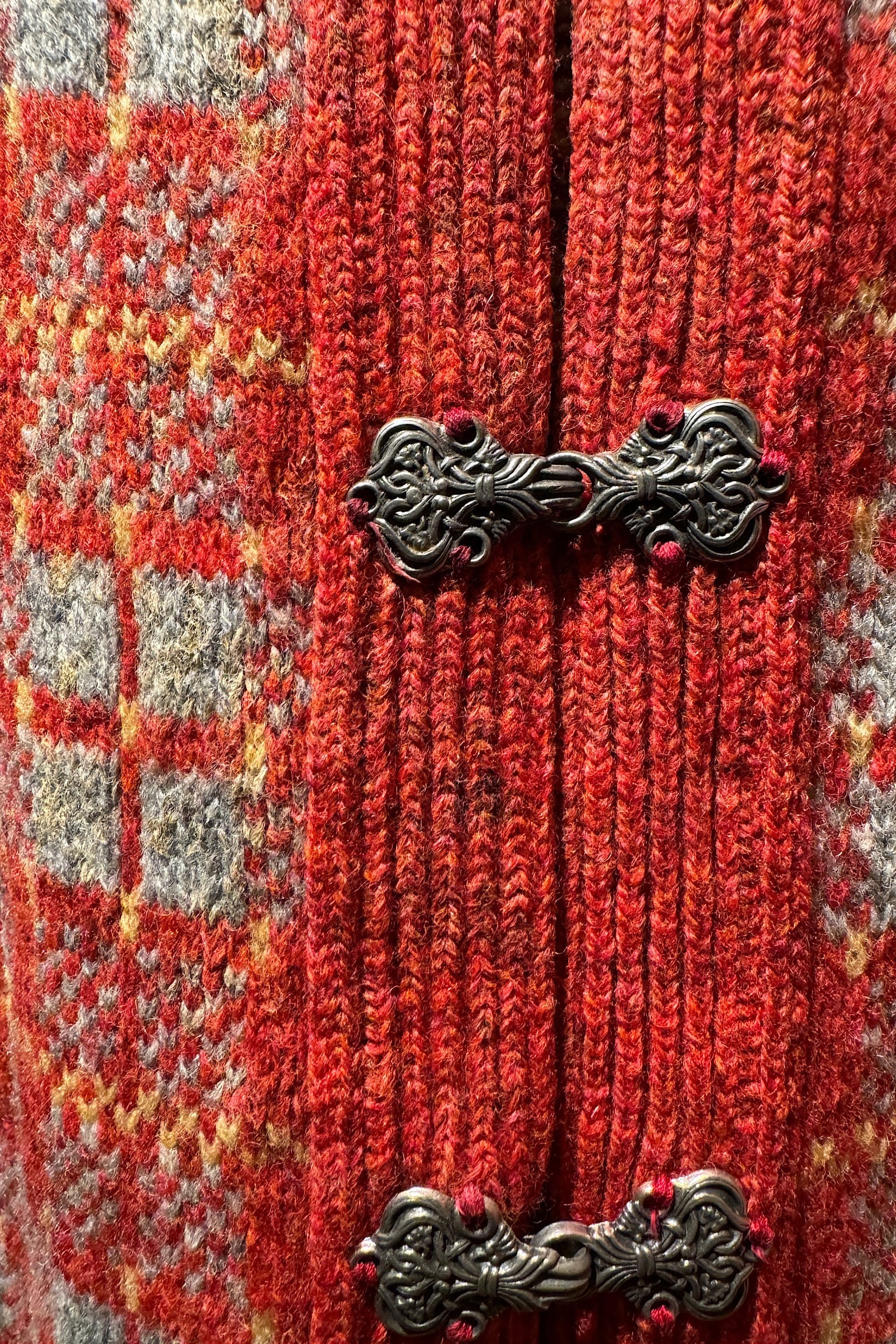 スコットランドの鮮やかなレッドチェック柄が特徴的なカーディガン。