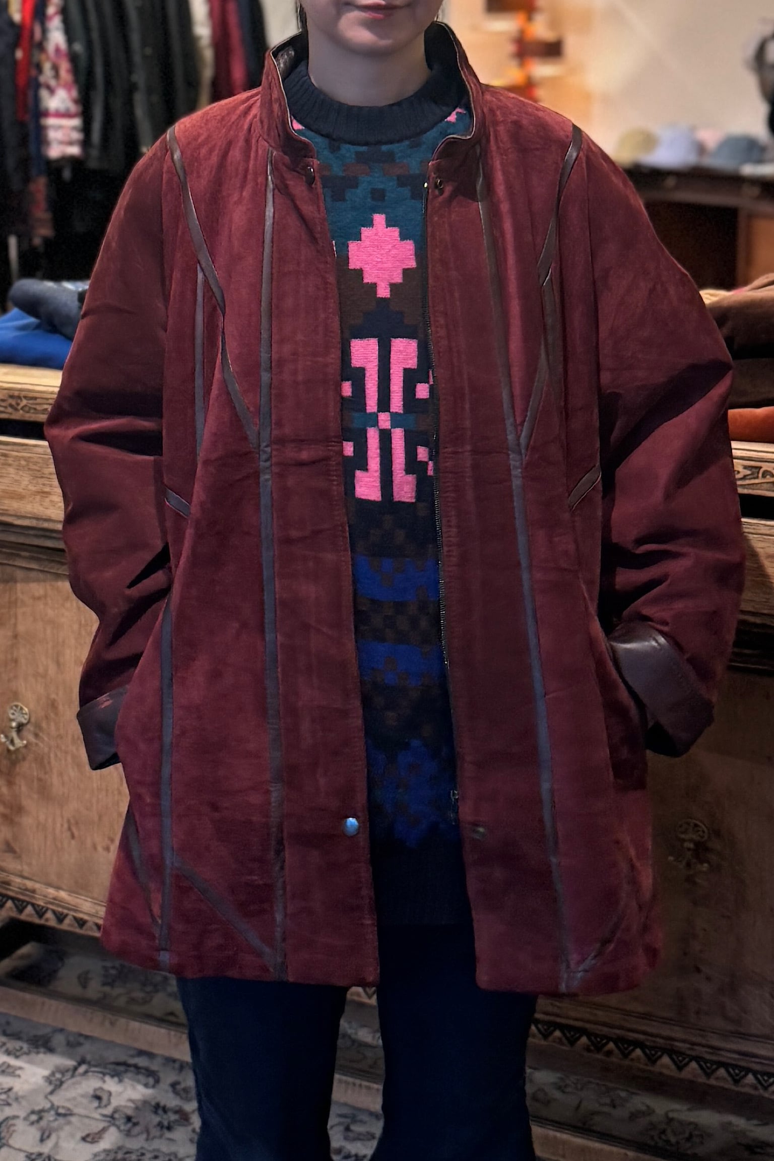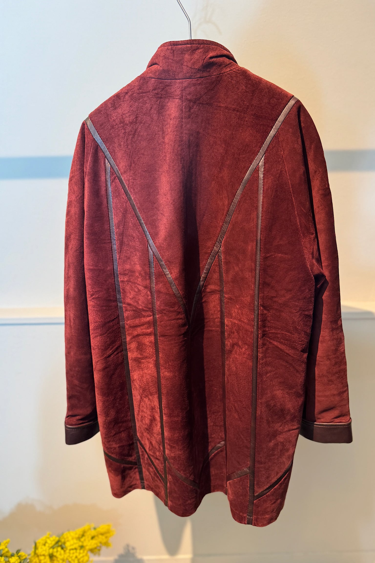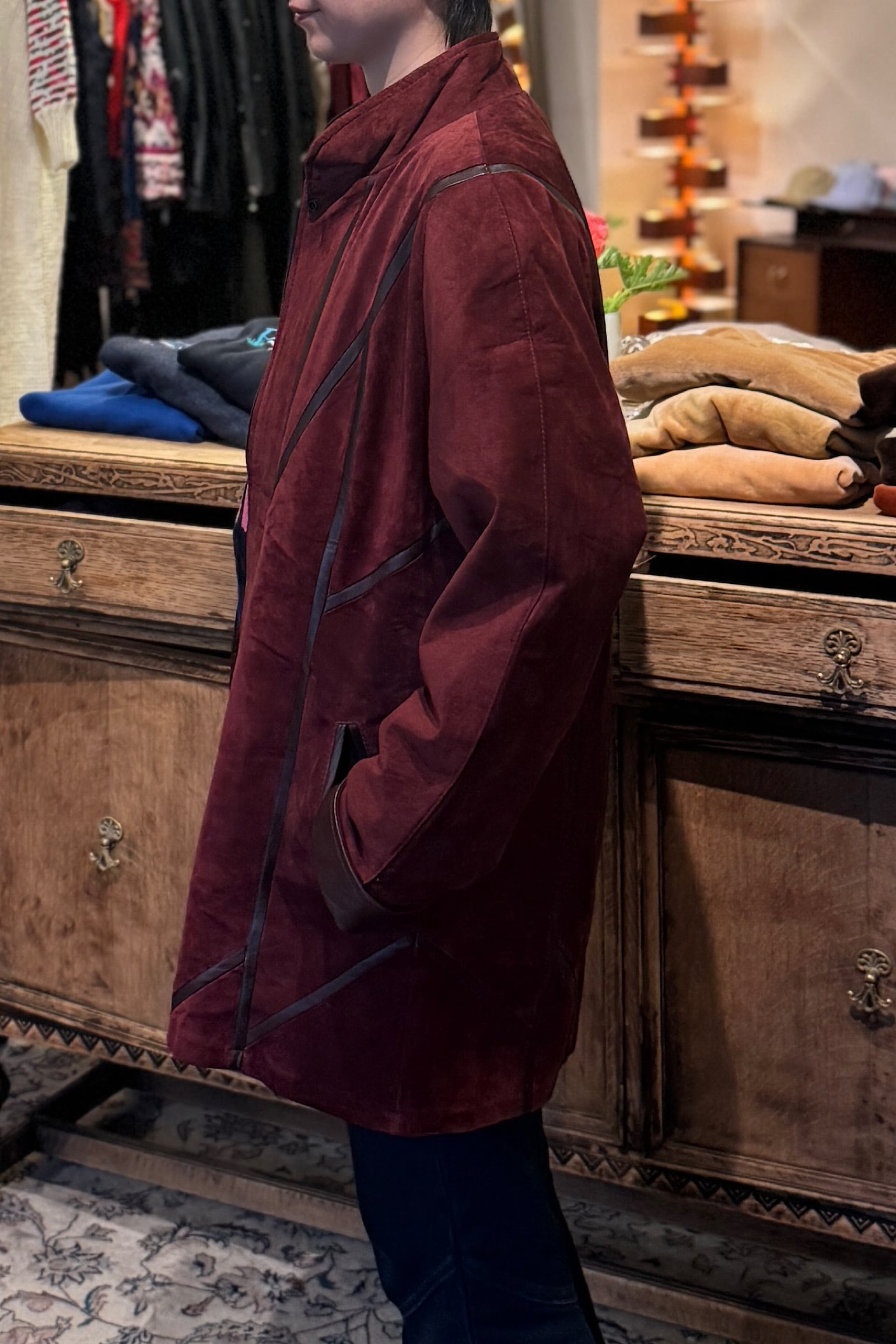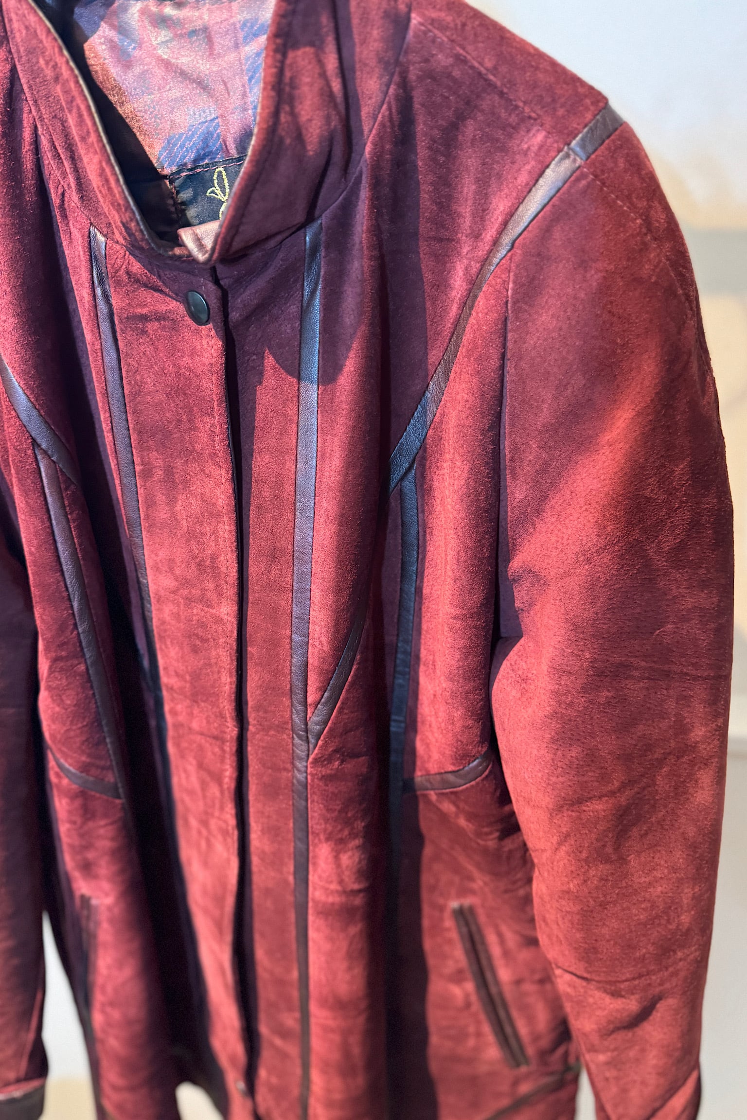 深いバーガンディカラーが際立つMETTINENのスエードパッチワークジャケットは、クラフト感あふれるデザインが魅力です。