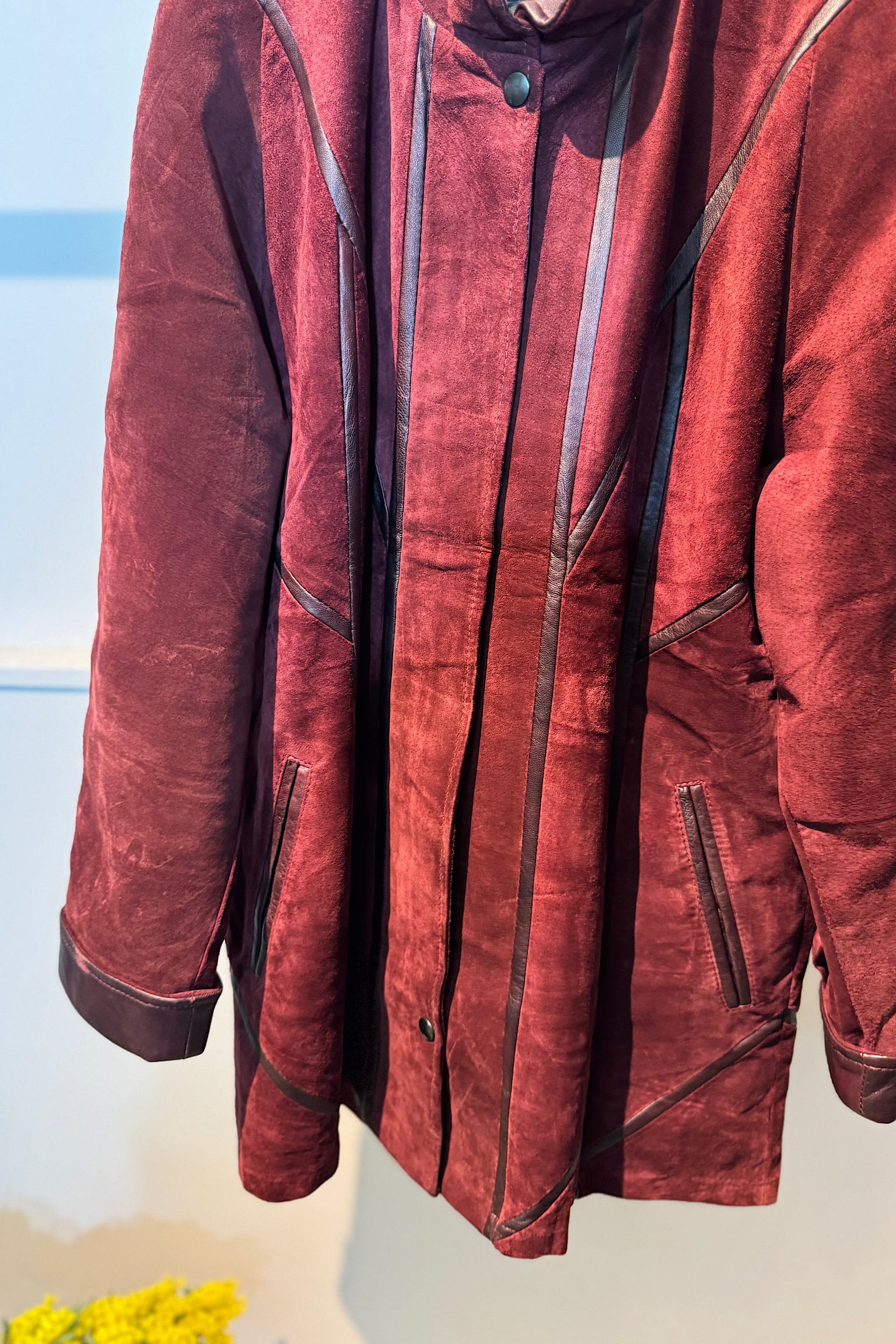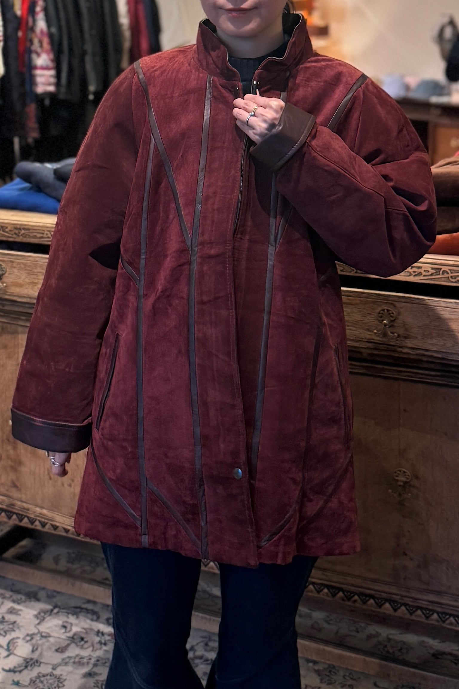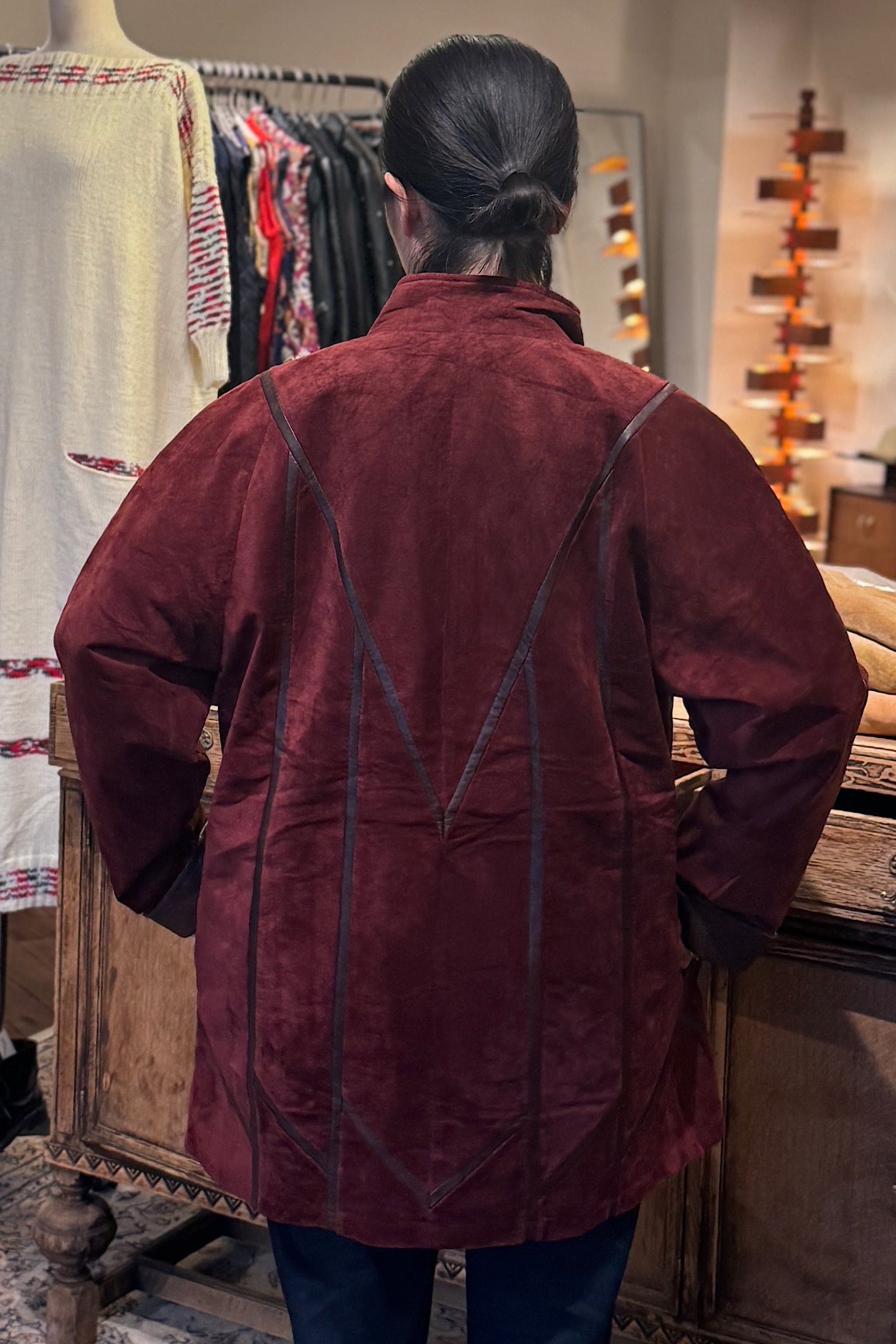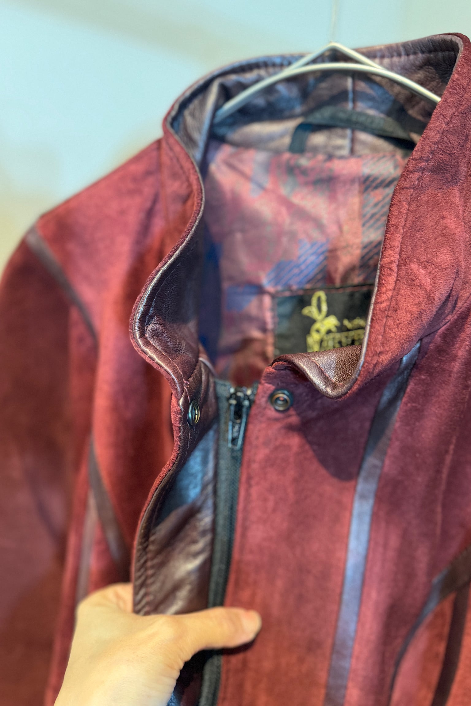 深いバーガンディカラーが際立つMETTINENのスエードパッチワークジャケットは、クラフト感あふれるデザインが魅力です。