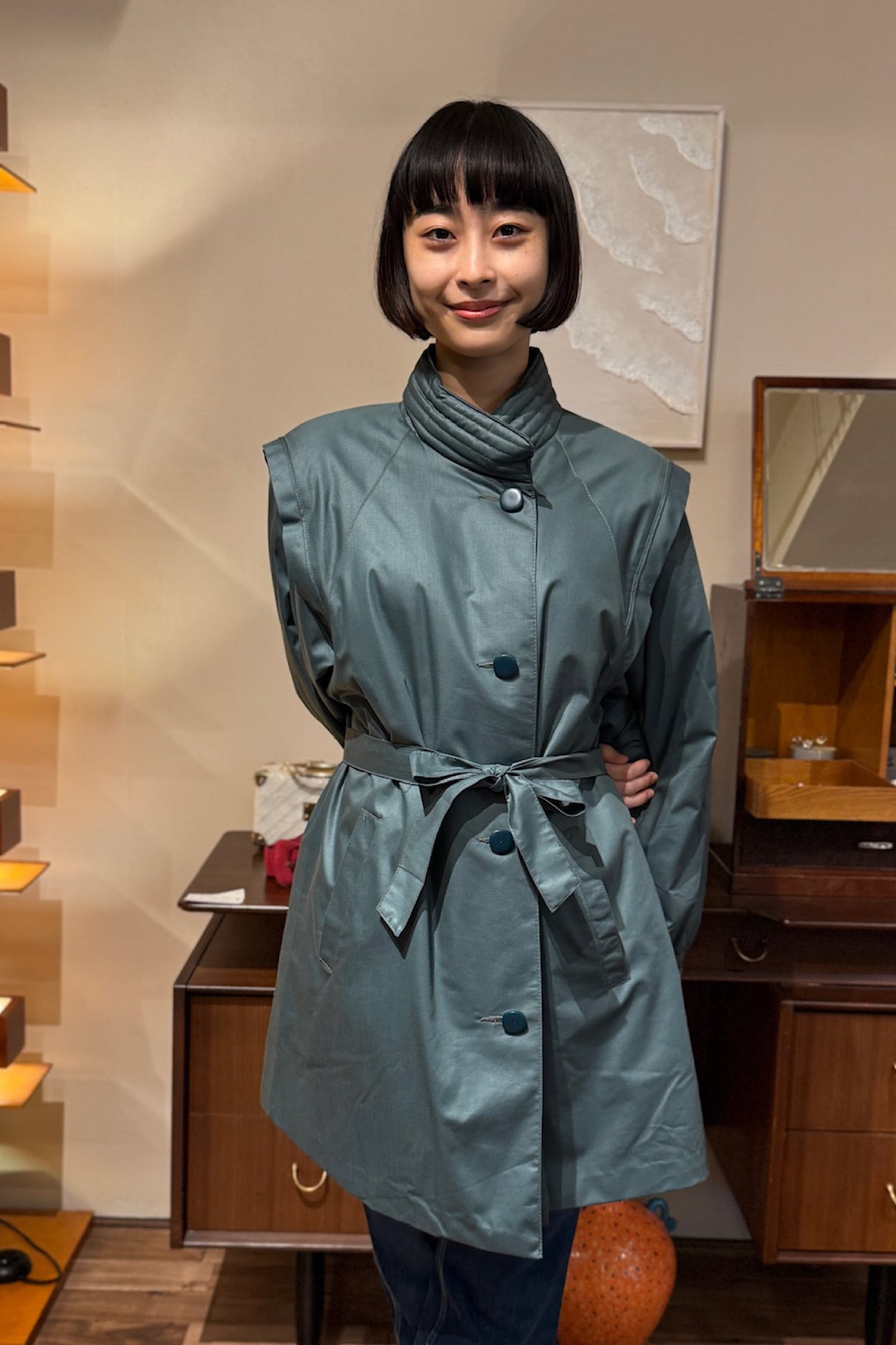 このコートは、美しいグリーンのキルティングが特徴で、シンプルながらも目を引くスタイルを演出します。