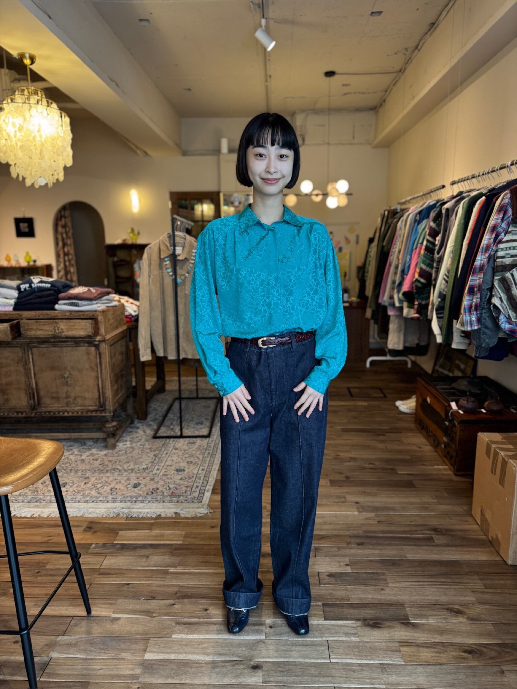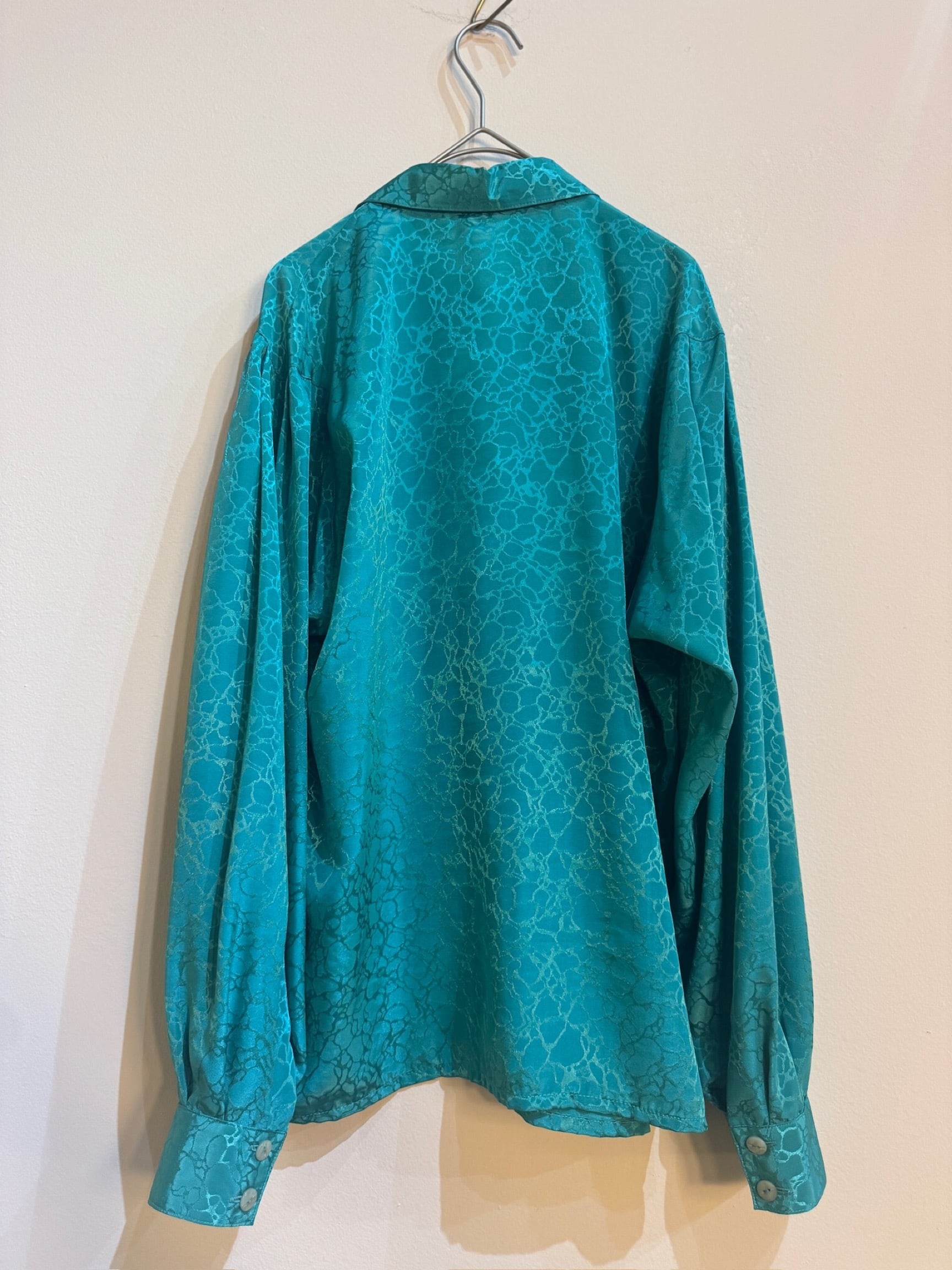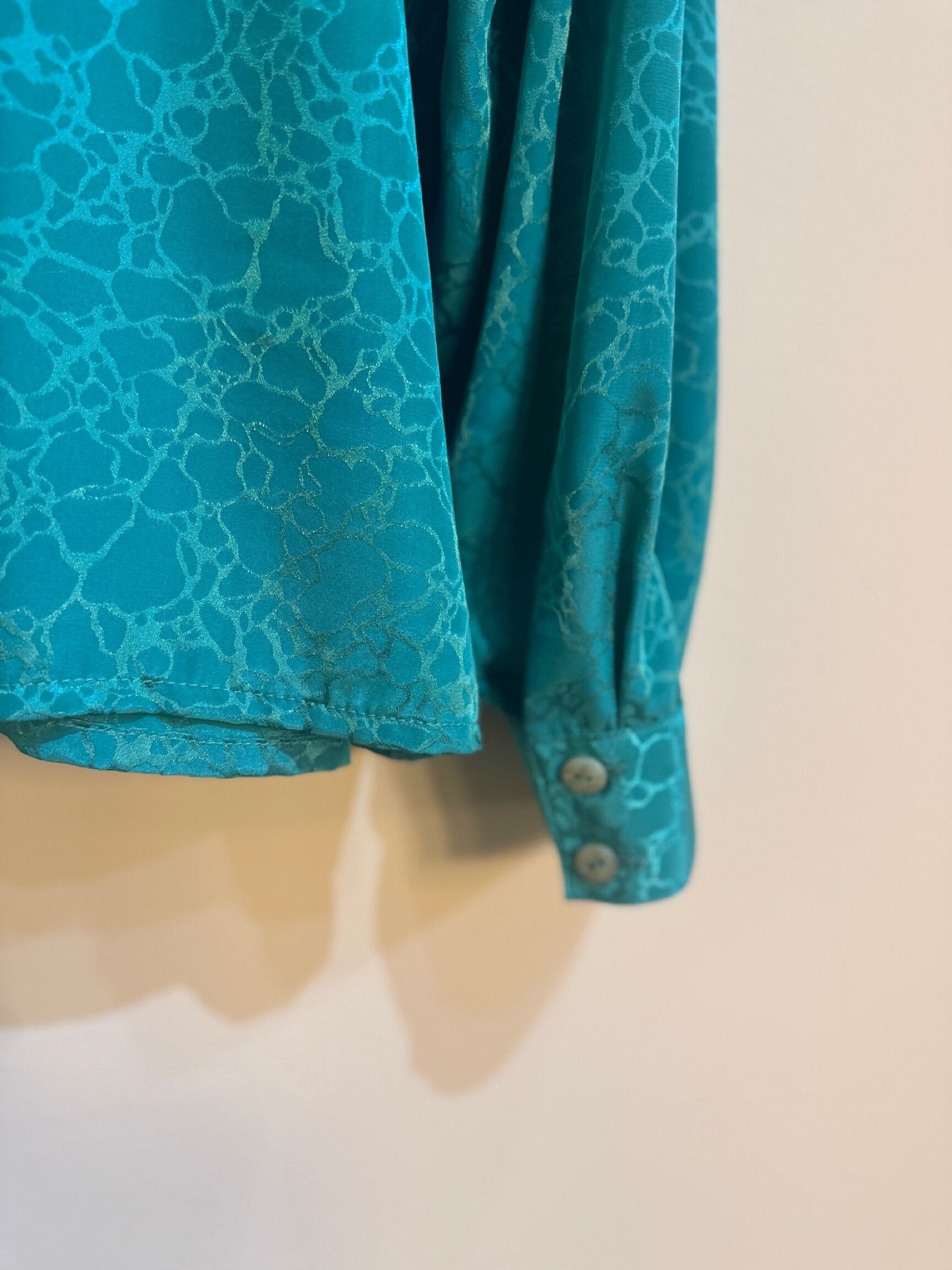 光沢感がエレガントなsommermann modellのエメラルドグリーンブラウス。