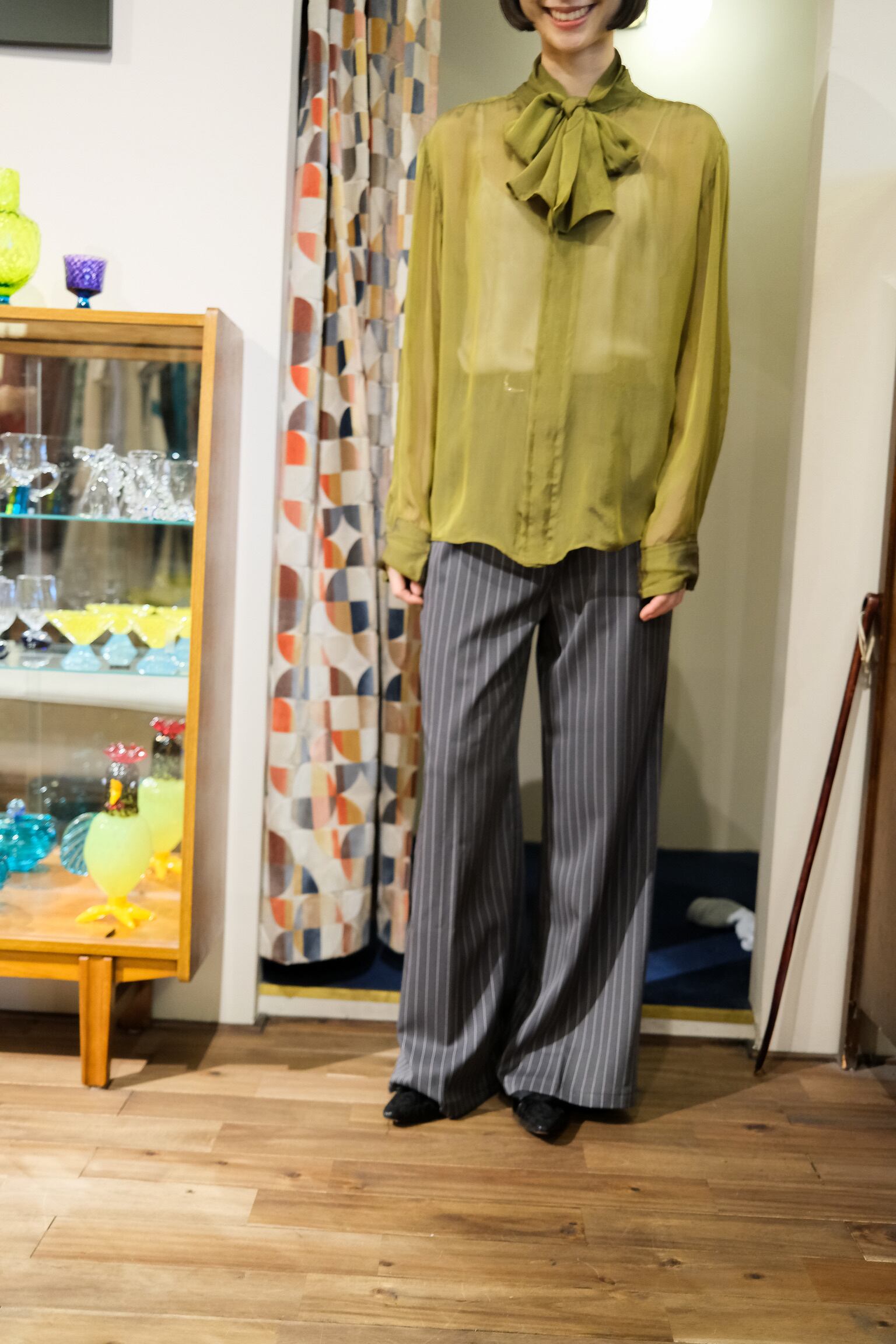 このスラックスは、ヴィンテージ特有の風合いが感じられ、素材感にもこだわりがあります。柔らかな生地が肌に心地よくフィットし、リラックスした雰囲気を演出。