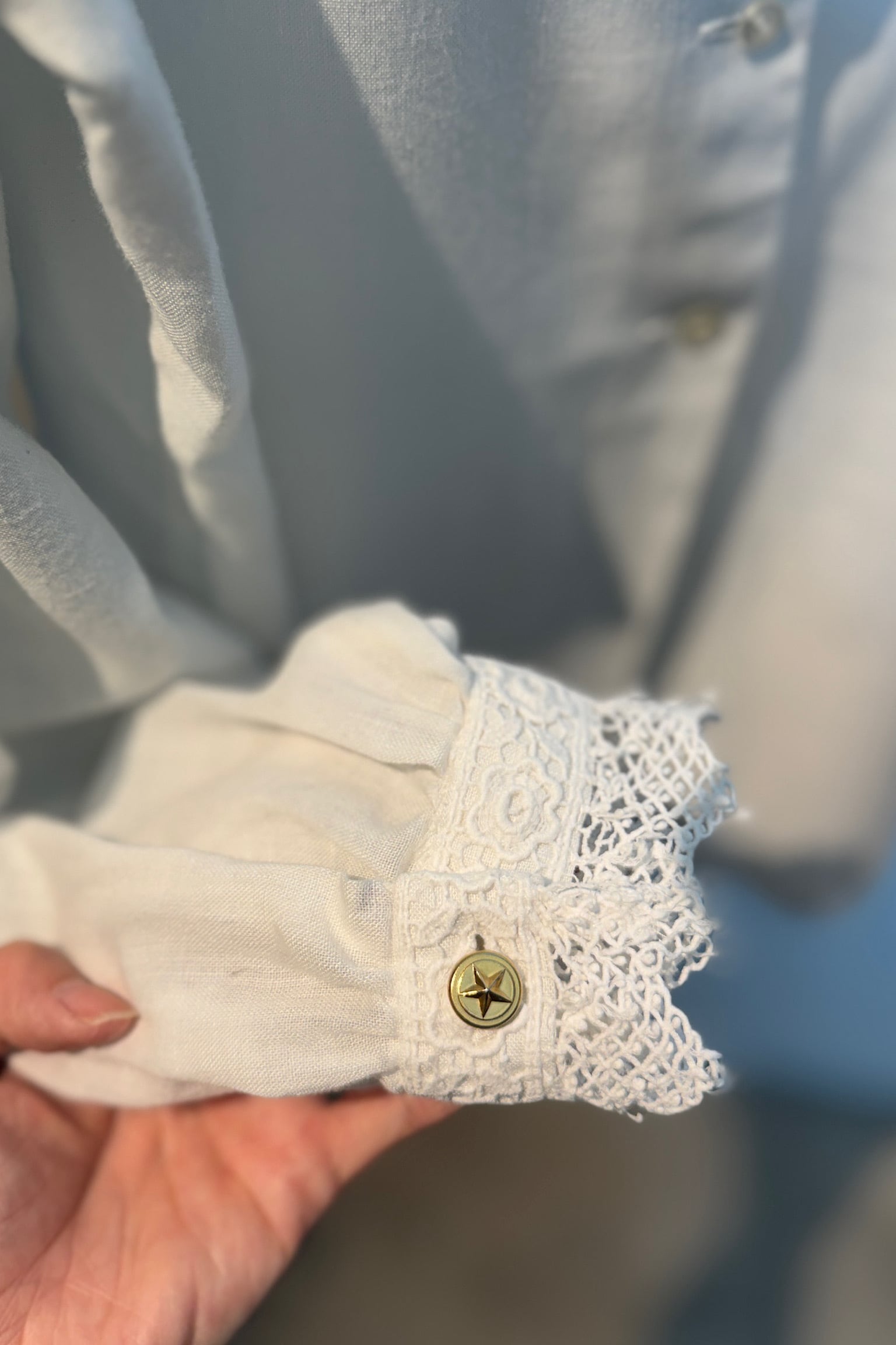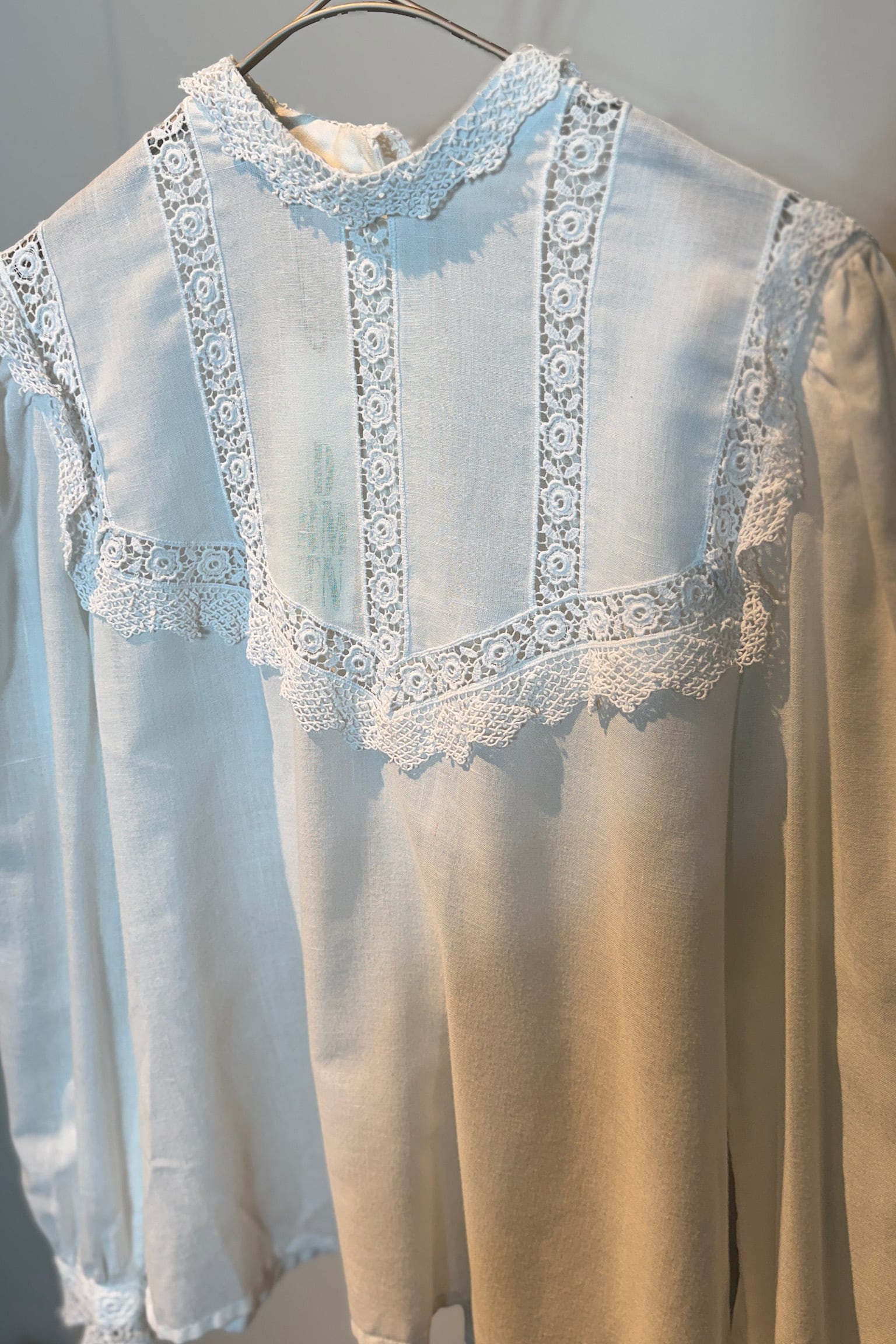 柔らかなホワイトカラーと繊細なレース使いが特徴で、クラシカルな印象を与えてくれます。特にハイネックのディテールが首元を美しく引き立て、大人の女性にぴったりの品格を感じさせます。