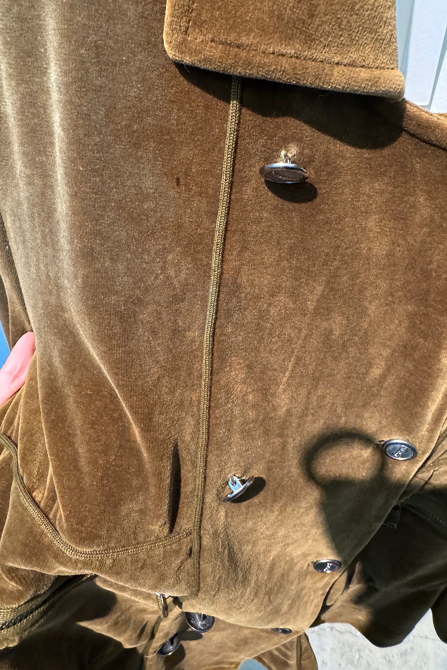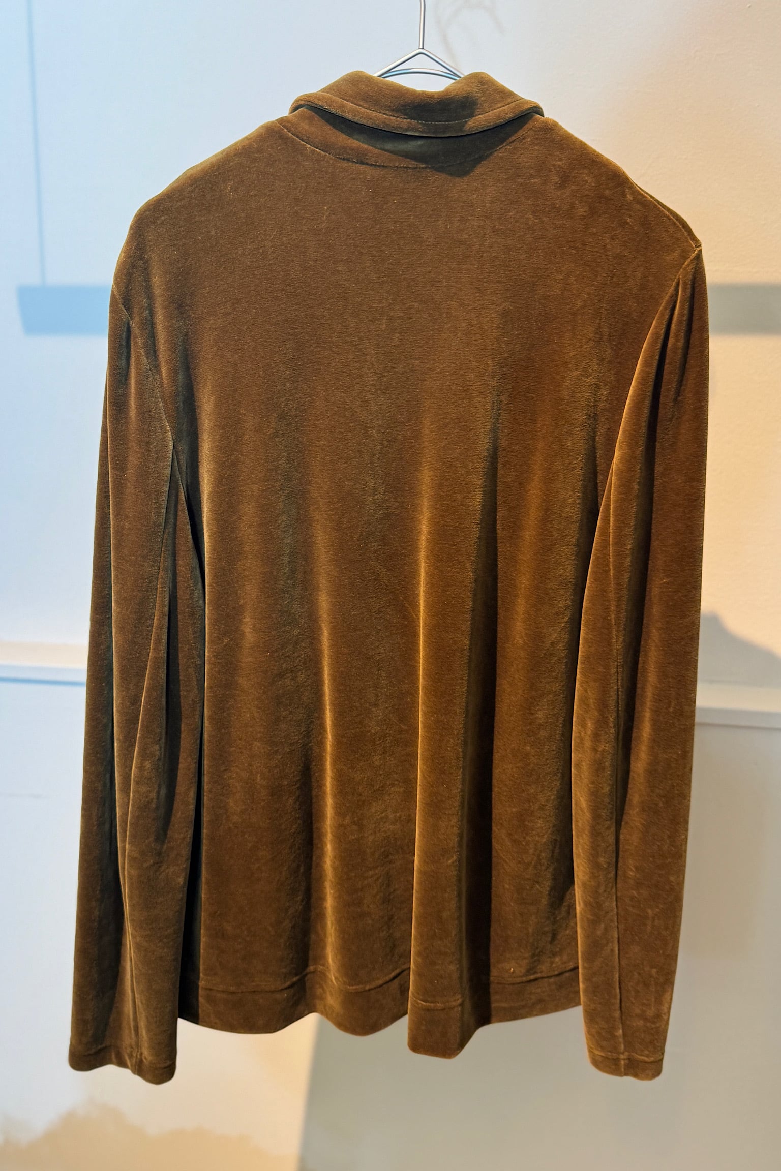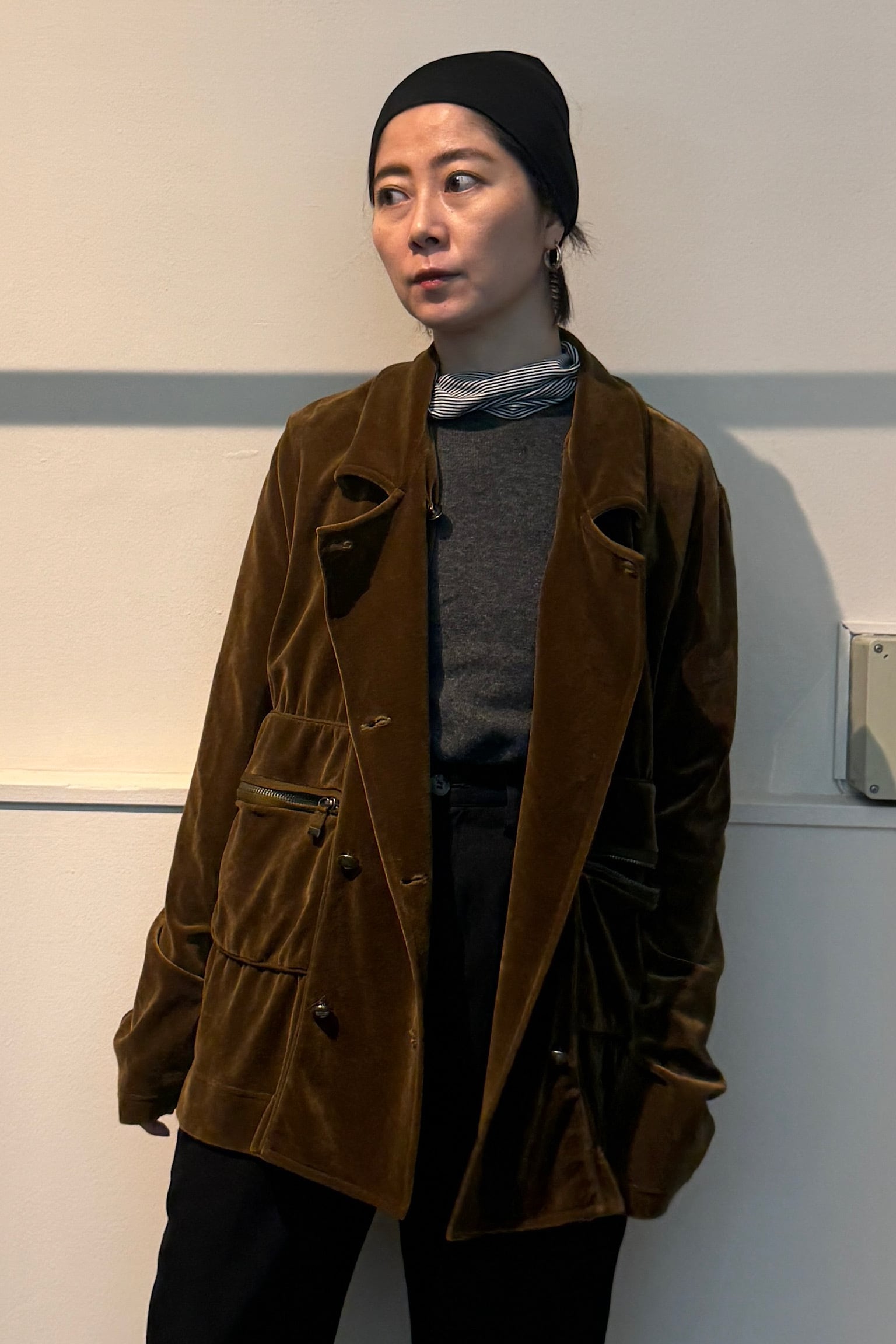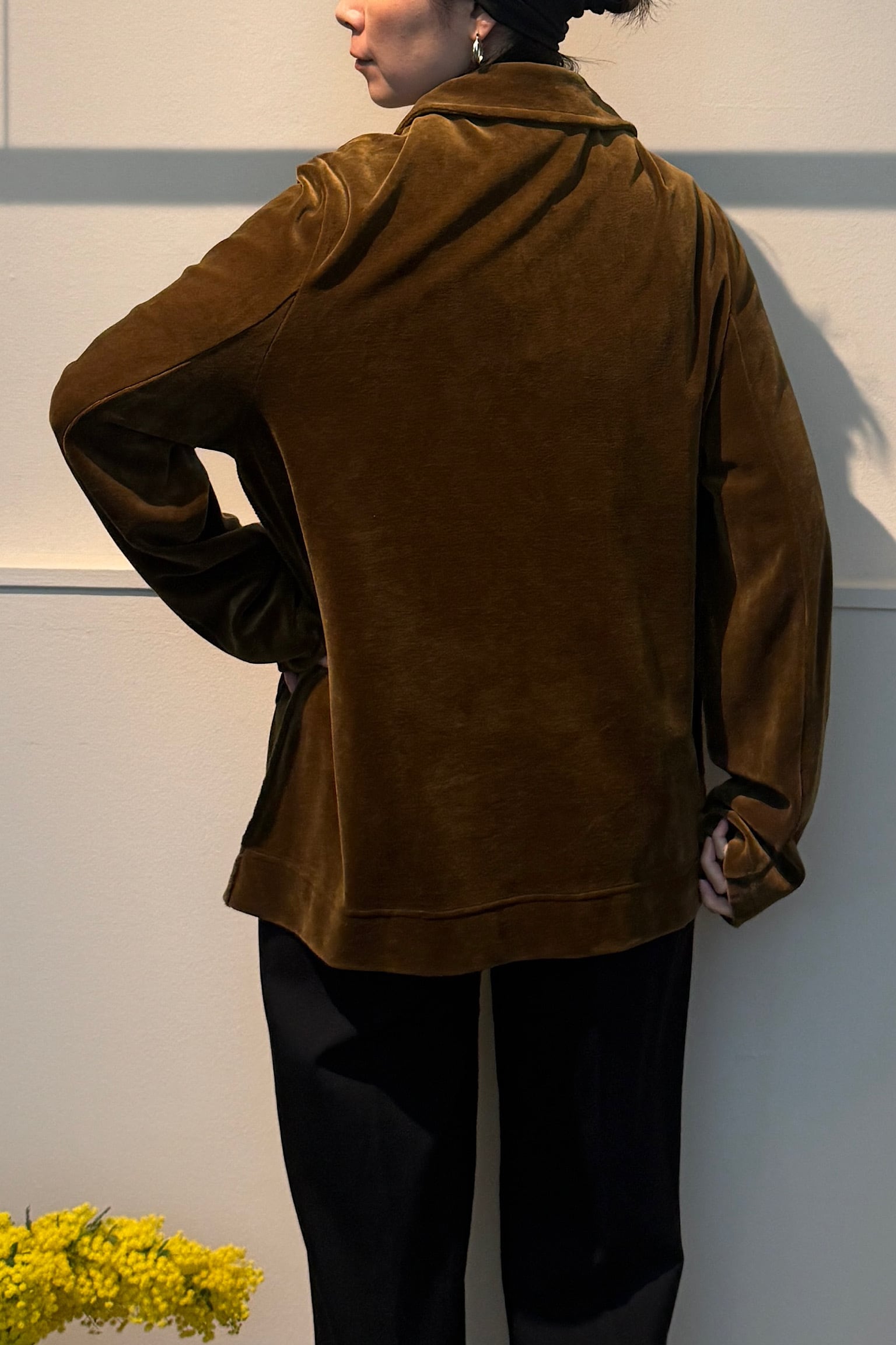 柔らかなベロア素材は光が当たると美しい光沢を放ち、クラシックな雰囲気とモダンなエッセンスを融合させています。特にダブルジャケットならではのシルエットは、どんなスタイルにも品格を添えてくれます。