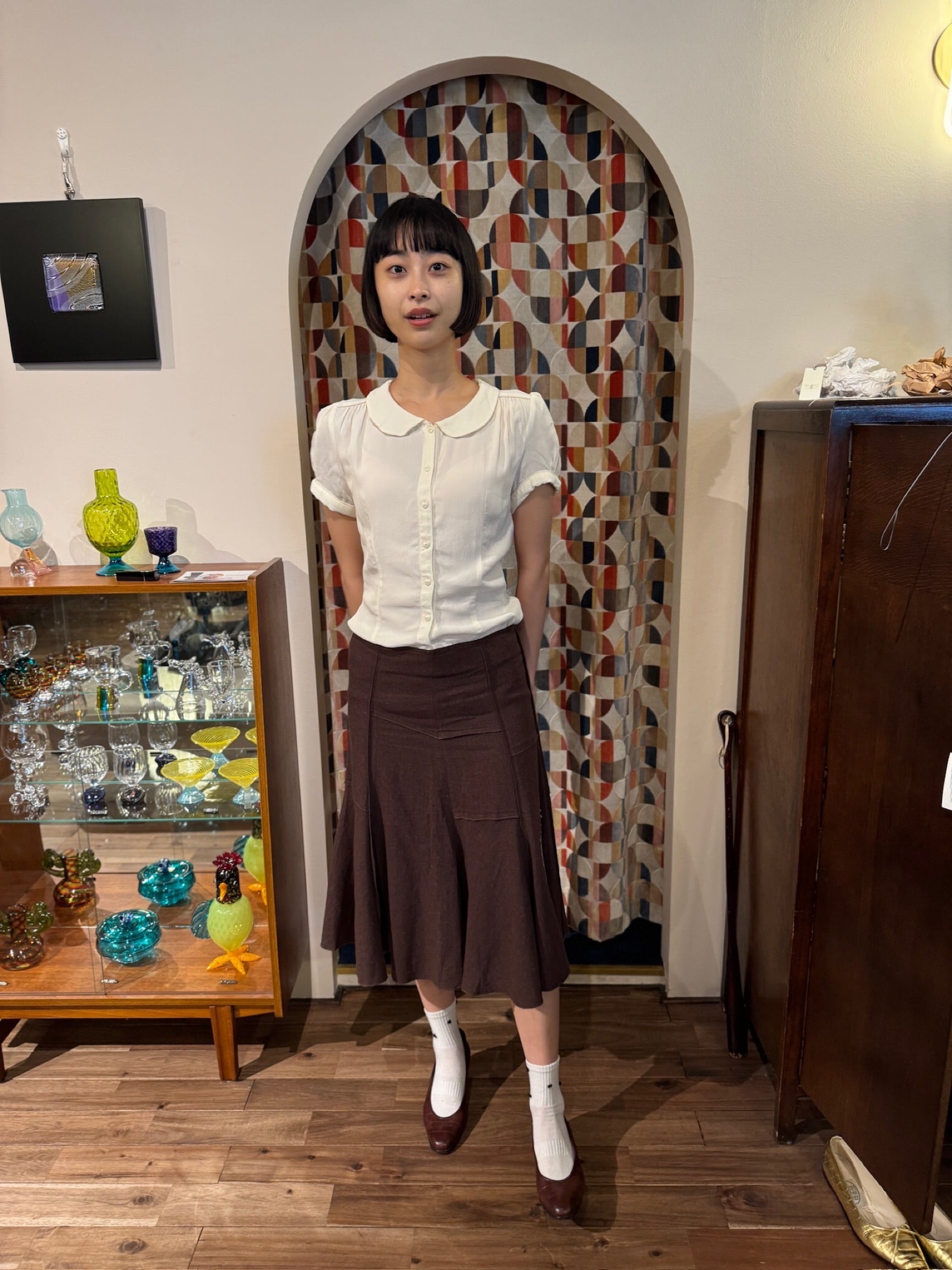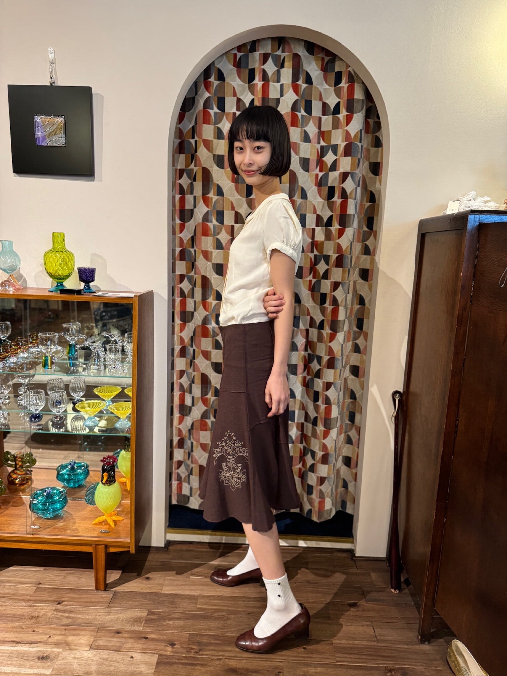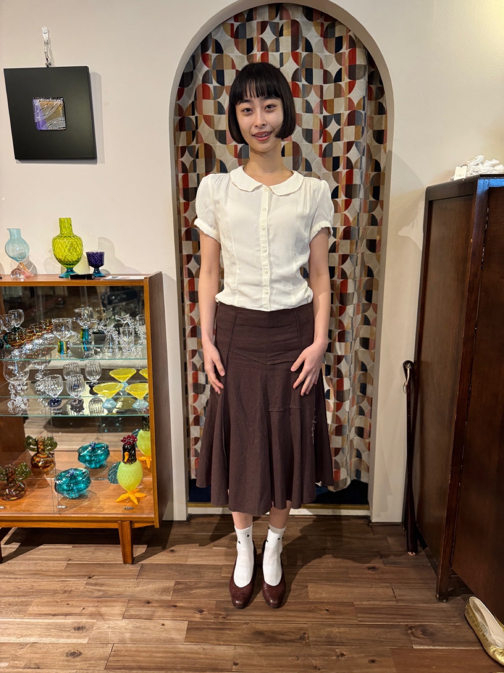 腰回りはスッキリとフィットし、裾に向かって贅沢に広がるフレアシルエット。歩くたびに揺れる優雅な動きが魅力です。