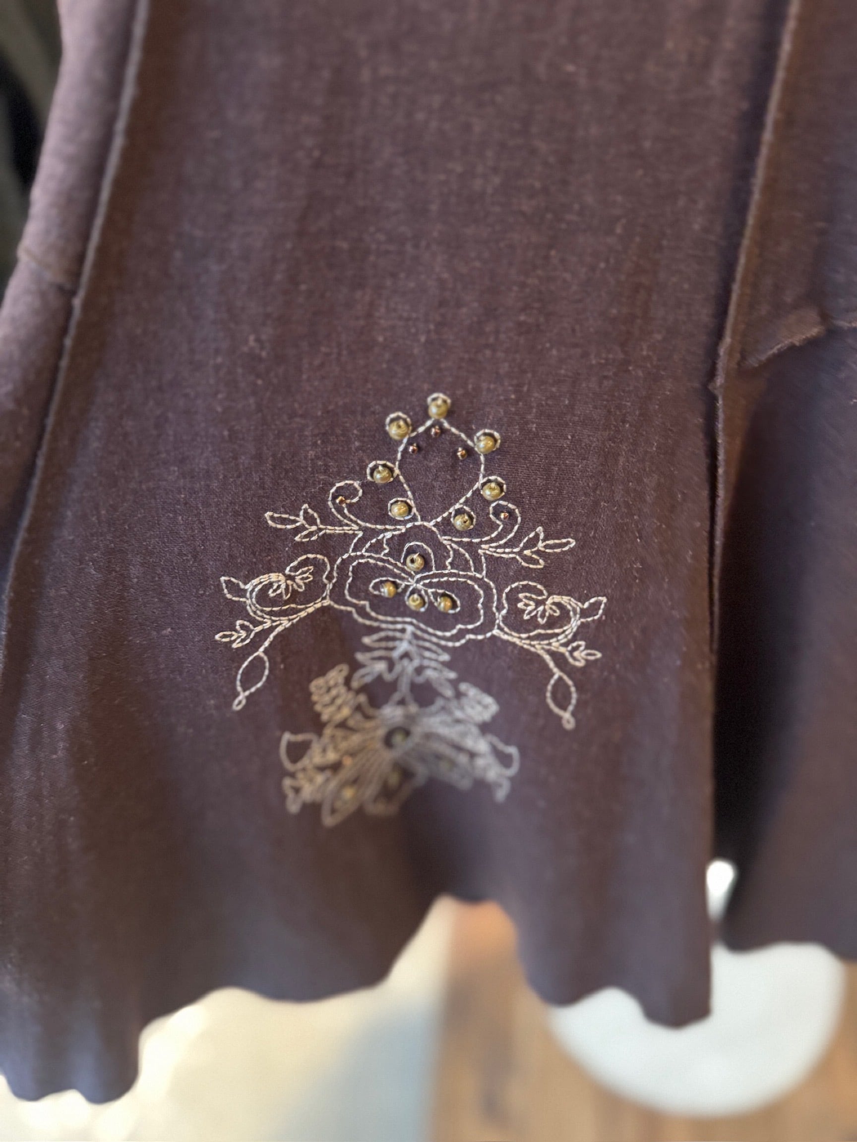 前面にはボタニカルモチーフの繊細な刺繍が施され、さらにゴールド系のビーズがあしらわれており、ヴィンテージらしい上品な華やかさを添えています。