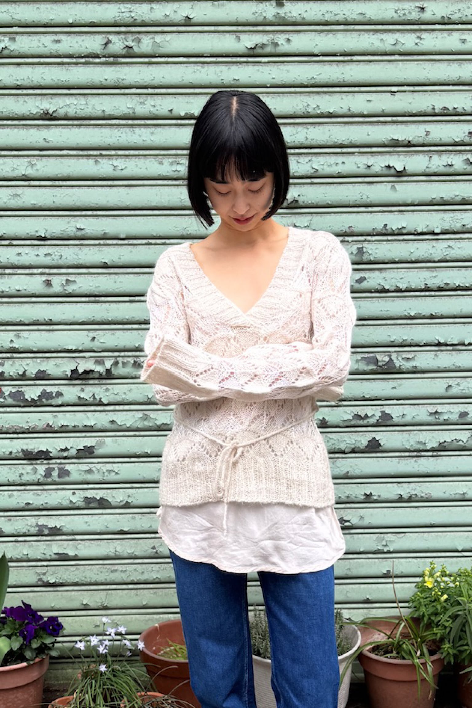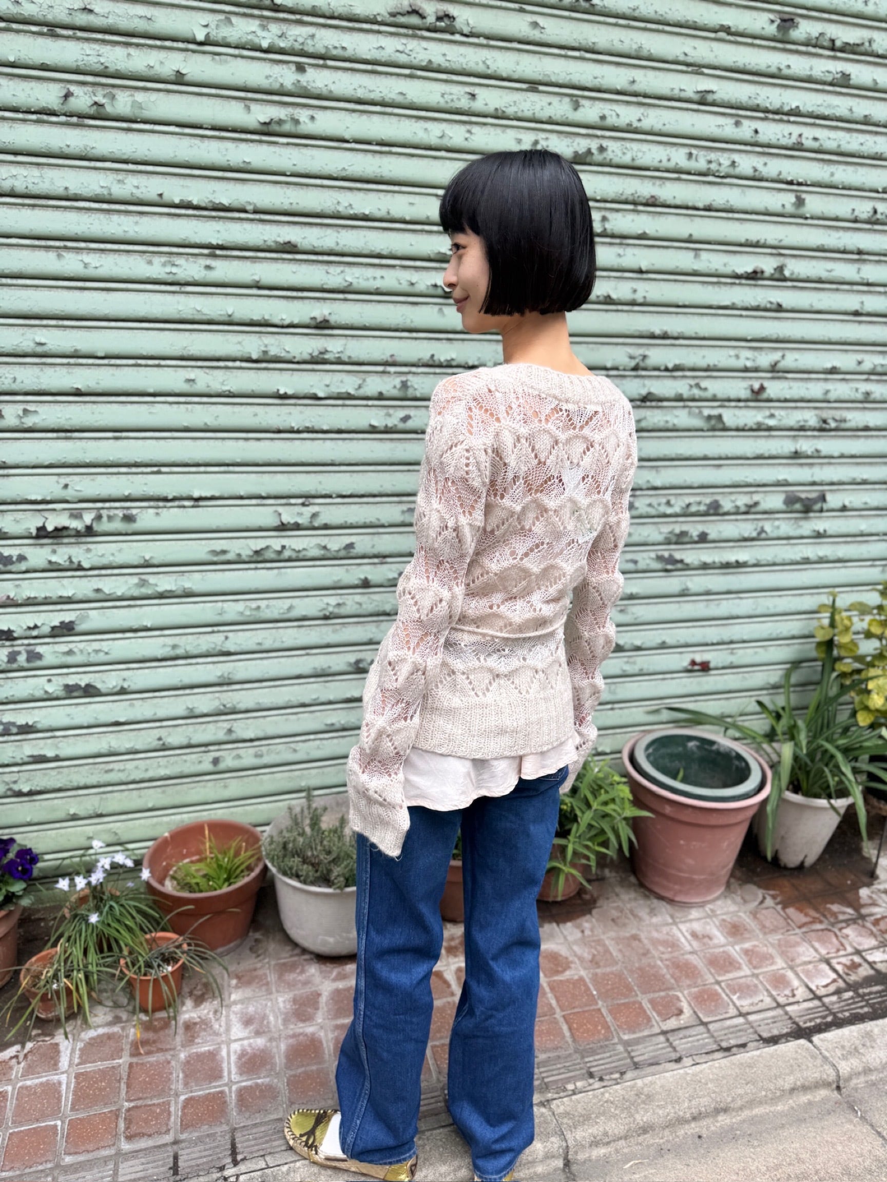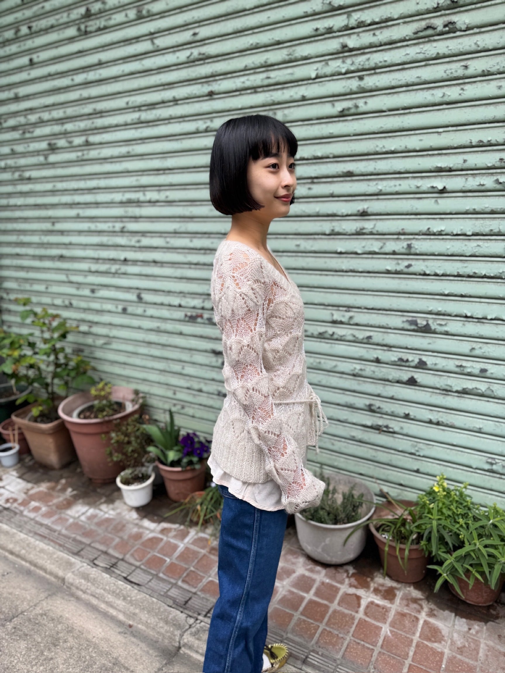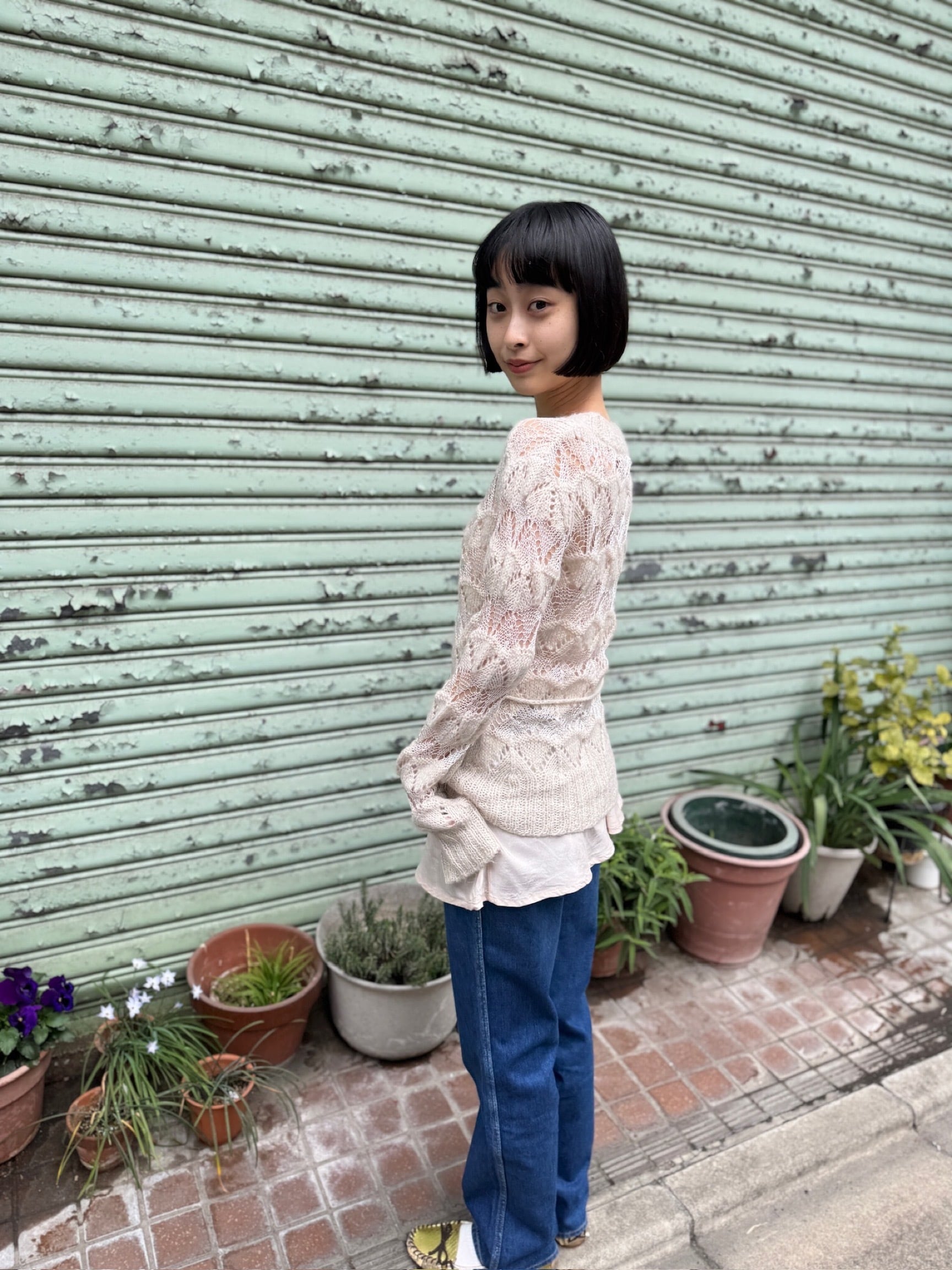 柔らかなニット素材が肌に心地よく、適度な厚みで温かさを保ちながらも透け感があるため軽やかな着心地。