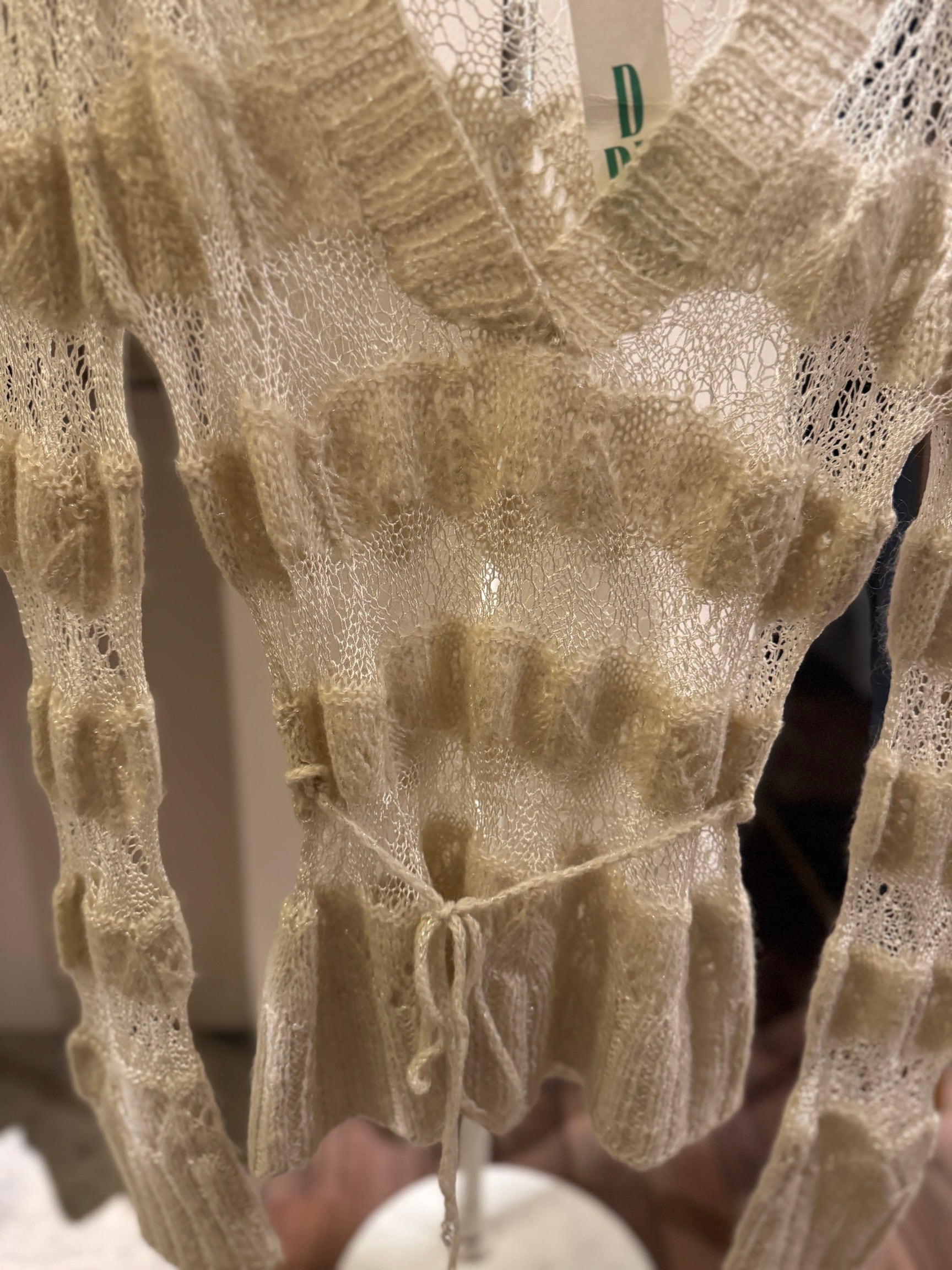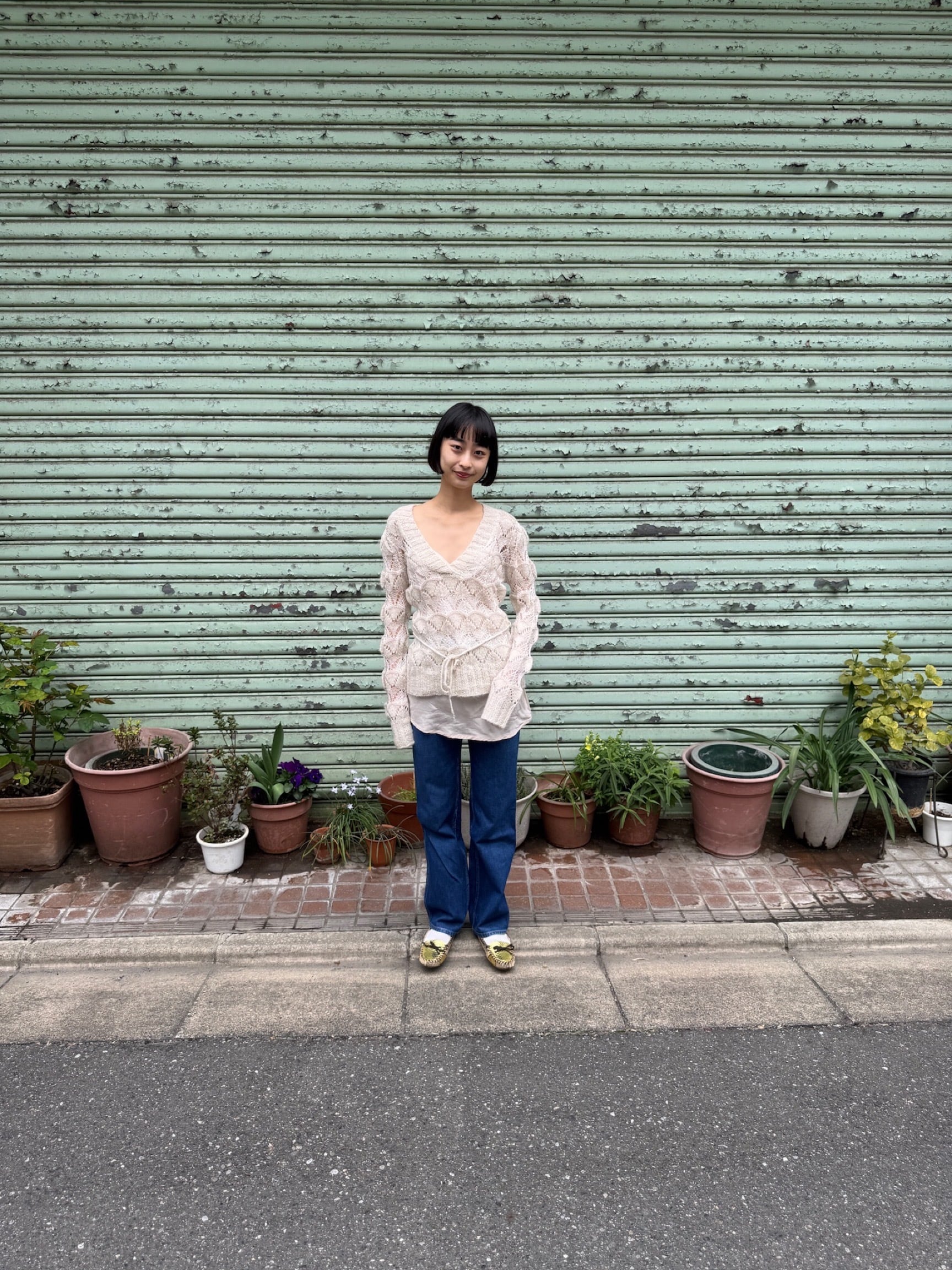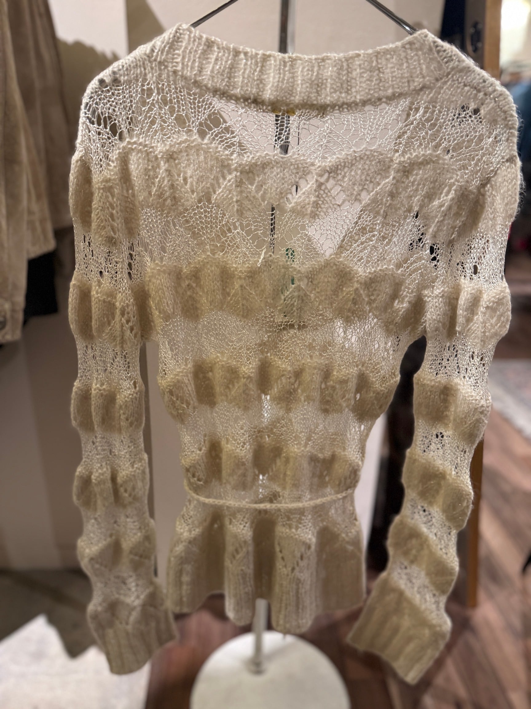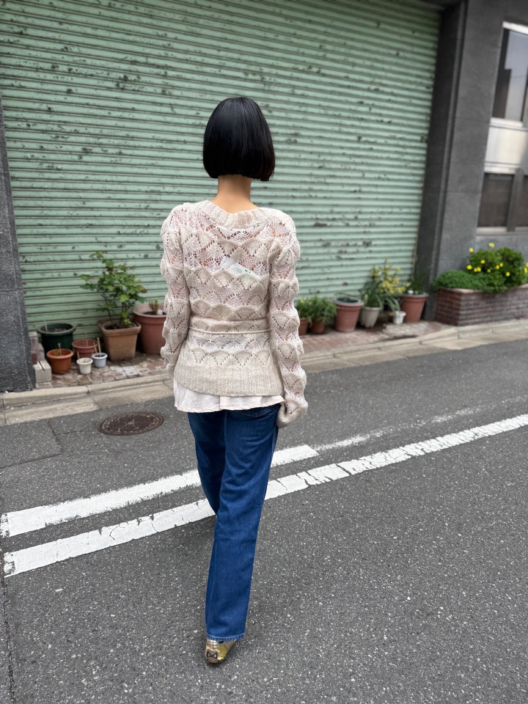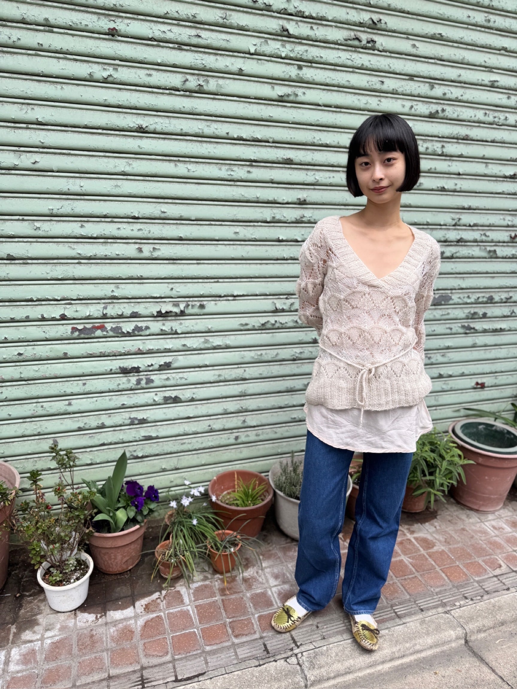 柔らかなニット素材が肌に心地よく、適度な厚みで温かさを保ちながらも透け感があるため軽やかな着心地。
