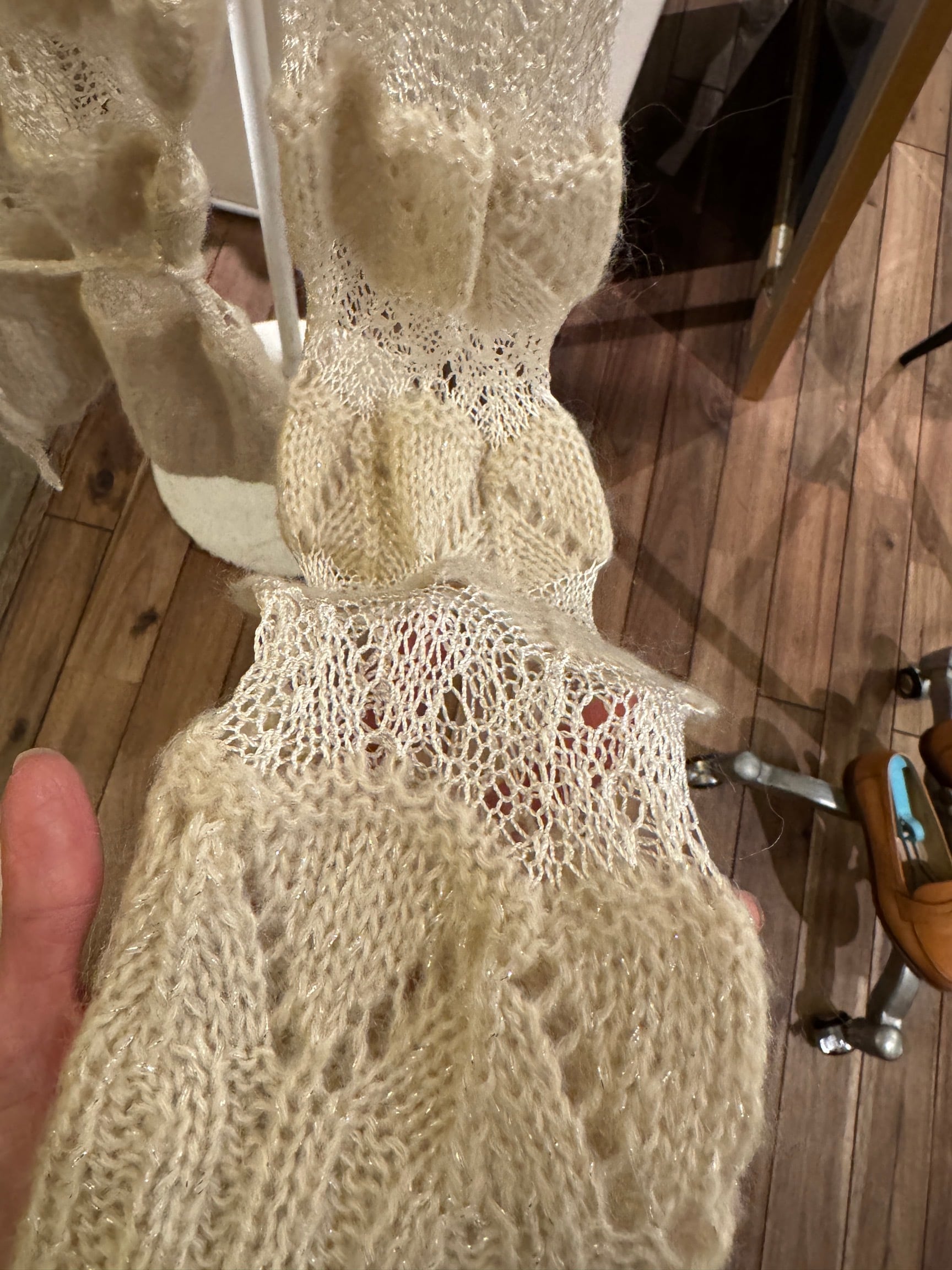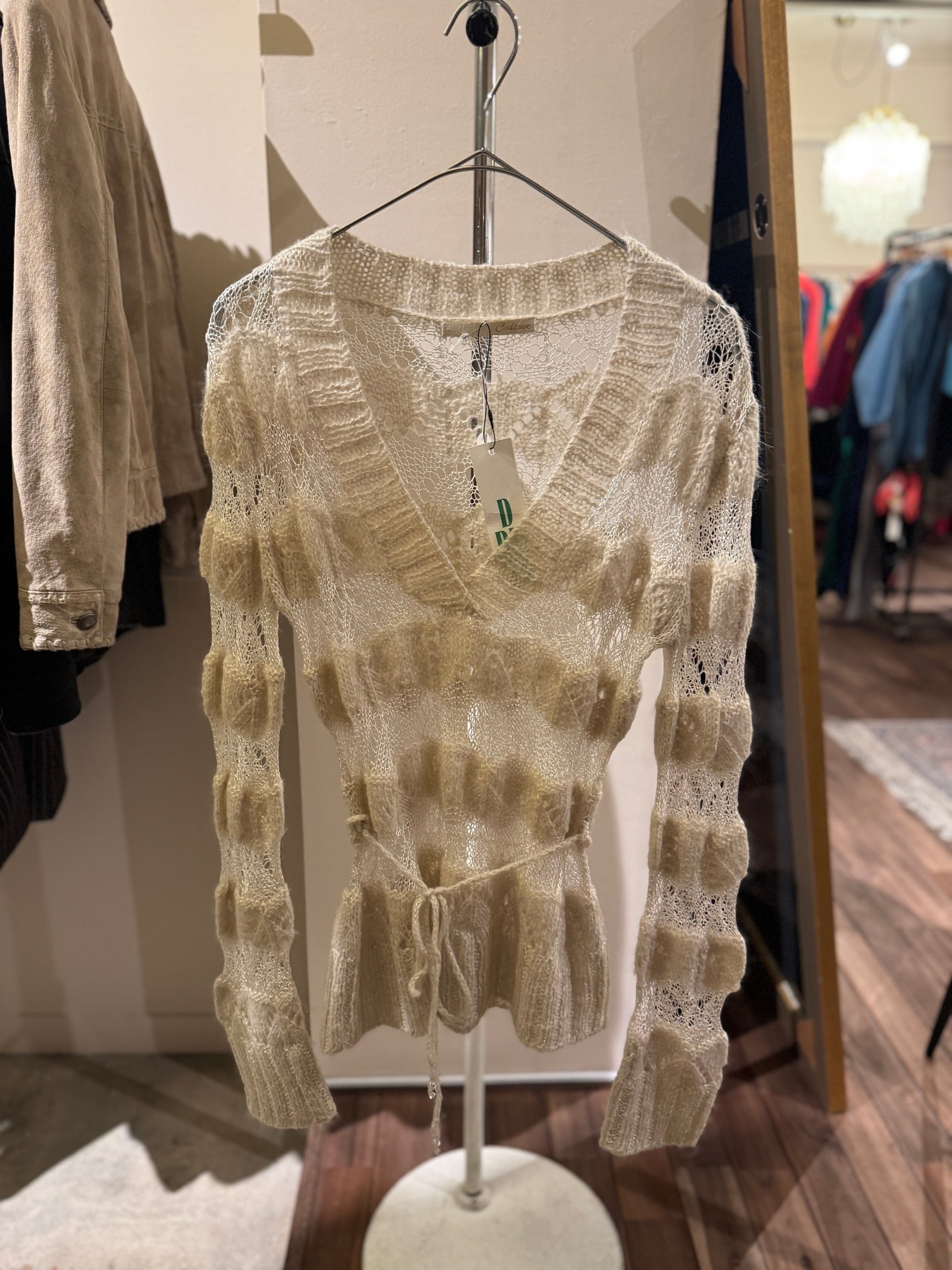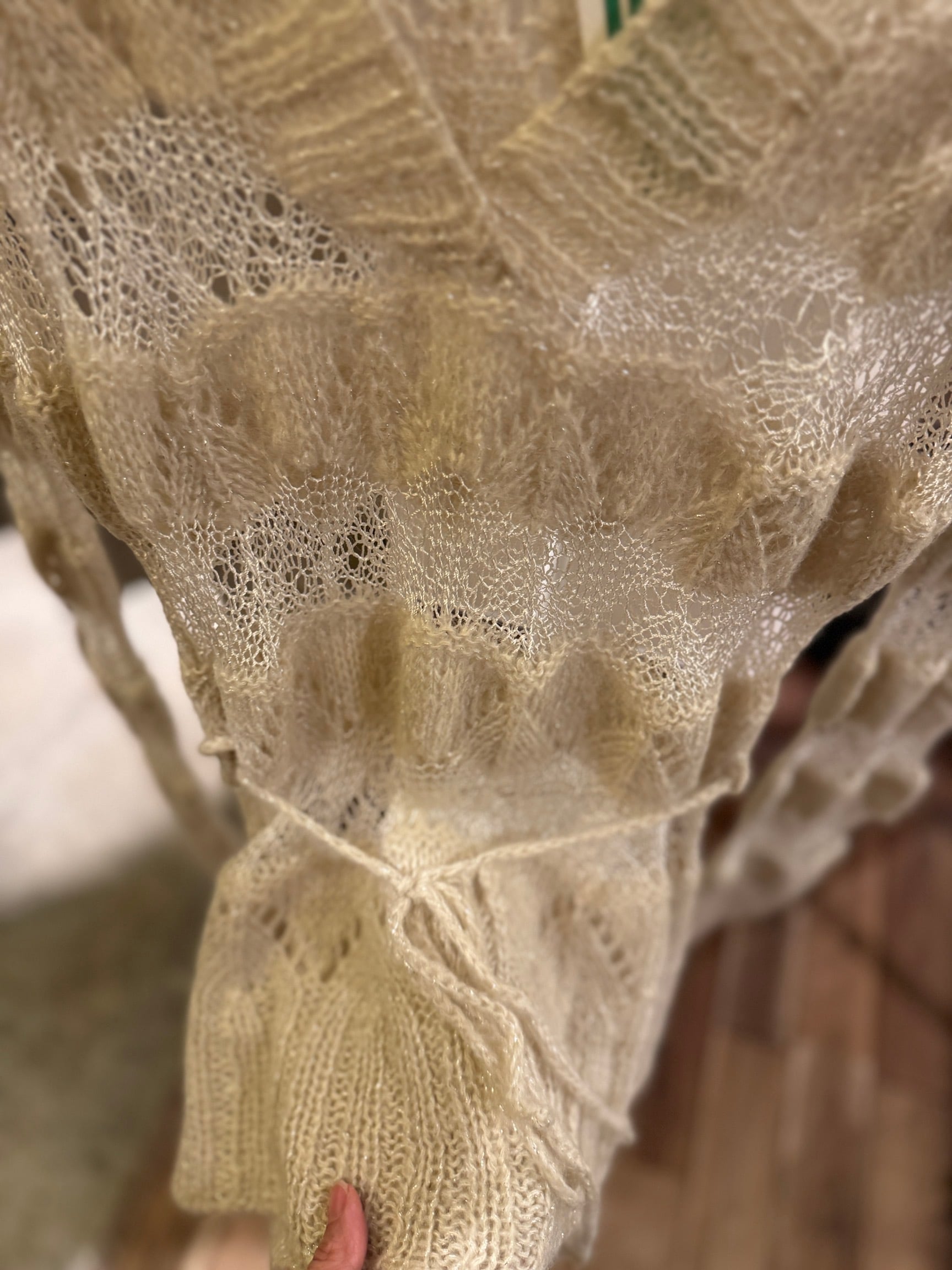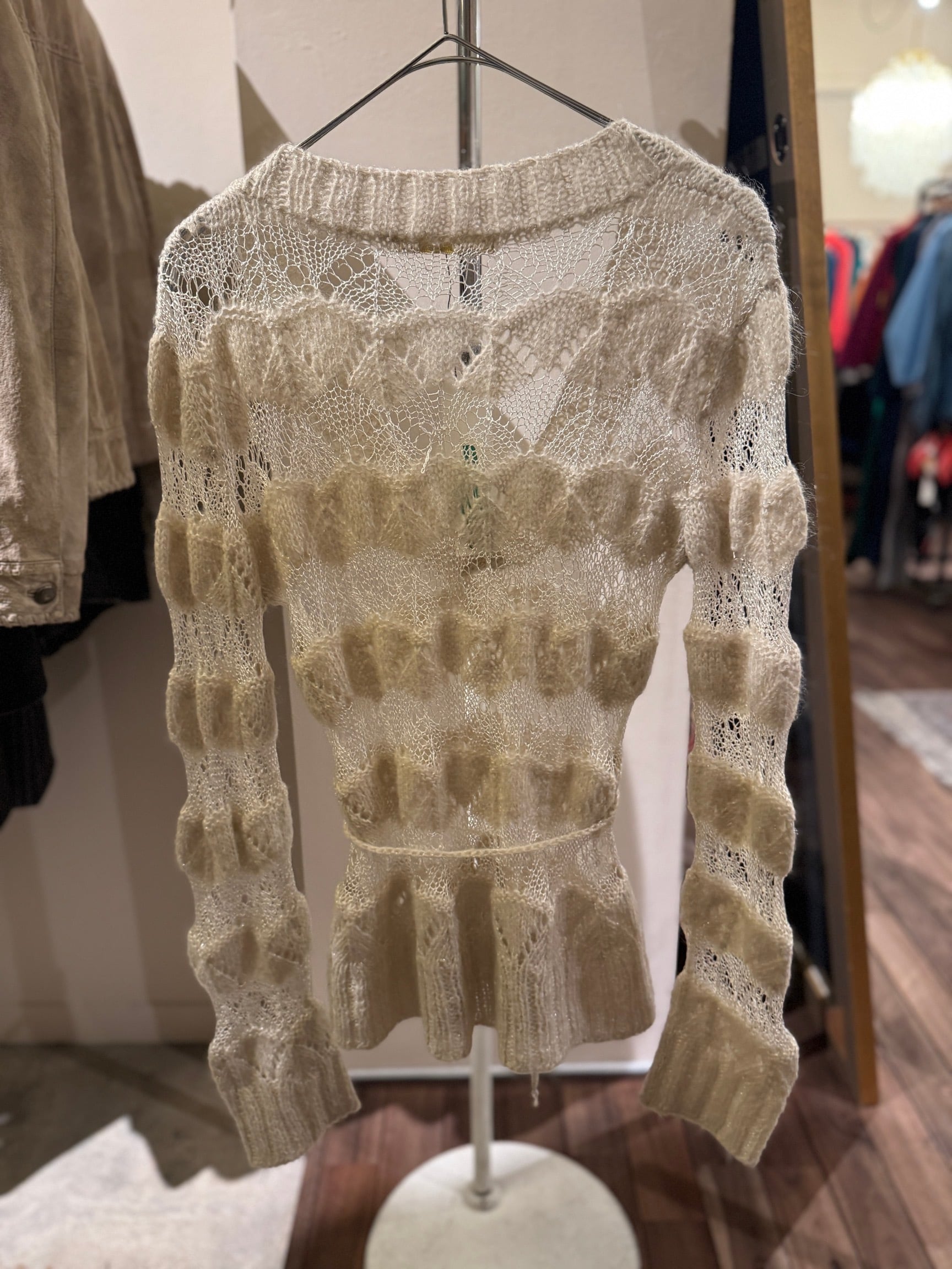 柔らかなニット素材が肌に心地よく、適度な厚みで温かさを保ちながらも透け感があるため軽やかな着心地。