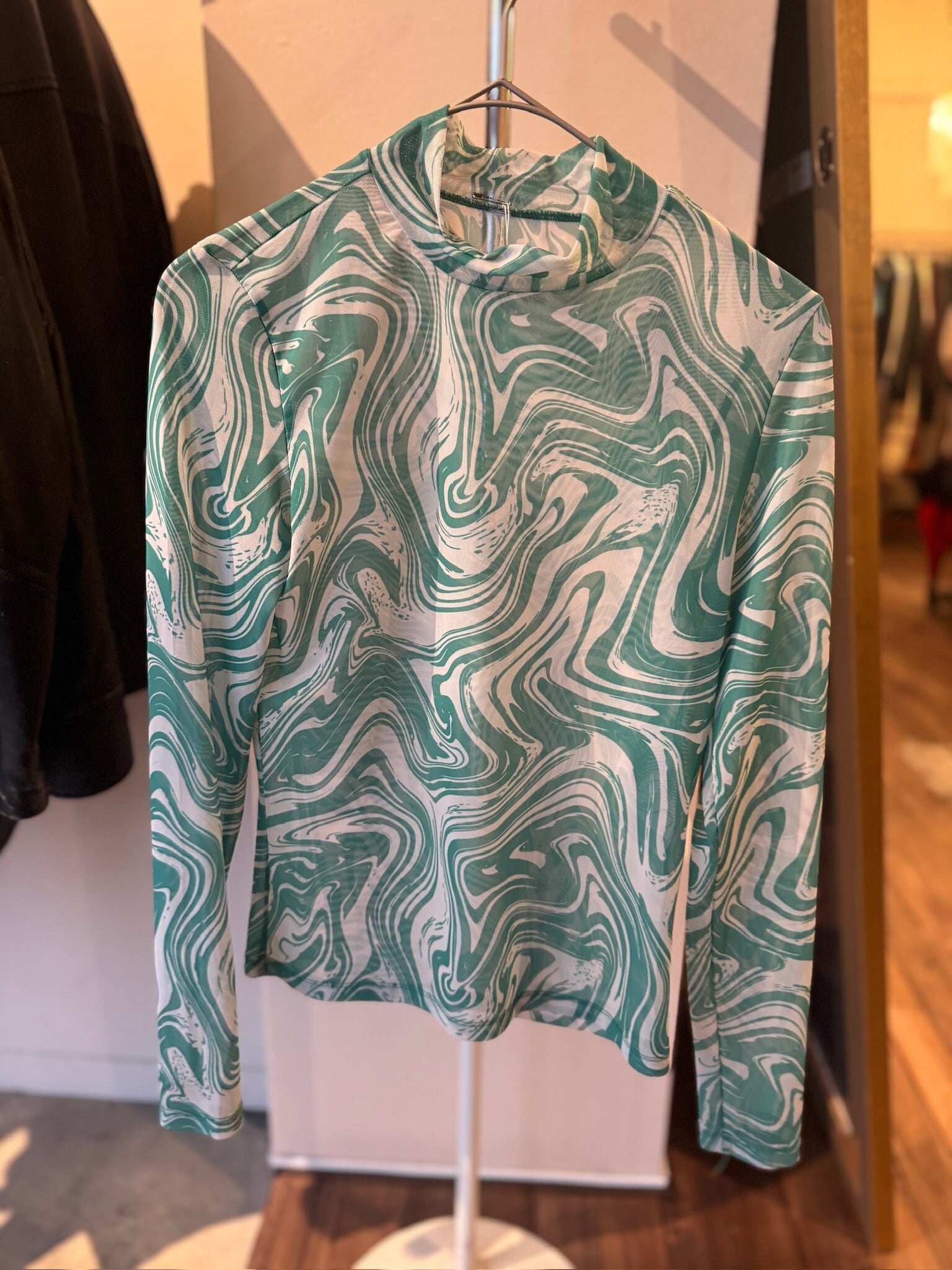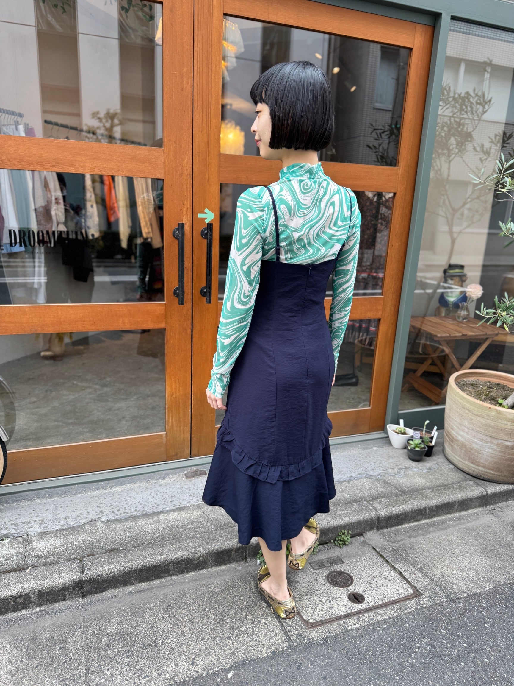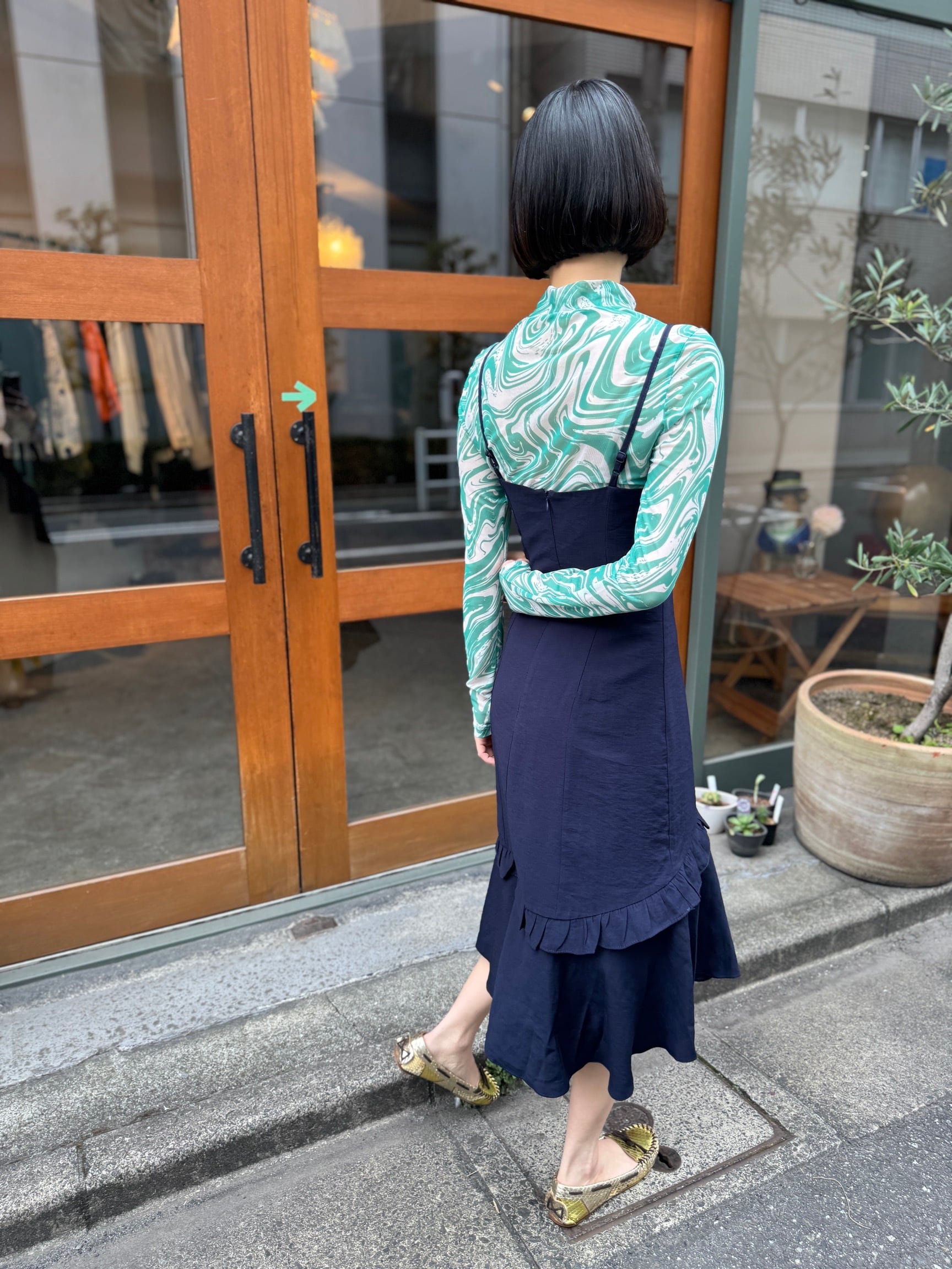 透明感のあるシアー素材が、独特のグリーンマーブル模様と相まって、存在感を放つ一着。