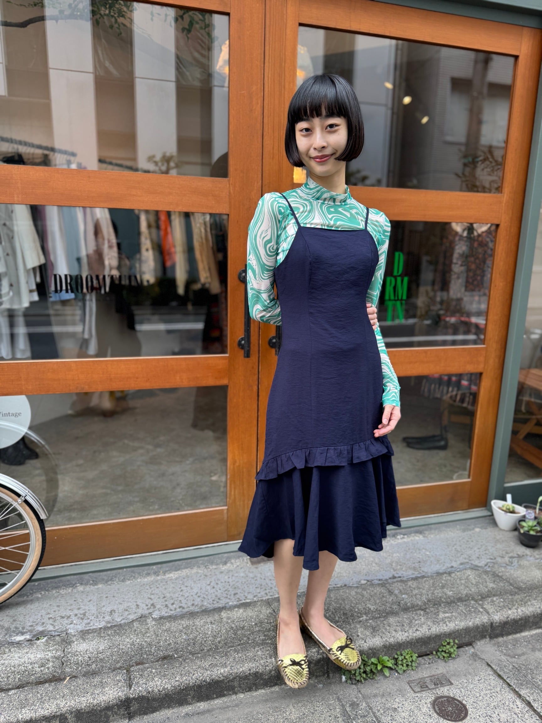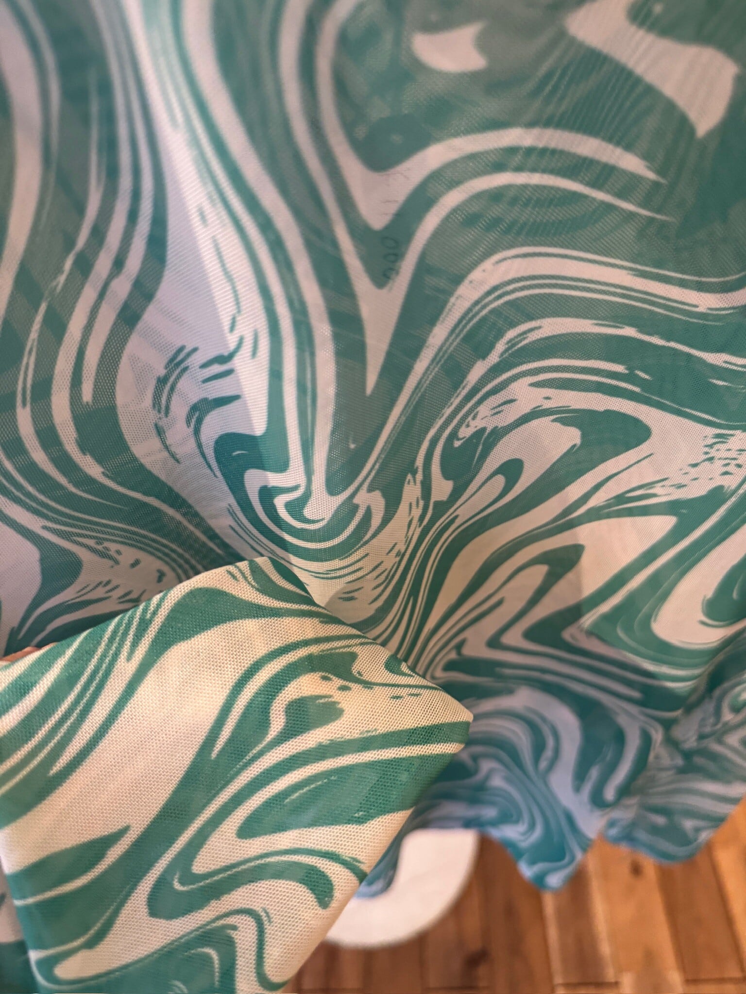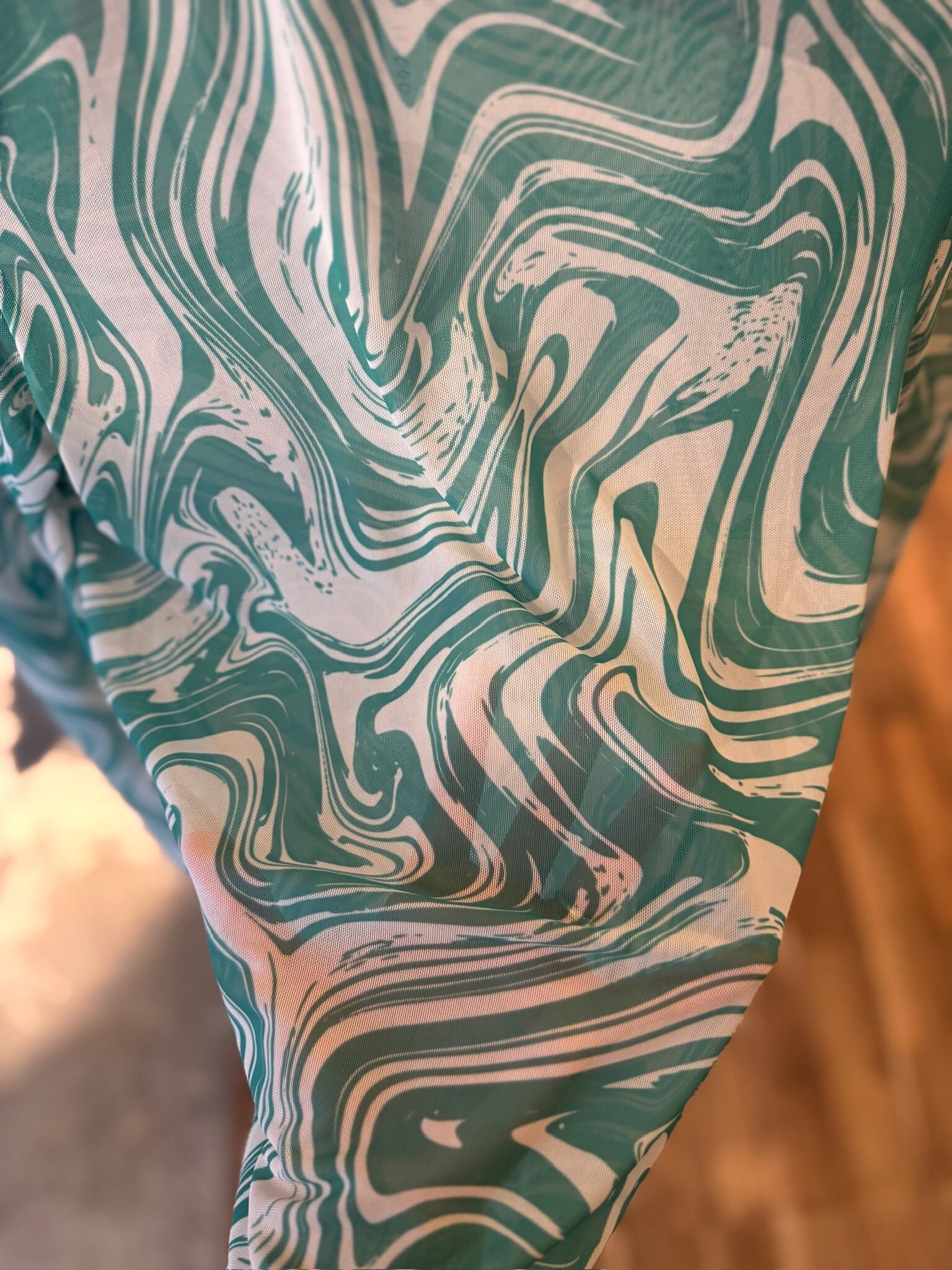 透明感のあるシアー素材が、独特のグリーンマーブル模様と相まって、存在感を放つ一着。