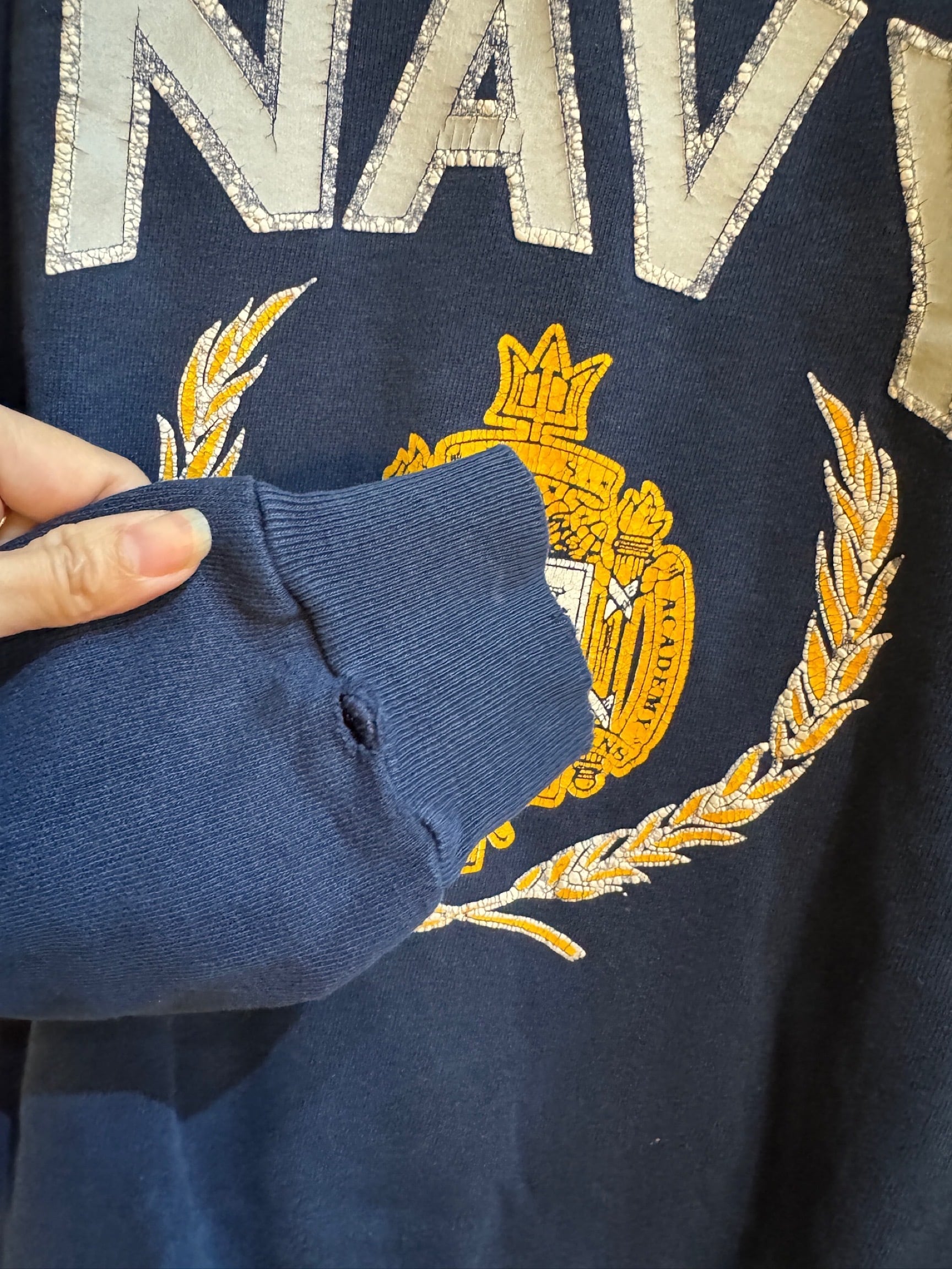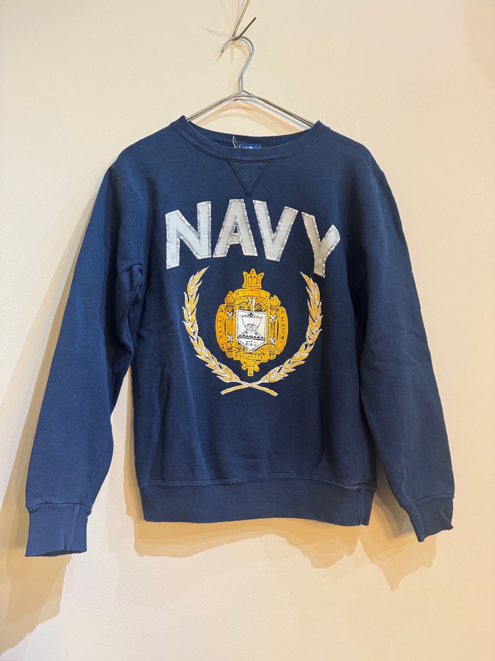 このアイテムは、80年代前期に製造されたChampionのスウェットで、米海軍兵学校の紋章がプリントされており、独特な風合いと絶妙な色合いが魅力的で、古き良きアメリカンヴィンテージを感じさせます。