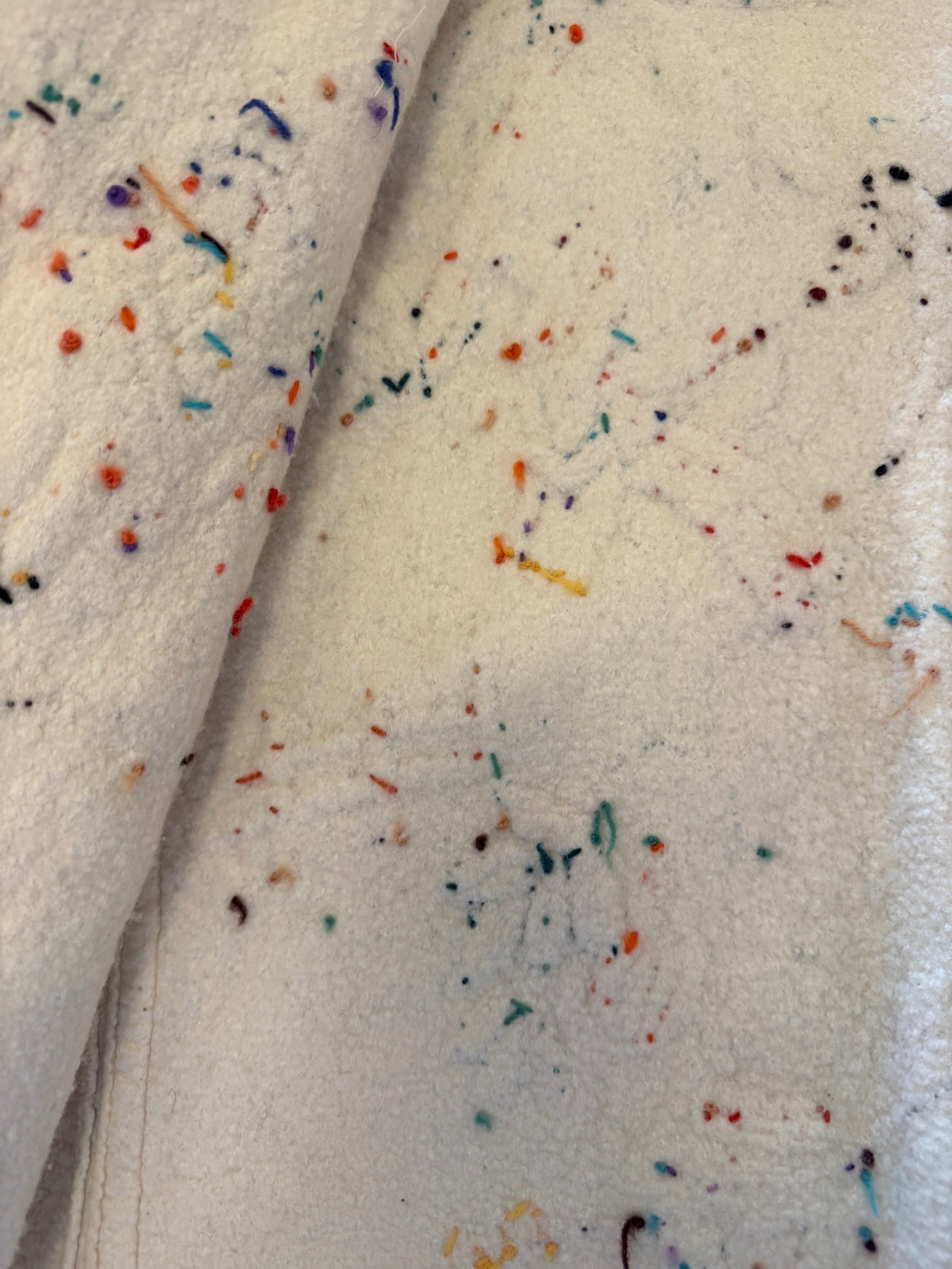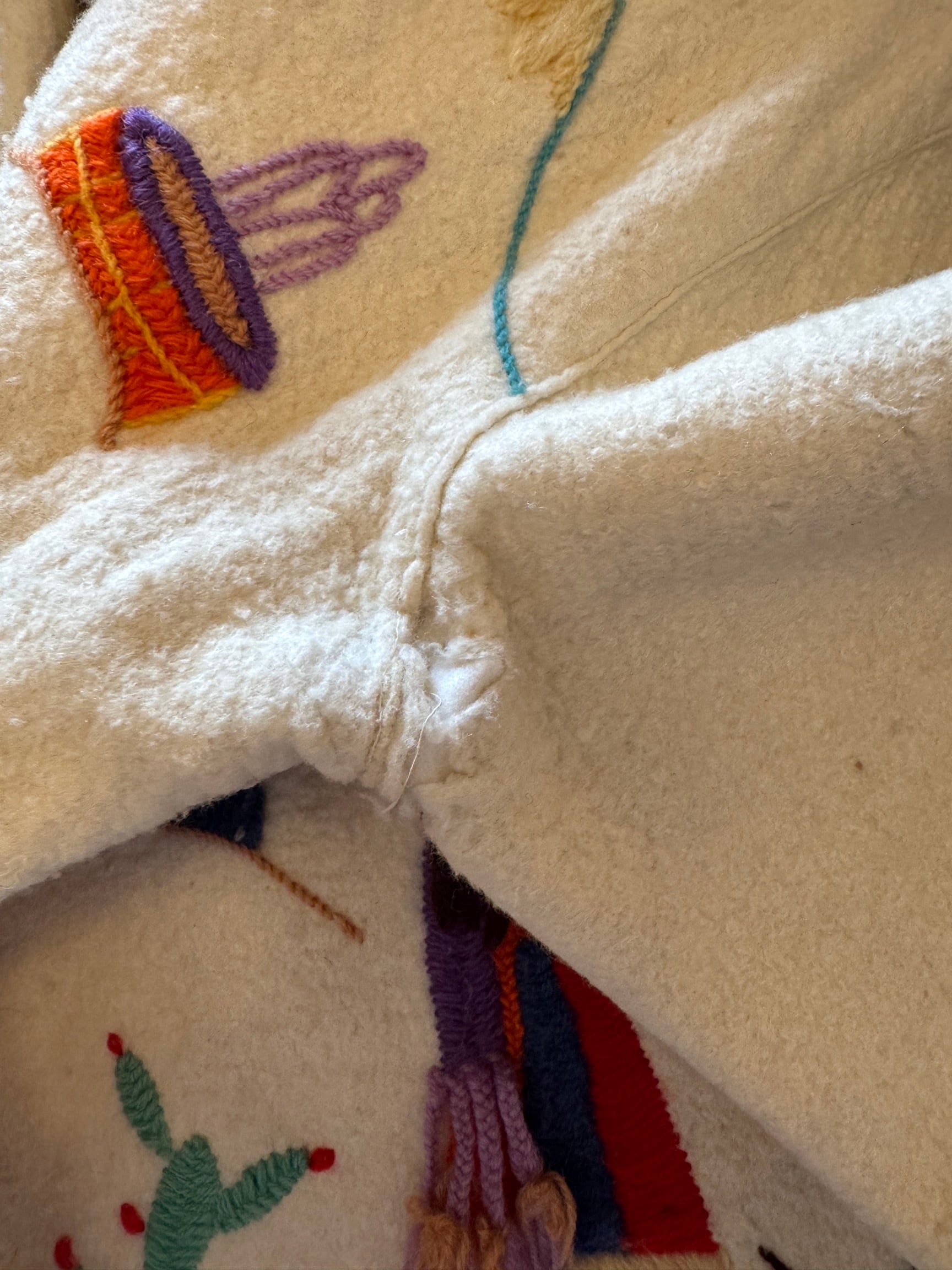 肉厚な生成りのウールフェルト生地をベースに、メキシコの穏やかな日常風景を象徴する「サボテン」「パームツリー」「ロバを引く農夫」などが、鮮やかな手刺繍によって多色使いで表現されています。