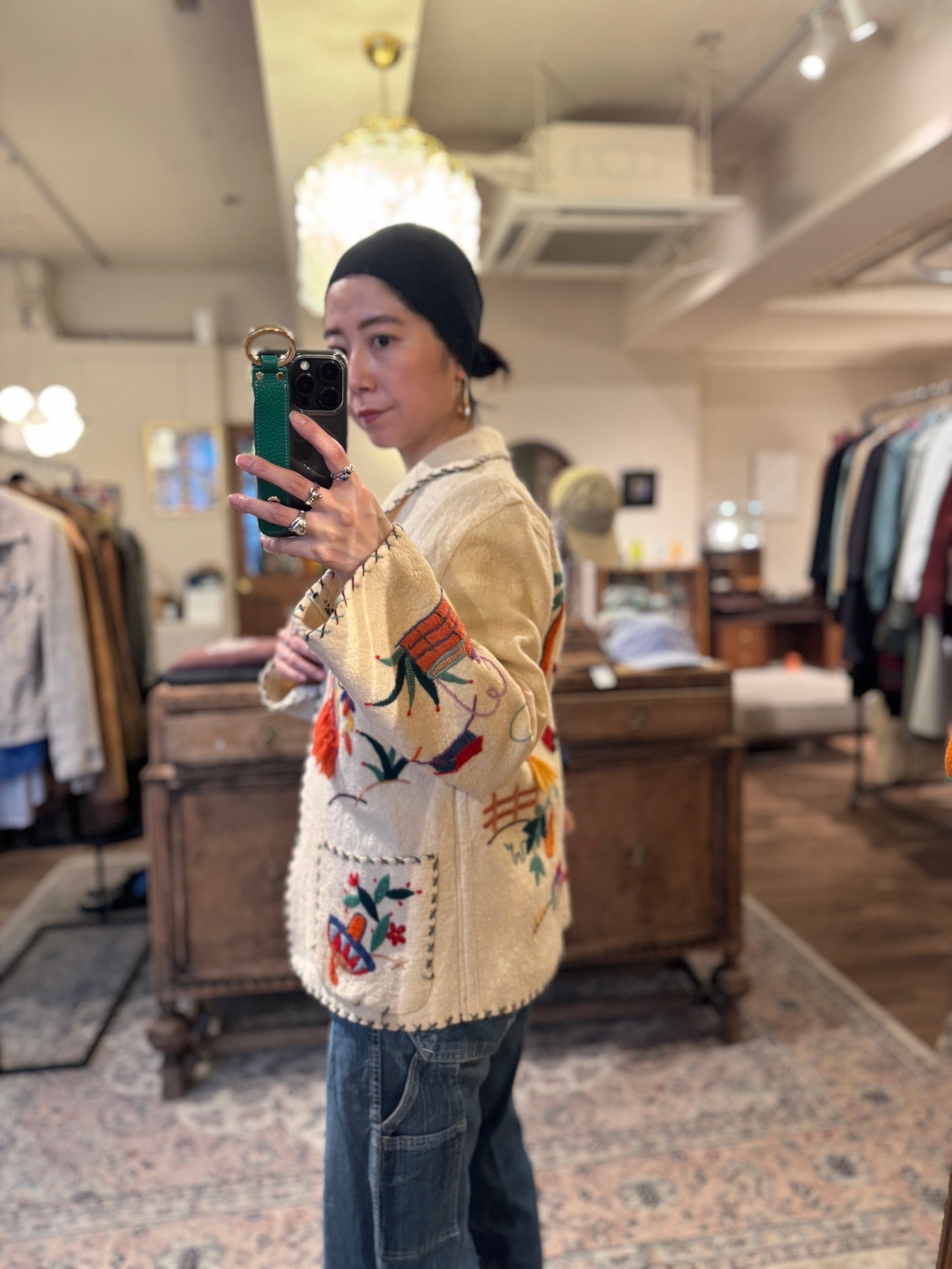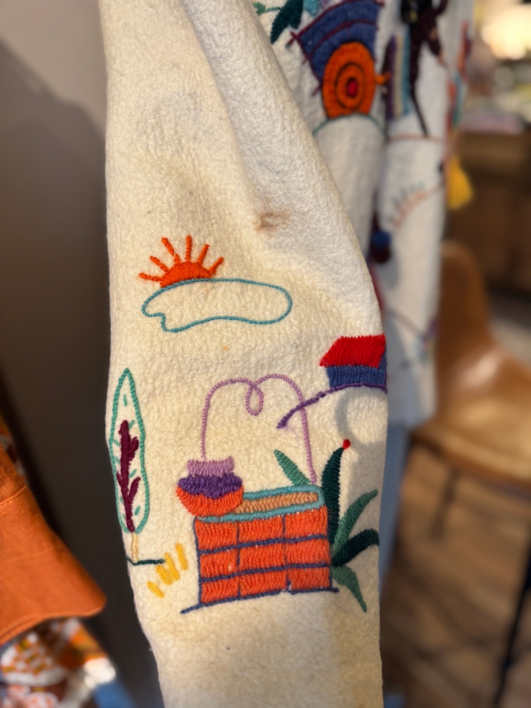フロント、バック、そして袖口に至るまで贅沢に施された刺繍は、一つ一つ表情が異なるハンドメイドならではの温かみが魅力。襟や裾にあしらわれたコントラストの効いたブランケットステッチが、全体のデザインを力強く引き締めています。
