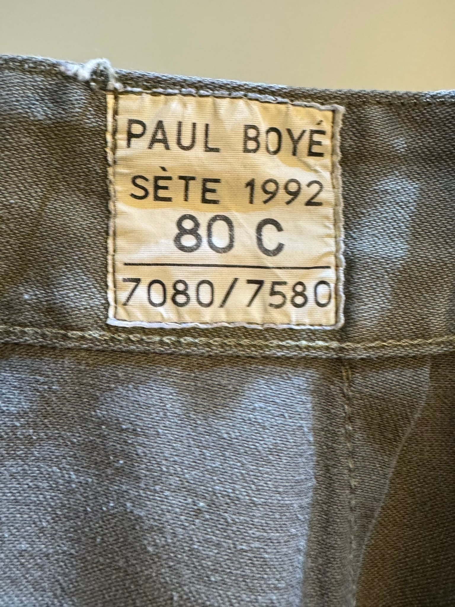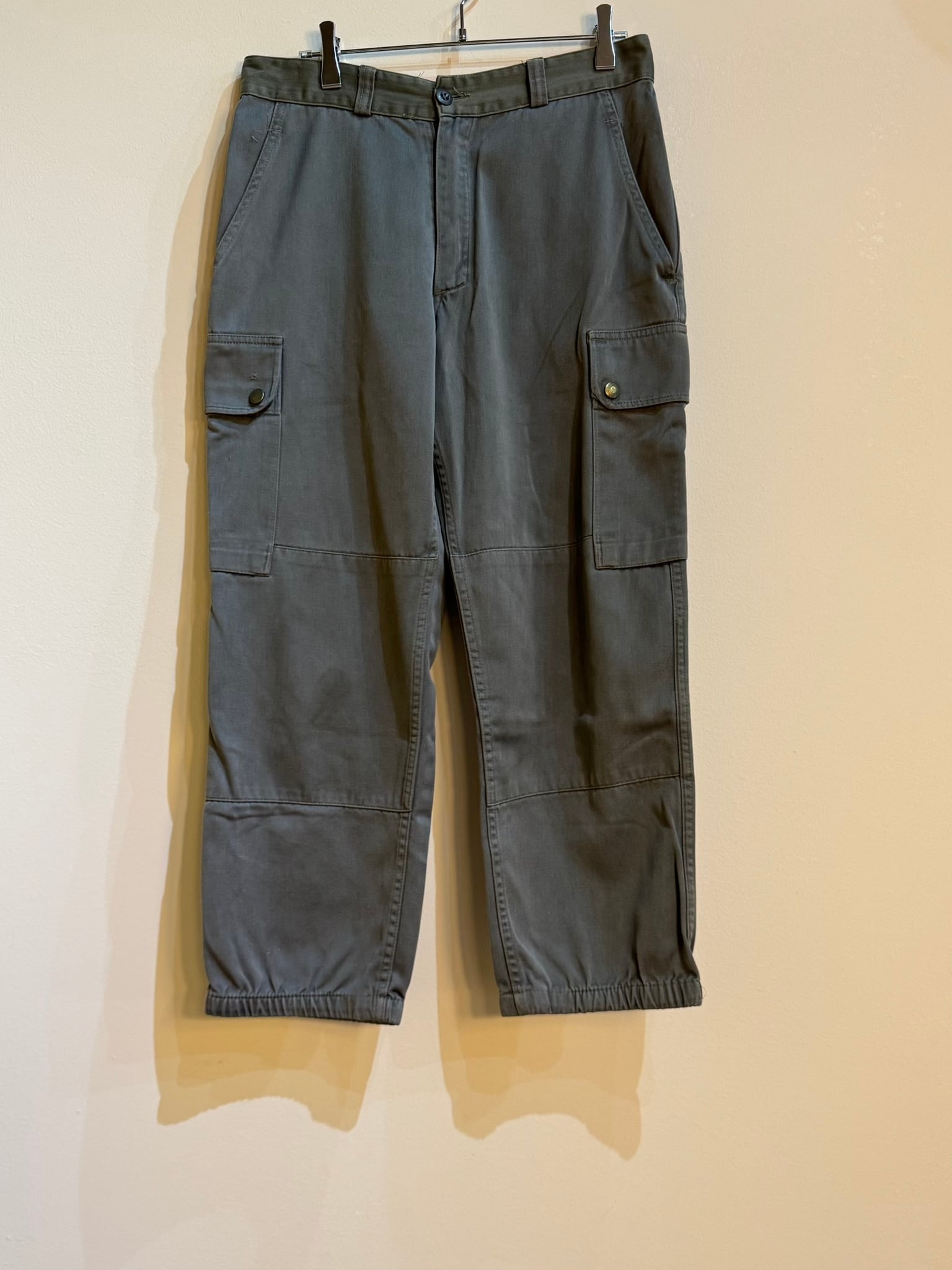 1992年製のPAUL BOYEフレンチミリタリーF2パンツは、ミリタリーのデザインを巧みに取り入れた一着です。独特な風合いが魅力的で、ヴィンテージならではの個体差もしっかりと感じられるアイテムとなっています。裾にはゴムが施され、キュッと絞られたシルエットがスタイリッシュな印象を与えます。このパンツはカジュアルなコーディネートにもぴったりで、あえて大きめのトップスやシャツと合わせることで、抜け感のあるスタイルに仕上げることができます。