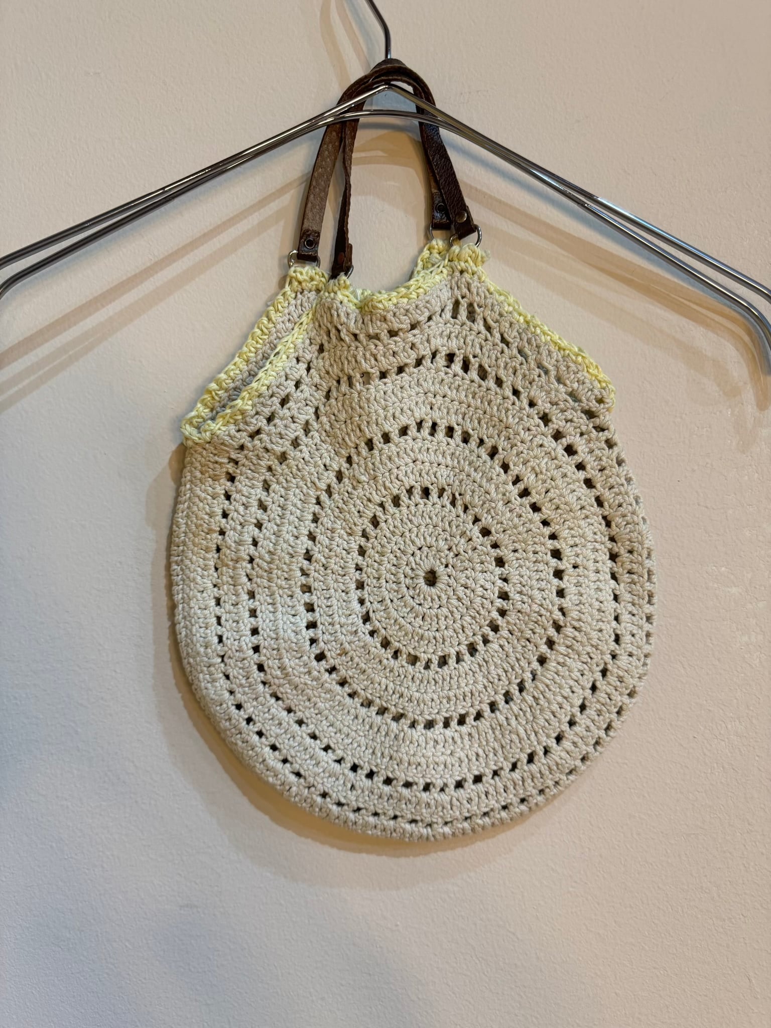 オフホワイトの糸をベースに、縁に配された柔らかなイエローがアクセント。細身のレザーハンドルが、ガーリーな手編みの質感にヴィンテージらしい「渋み」を添えています。