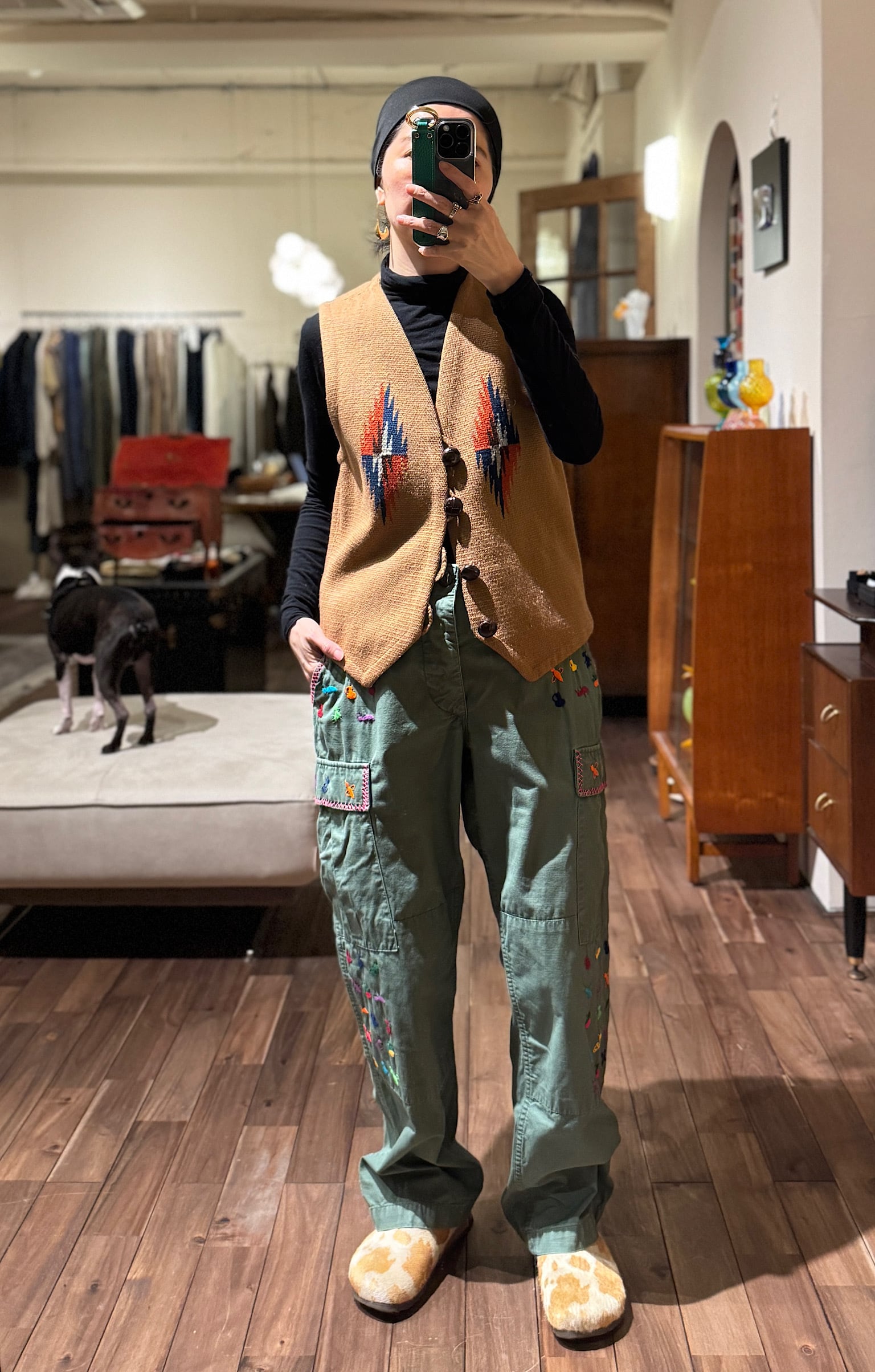 アーミーのパンツにメキシコ刺繍が施された1点ものです。
